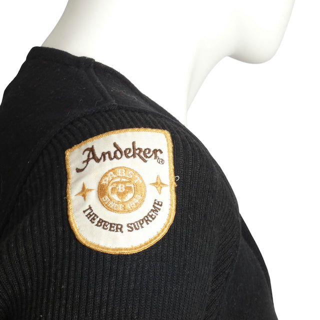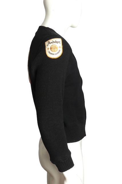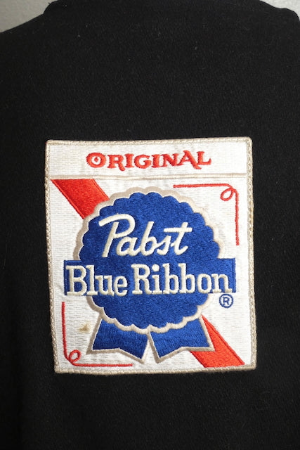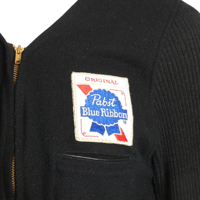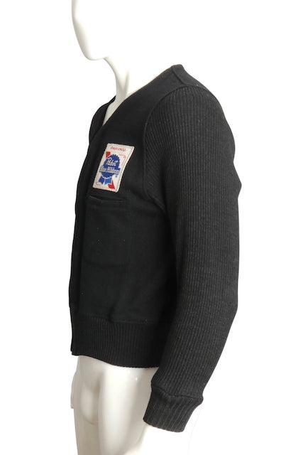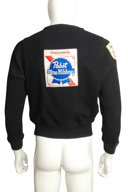 Description: Step back in time with this fabulous 1960s Pabst Blue Ribbon cardigan sweater! Crafted from black wool and knit, it features a zip-up front and a cozy knit waistband for that perfect snug fit. Long knit sleeves with matching cuffs keep the style seamless. Eye-catching Pabst Blue Ribbon patches decorate the chest, sleeve, and boldly across the back—making this size jacket a vintage treasure with plenty of personality!