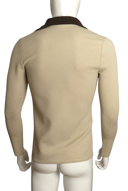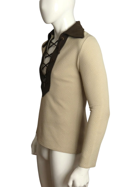 Description: Let your chest breathe in this fabulous 1970s long-sleeve polyester knit shirt featuring a bold chevron design. The brown contrasting wide collar and placket add vintage flair, while large brown laces threaded through grommets create a playful lace-up front that’s sure to turn heads. Embrace your retro style with confident ease!