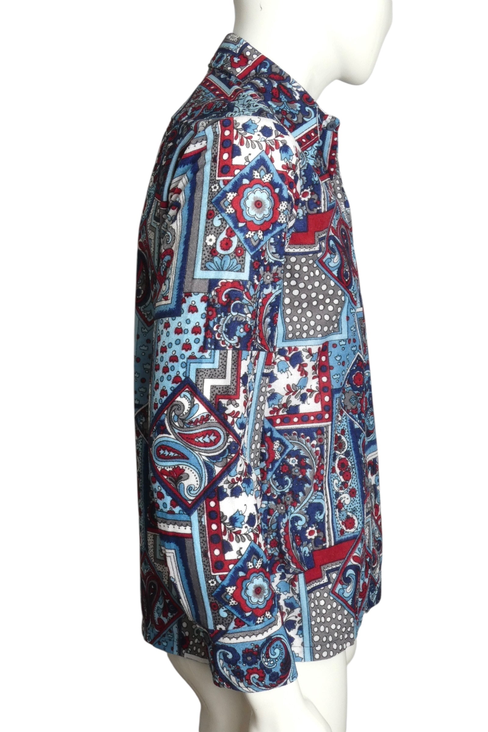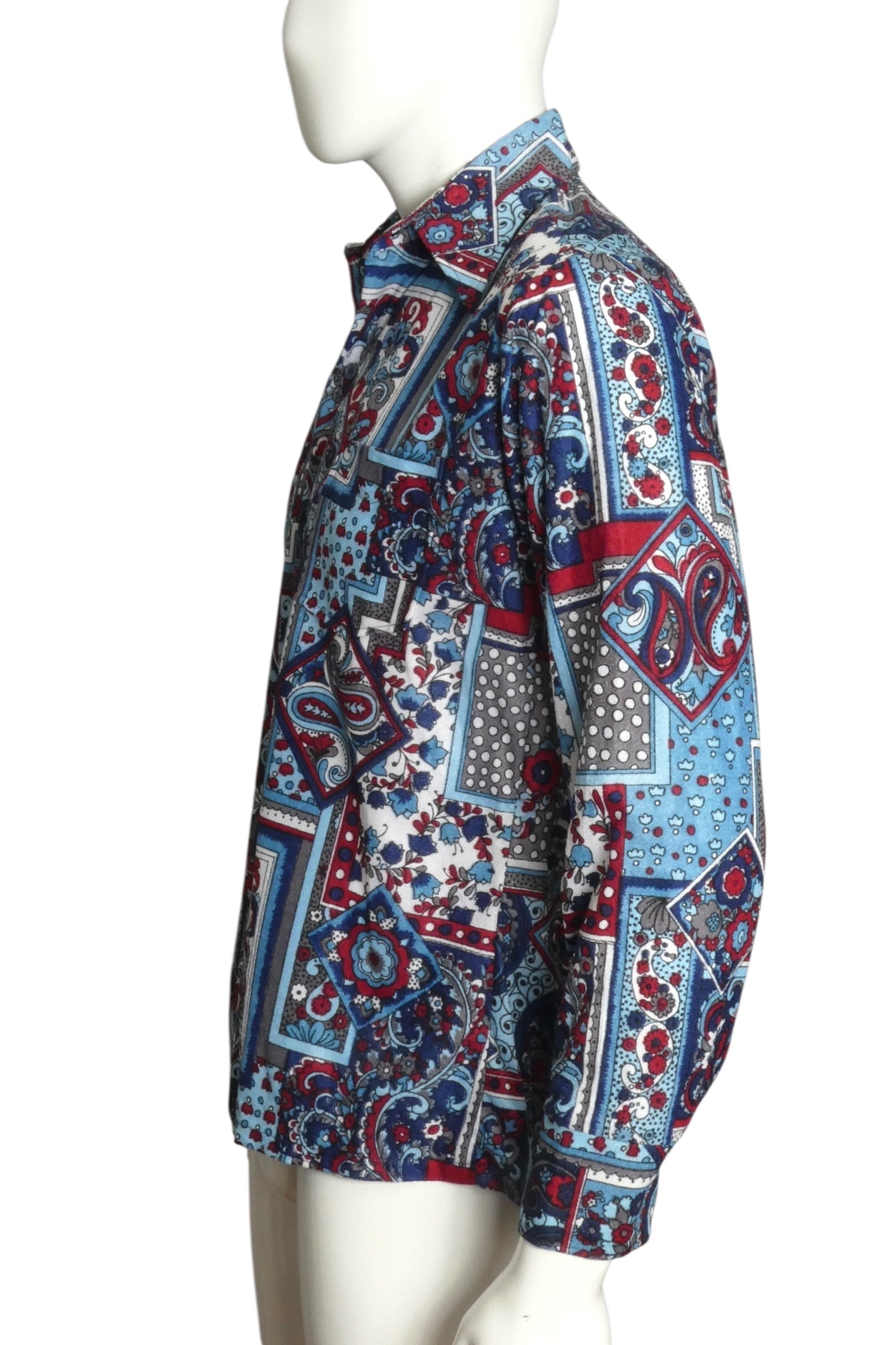 Description: This vintage knit shirt once belonged to Hugh Hefner, the iconic Playboy founder. It was featured in the 2018 Julien's Hugh Hefner auction. This vibrant nylon shirt features a bold wide collar and buttons up the front. It’s got a handy patch pocket on the chest and long sleeves finished with buttoned cuffs for the perfect vibe.