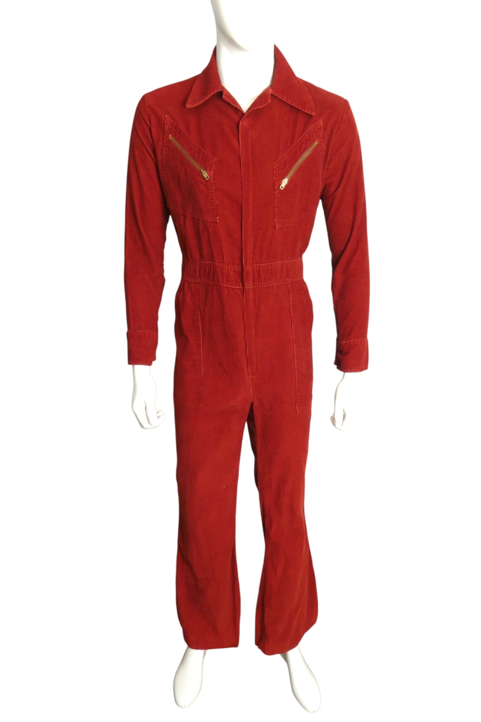 Description: Celebrate retro style with this fabulous 1970s rust corduroy jumpsuit! It features a spread collar and a hidden front zipper for a sleek look. Zip-up diagonal patch pockets decorate the chest, while a wide waistband yoke and giant patch pockets grace the hips. The wide-leg pants add extra flair, and the long sleeves finish with buttoned cuffs for a perfect vintage touch.