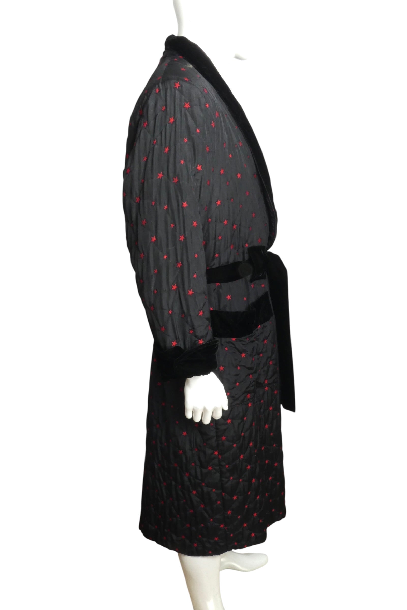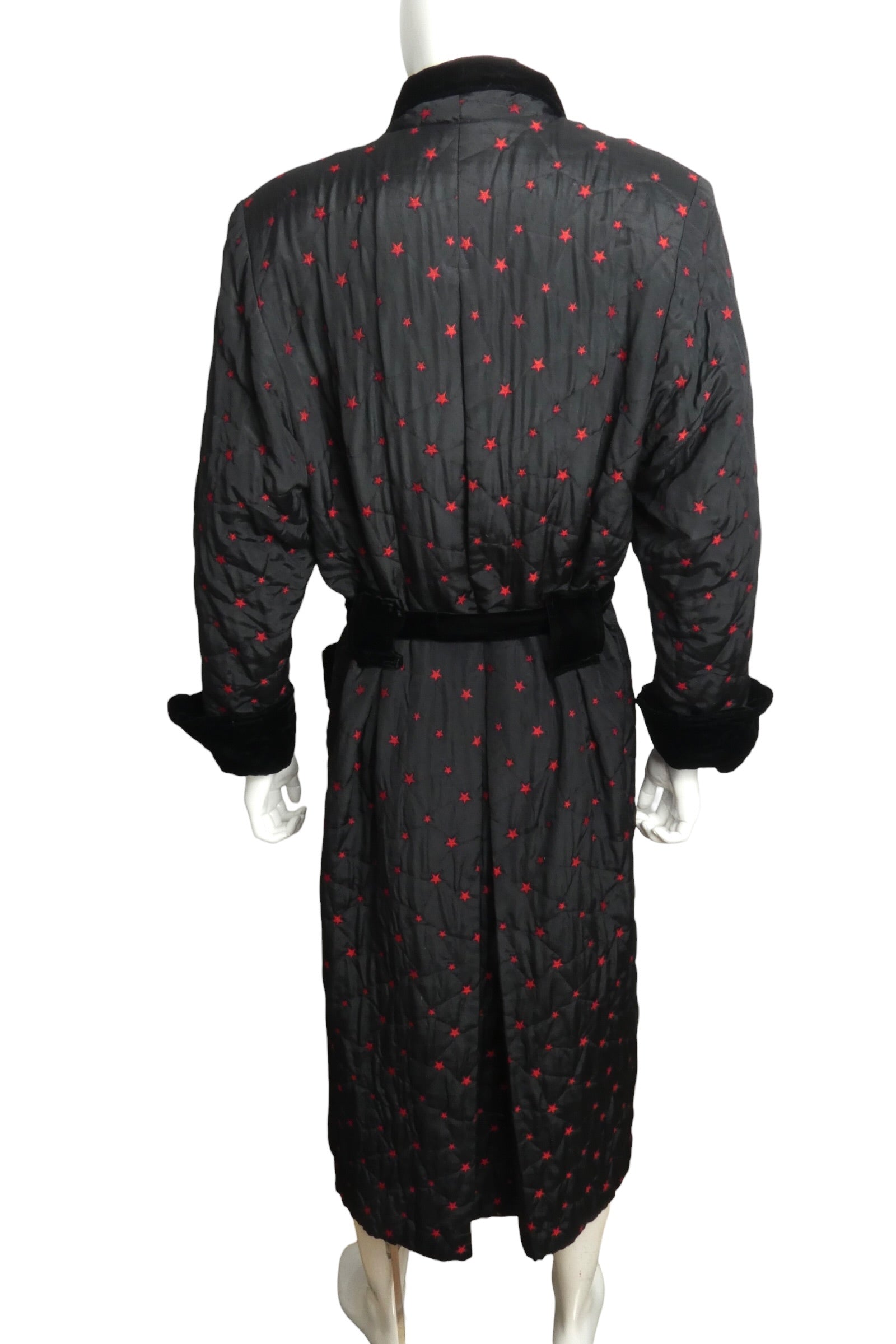 Description: Revisit the fabulous '80s with this stunning brocade dressing robe, featuring a bold black and red star pattern that's sure to turn heads. The luxurious black velvet trim adds a touch of elegance to the lapels, cuffs, and sash tie, while the convenient patch pockets offer a practical twist. Perfect for lounging in style or making a statement at your next gathering, this robe combines comfort and flair effortlessly. Embrace your inner diva and elevate your wardrobe with this eye-catching piece!