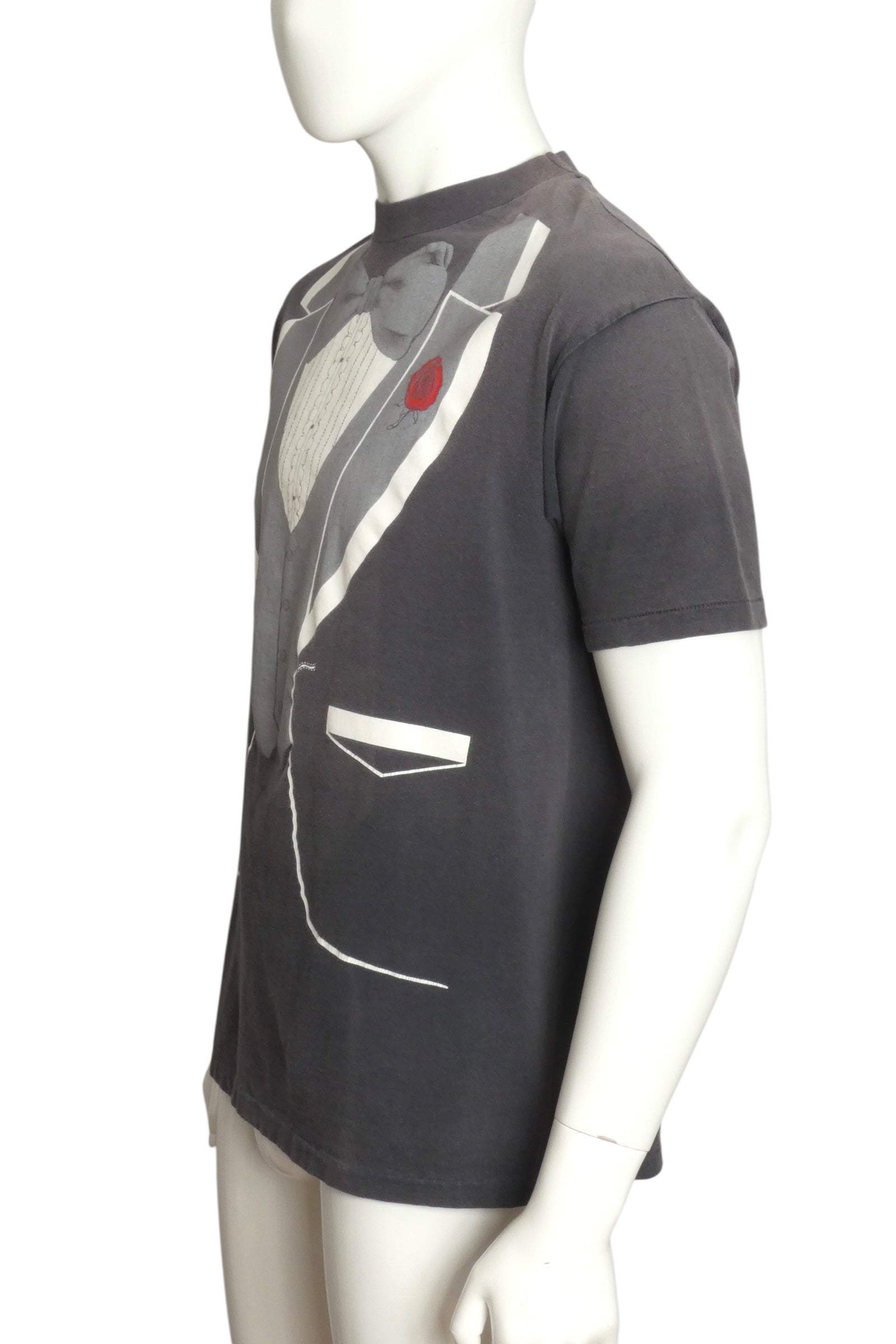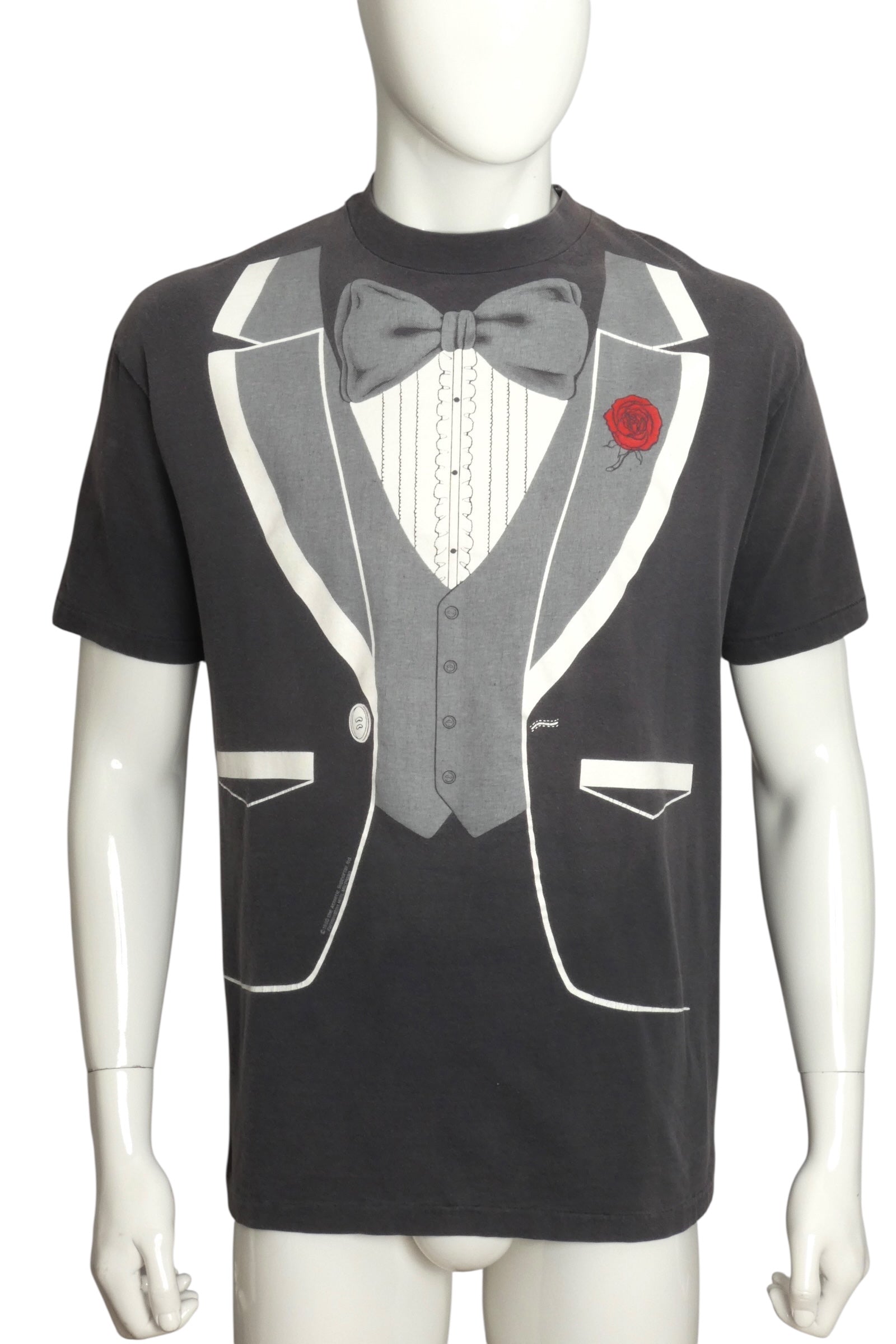 Description: Dated 1980 is this wonderful cotton t-shirt with a tuxedo printed front. The t-shirt and versions of it were used in many movies of the 1980s. The movie pictured here is from "You Can't Buy Me Love" featuring Patrick Dempsey.