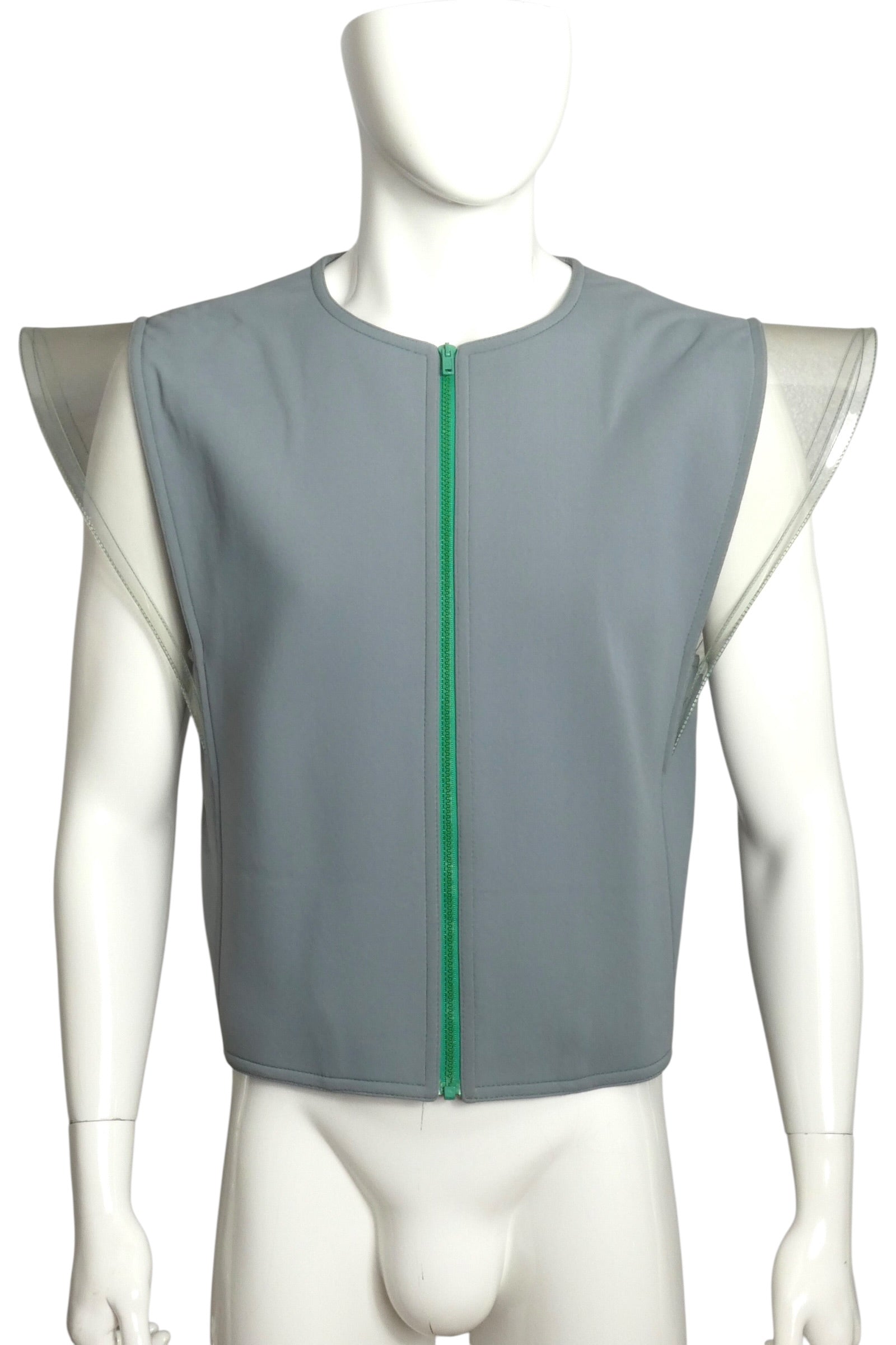 Description: A striking 1993 Pierre Cardin archival piece featuring innovative neoprene and plastic construction in blue, green, and clear tones. This runway-caliber vest showcases translucent shoulder panels and a full-length green zipper, lined in acetate for refined finishing. Authenticated with the "Pierre Cardin Heritage" label, this rare collectible represents a pivotal moment in fashion history when Cardin's ready-to-wear presentations rivaled couture craftsmanship.