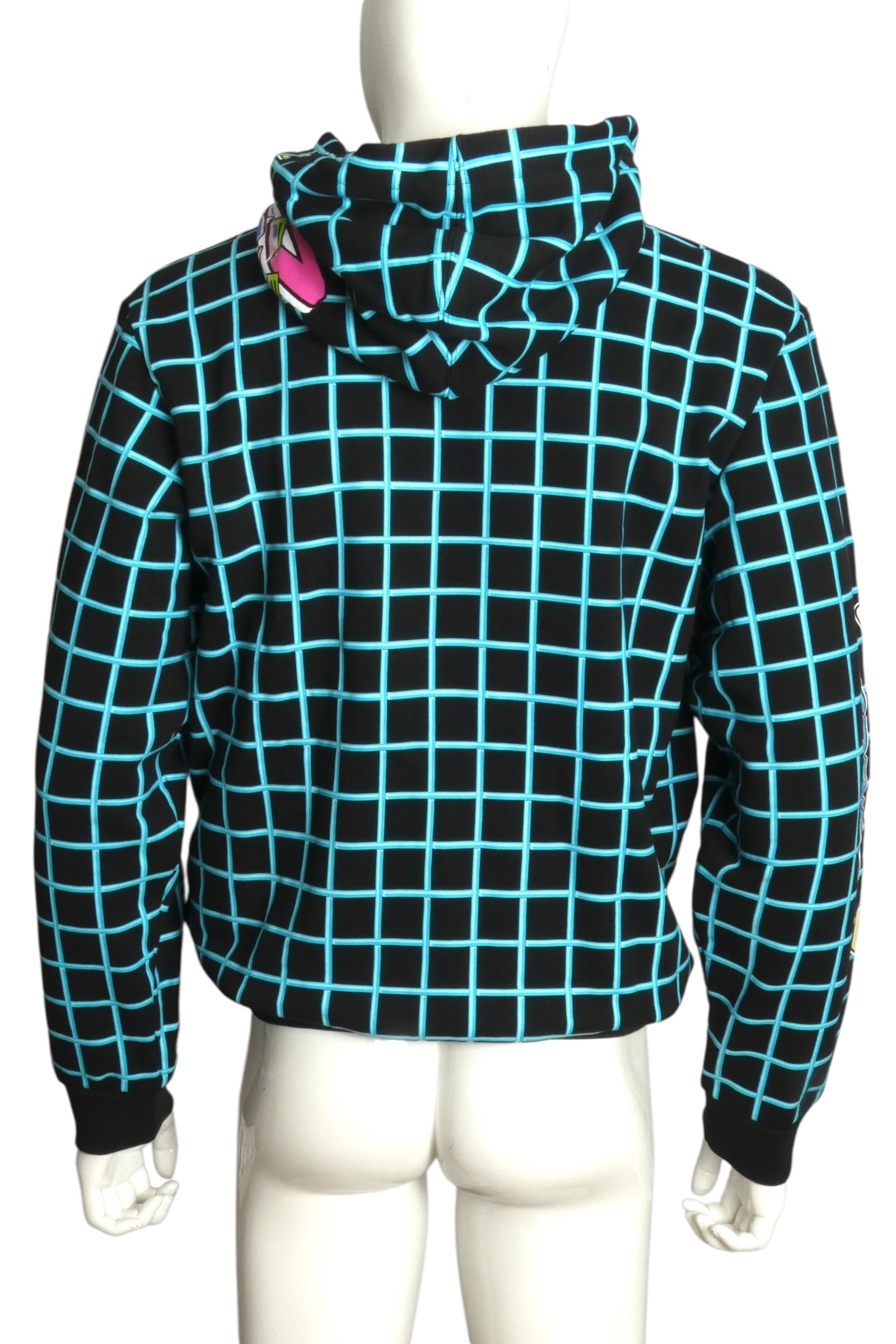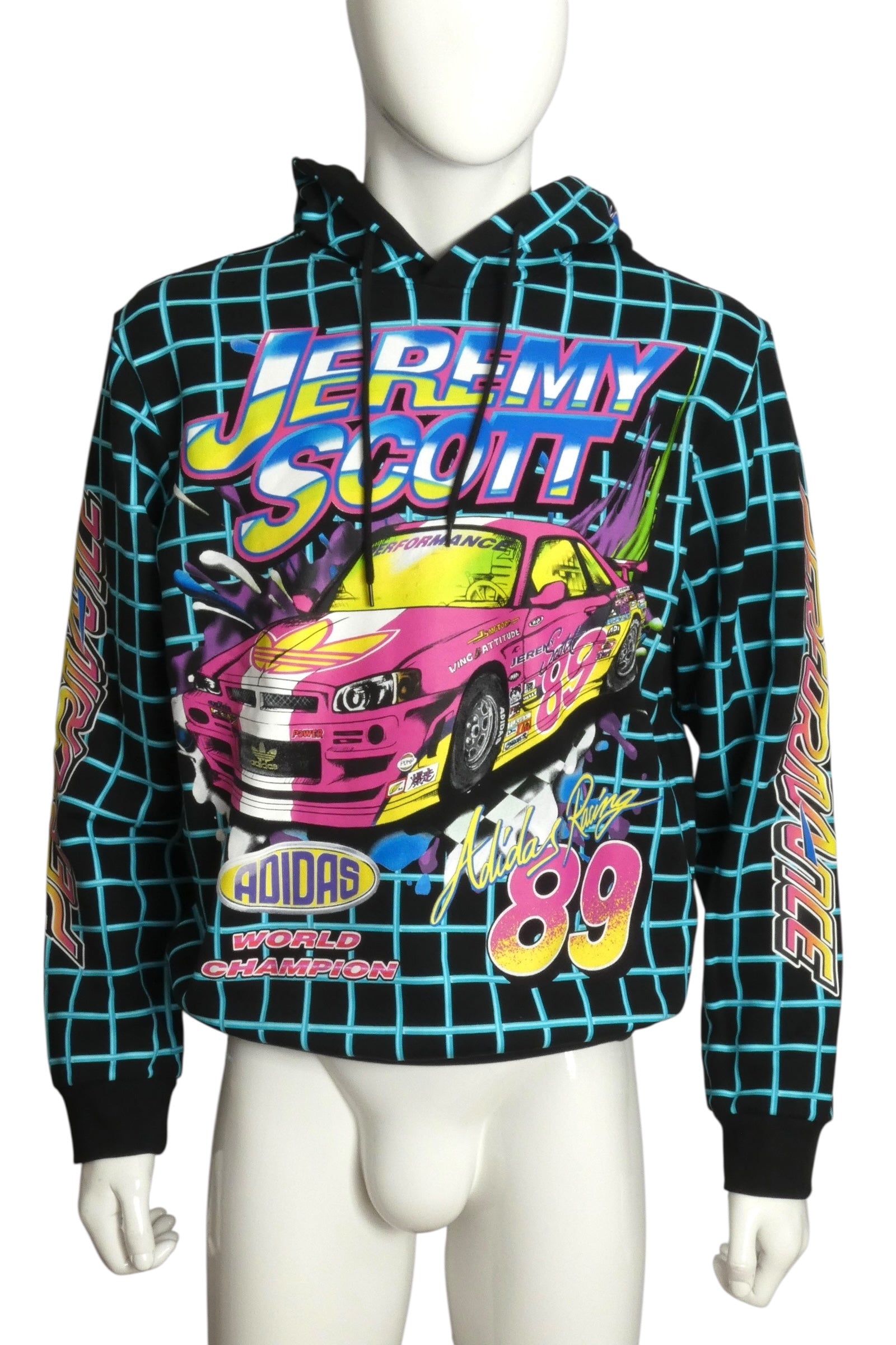 Description: The Jeremy Scott Adidas Racing hoodie showcases a striking graphic design that covers the full front, layered over an electric blue grid pattern, all made from black cotton. This item is brand new and includes its original tags.