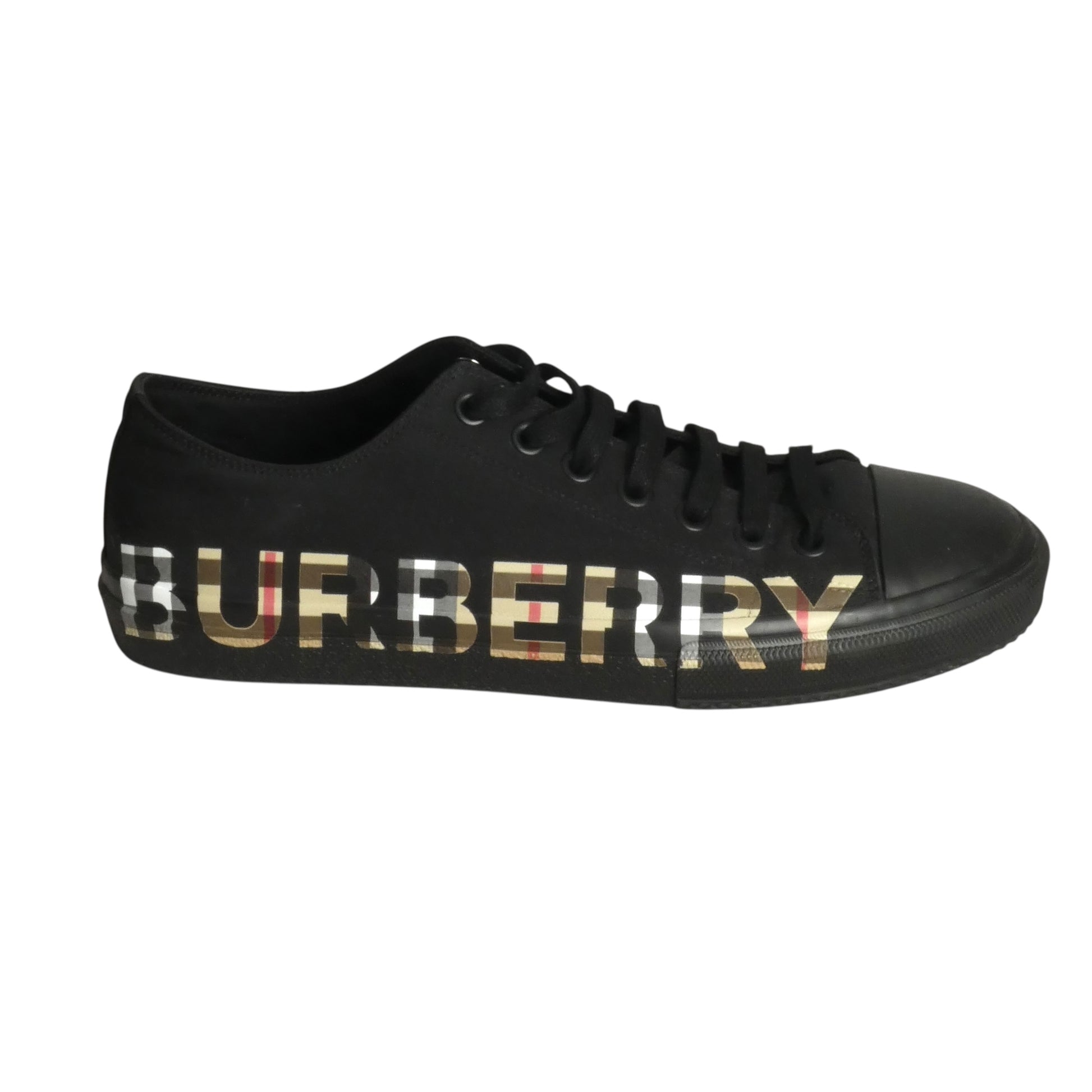 Description: Burberry’s Larkhall sneaker usually shows off a two-tone logo, but this pair keeps it sleek and all-black—from the canvas upper and rubber toe cap to the foxing tape. The branding gets a stylish twist with the iconic Archive check, adding a subtle nod to the fashion house. Featuring canvas uppers, leather lining, and a rubber outsole, these kicks also come with their original box for a complete package.
