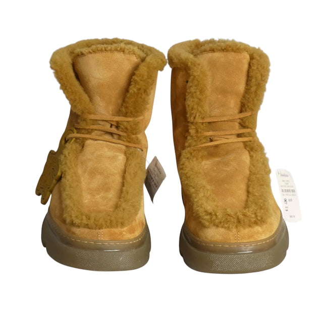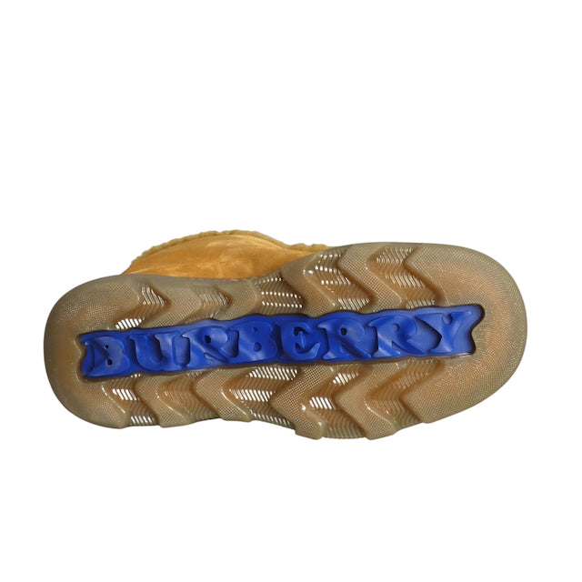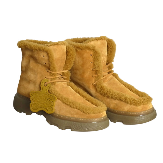 Description: Step into cozy luxury with these Burberry brown shearling suede boots! Crafted from soft calfskin suede, they hug your feet with a plush shearling lining and stylish moc toe trim. The foldover collar and rubberized logo tag add playful charm, while the lugged rubber sole keeps you steady on any winter adventure. Delivered in their original box with dust bags, these boots make winter wonderland walks a chic and comfy affair. Treat your feet to warmth and style — the ultimate cold-weather companion awaits!