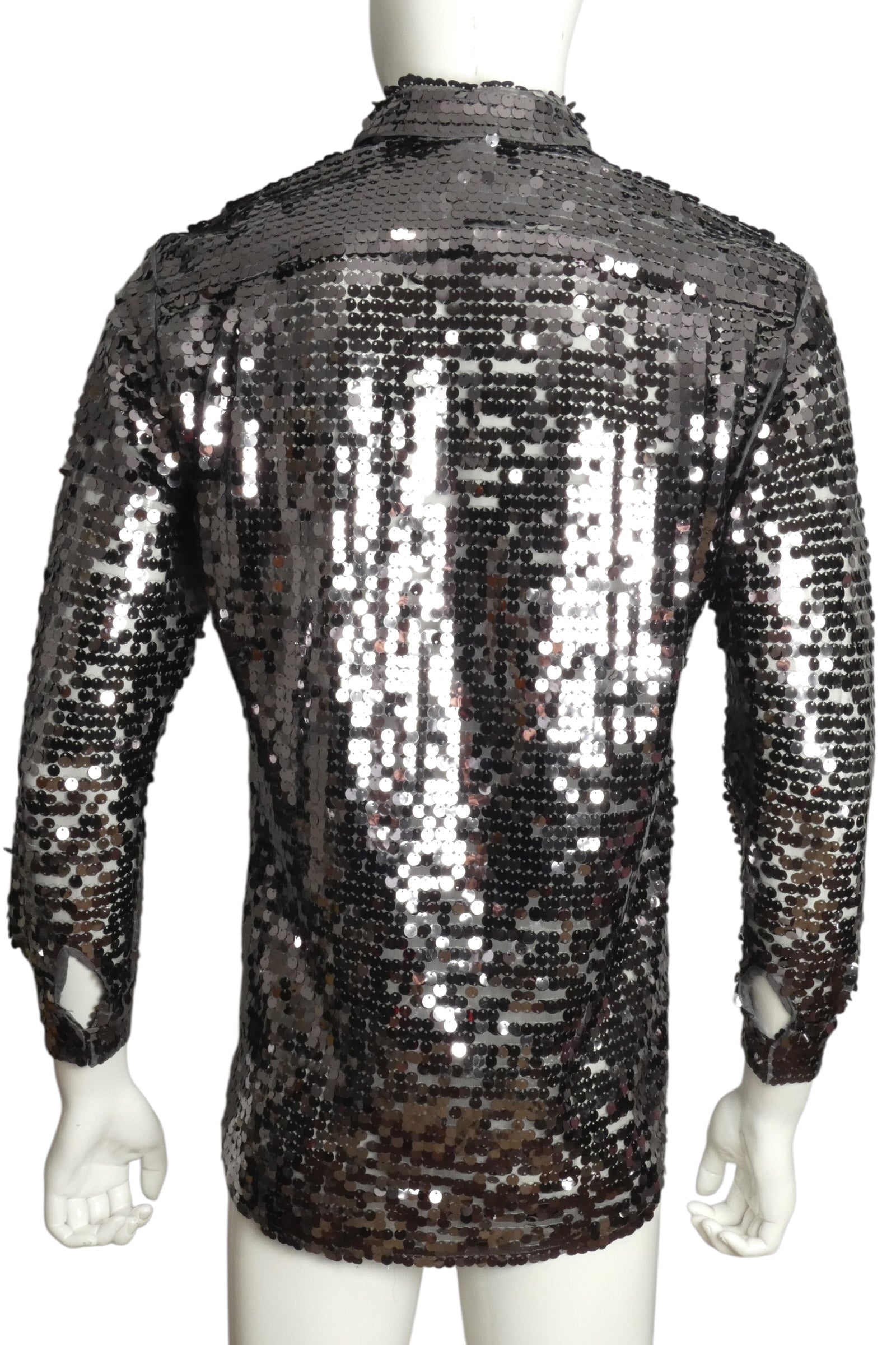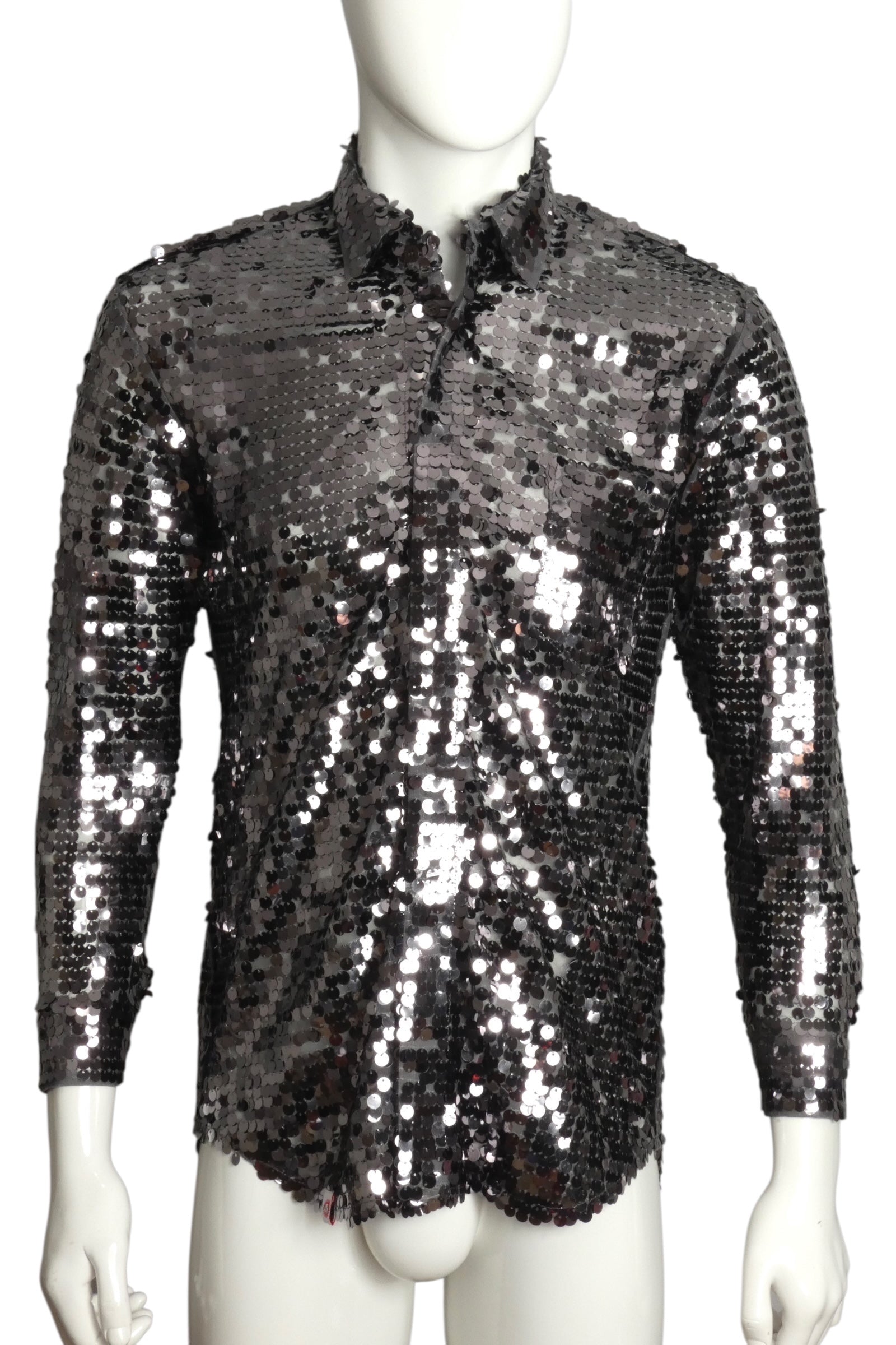 Description: Step into the spotlight with this playful silver sequin shirt from Charles Jeffrey Loverboy. Designed with a grey net base shimmering with sparkling silver pailettes, it brings the perfect sparkle for your nightlife adventures. Featuring a classic spread collar and sleek button-down front, this size small shirt combines bold fun with timeless style. Get ready to shine and turn heads wherever you go!