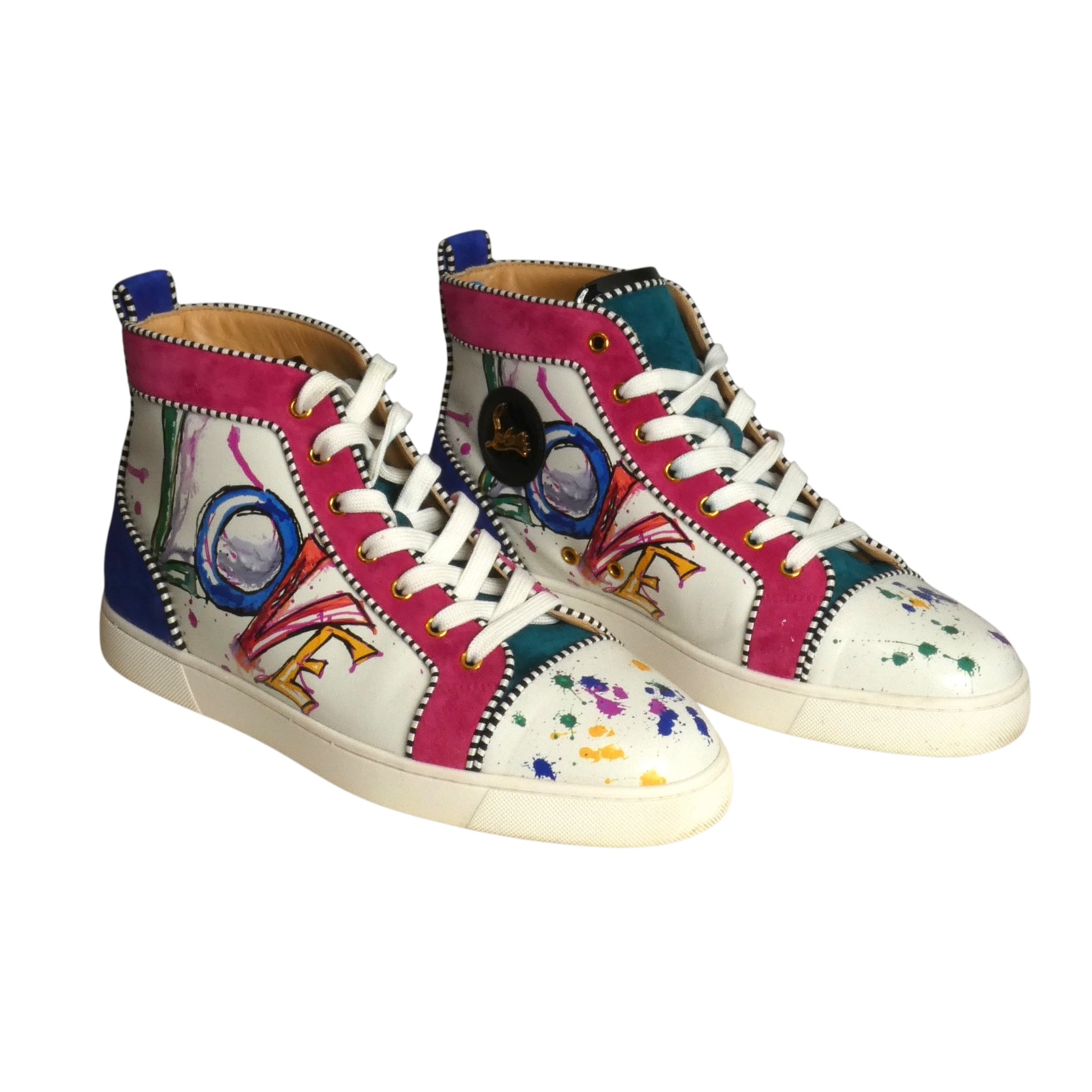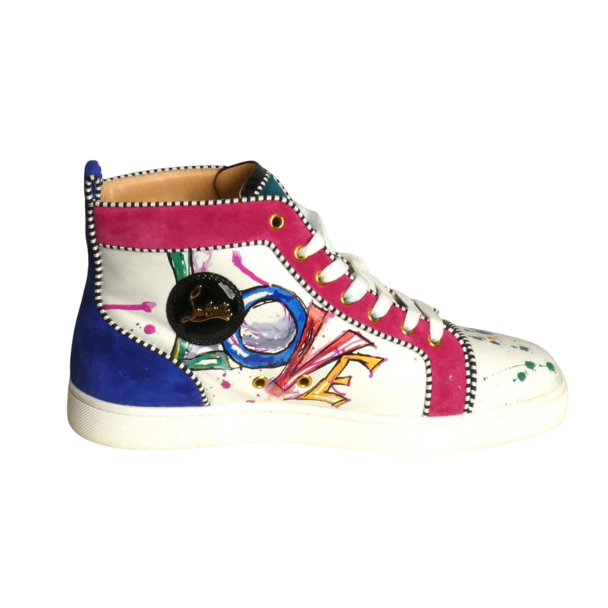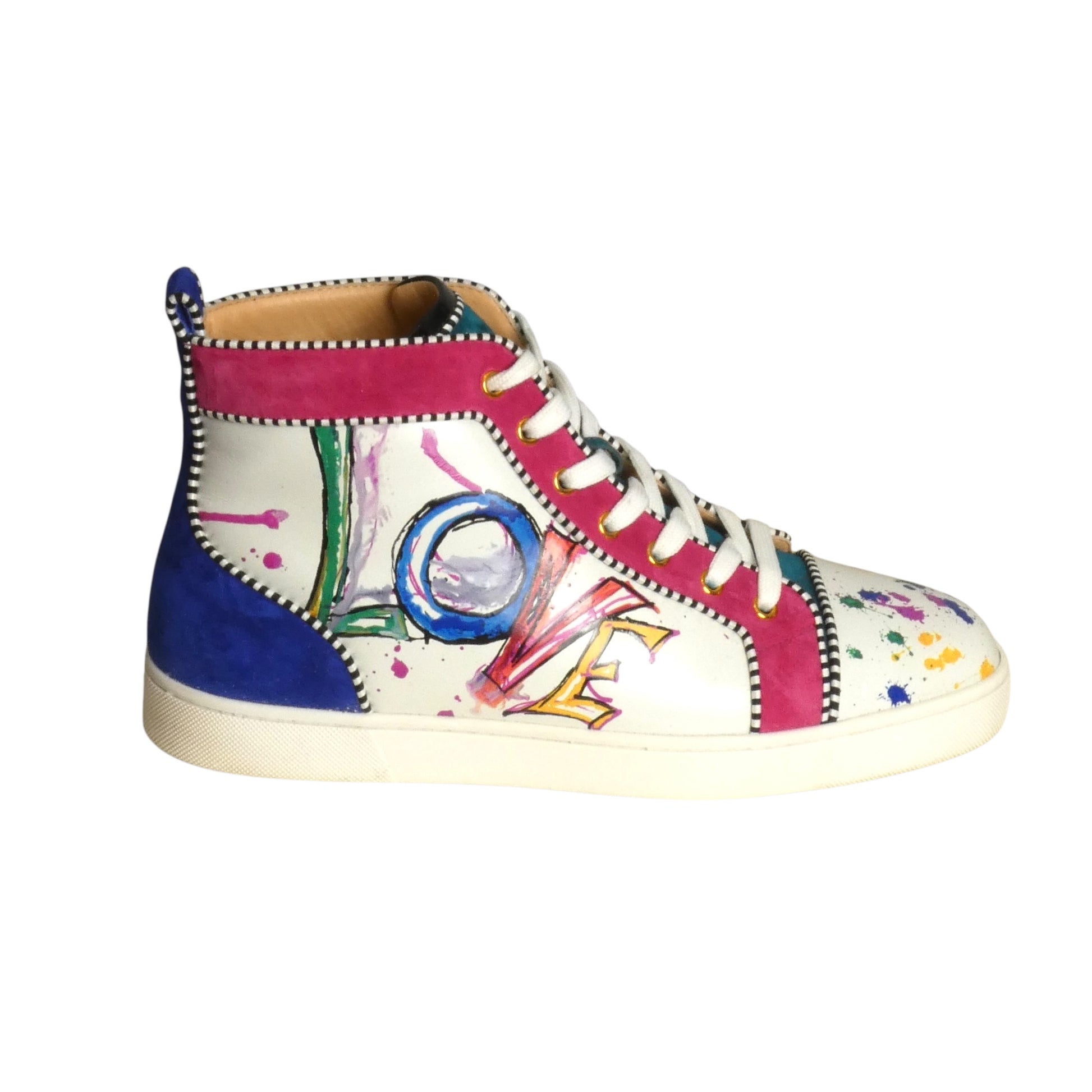 Description: Inspired by Christian Louboutin's debut collection, these white high-top sneakers showcase a fun LOVE graphic in a bold street-style design, accented with vibrant suede details. Comes complete with the original box.