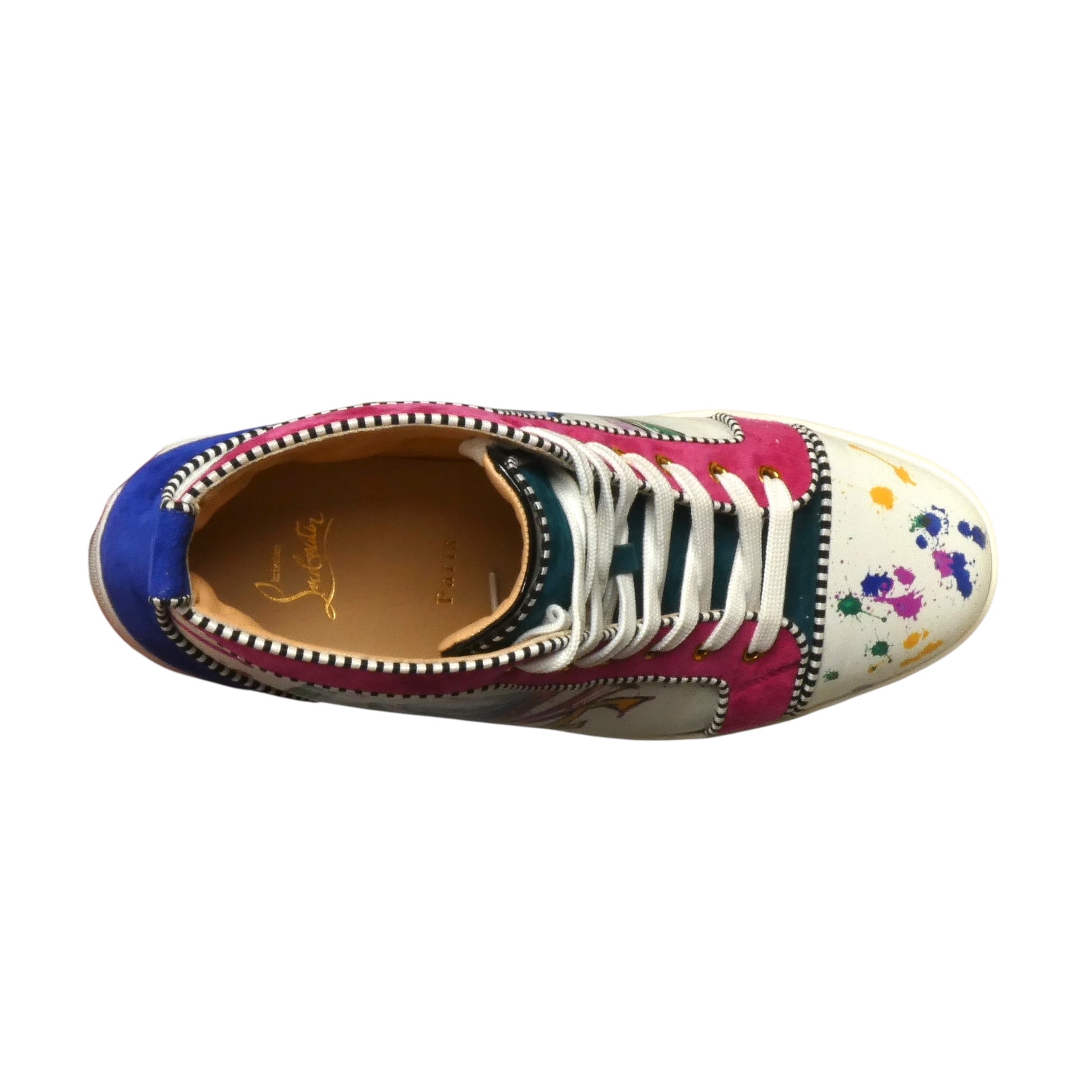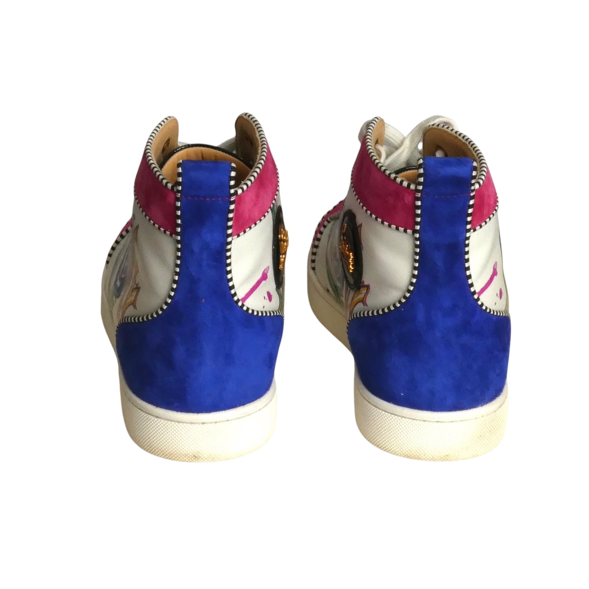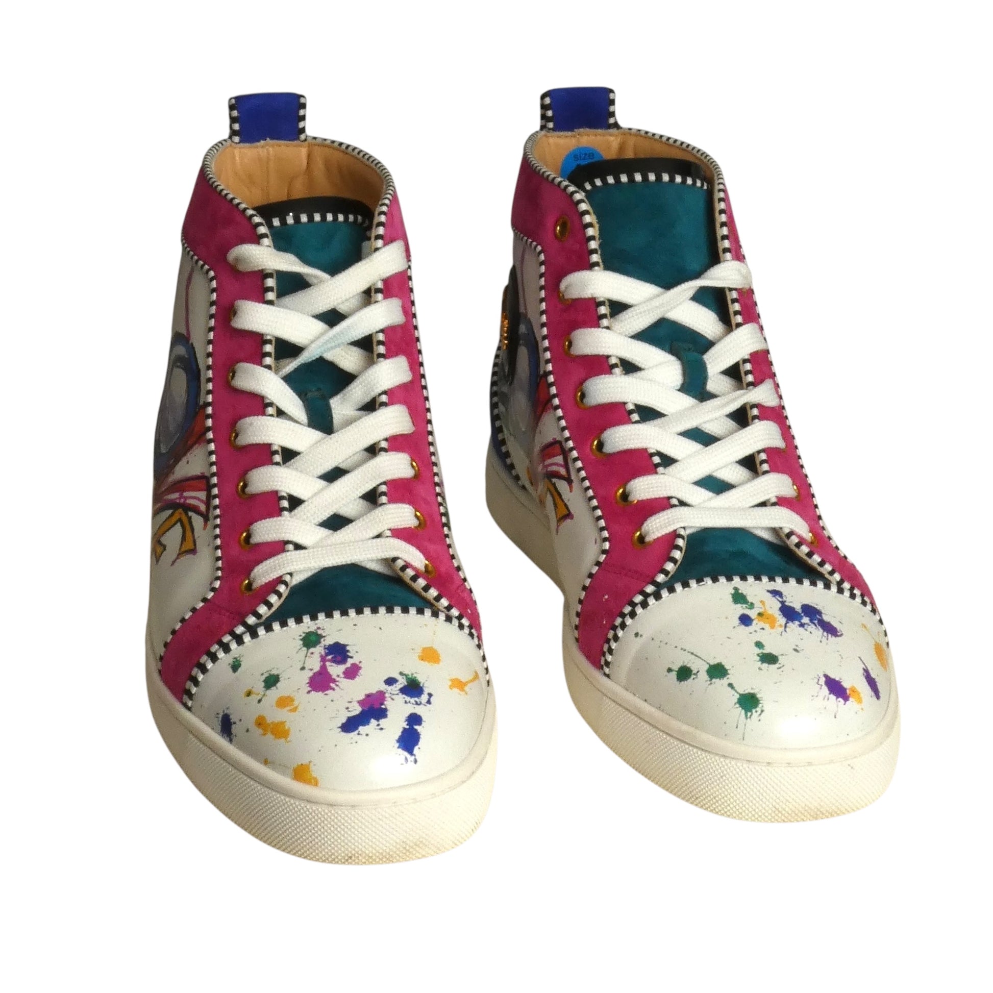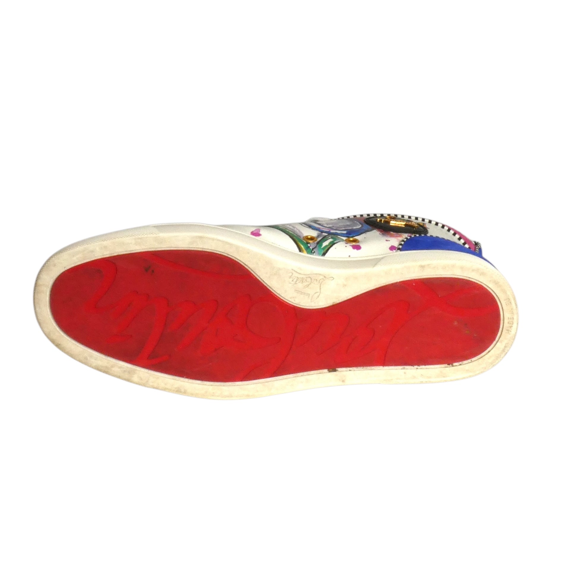Description: Inspired by Christian Louboutin's debut collection, these white high-top sneakers showcase a fun LOVE graphic in a bold street-style design, accented with vibrant suede details. Comes complete with the original box.