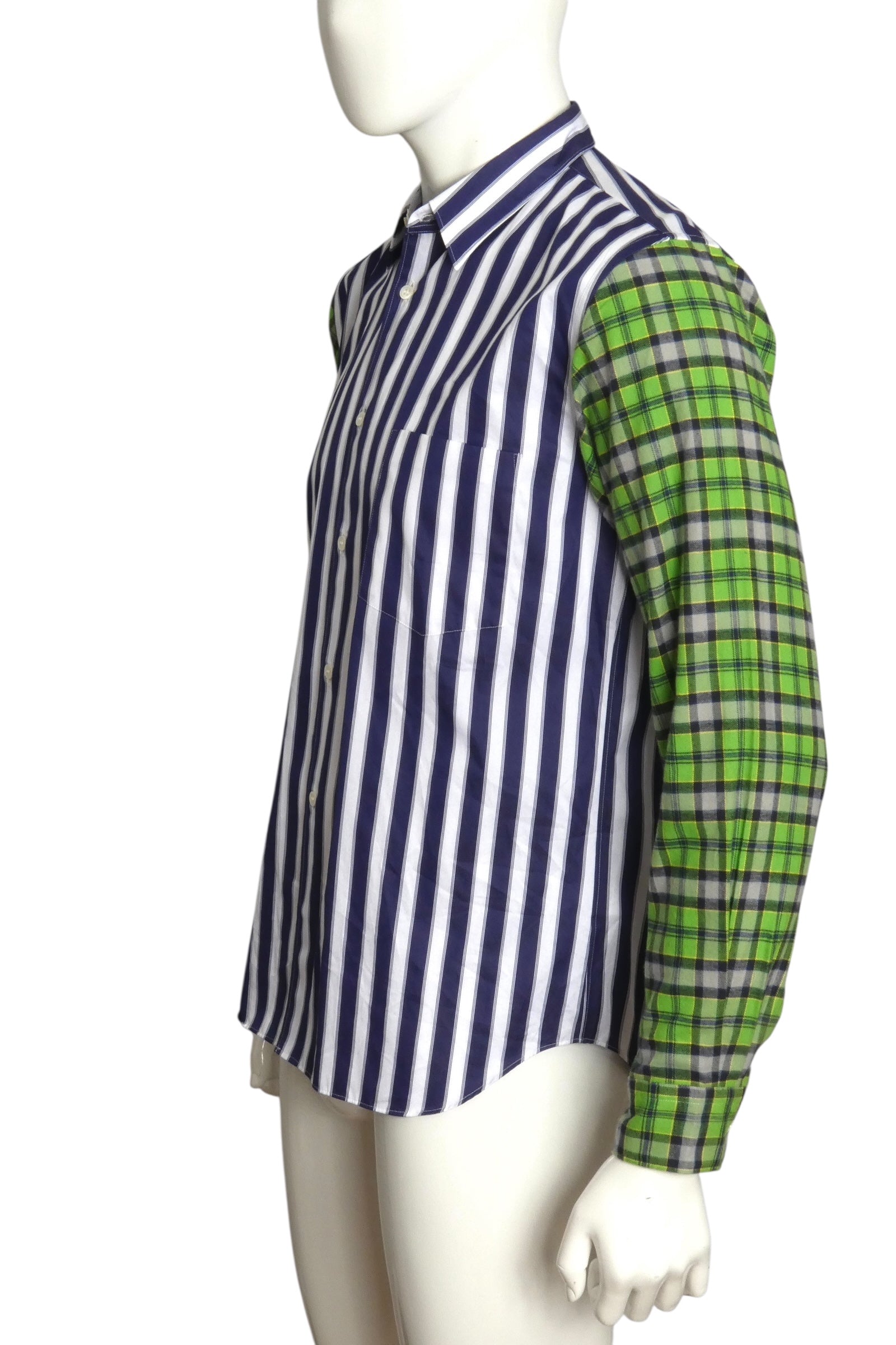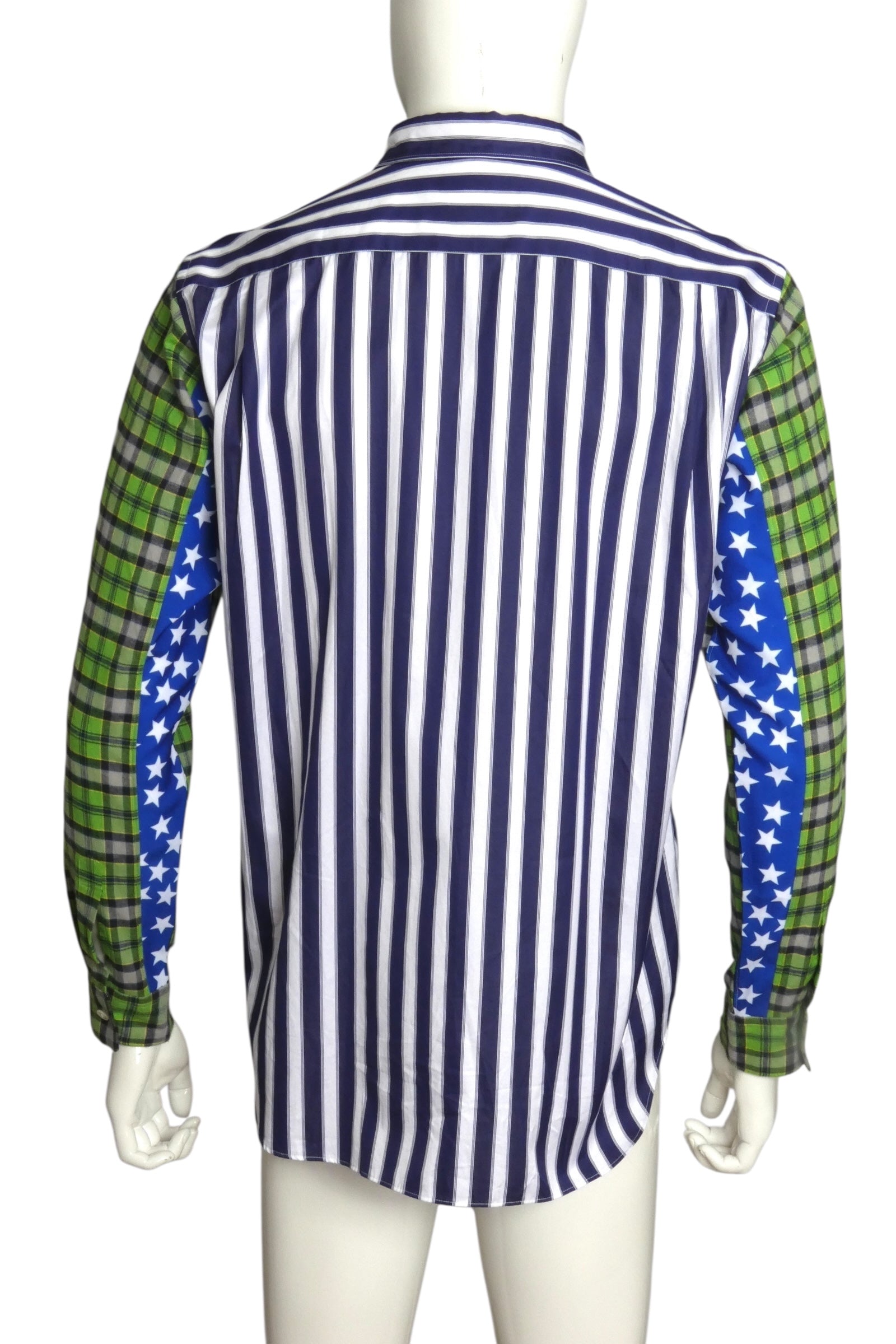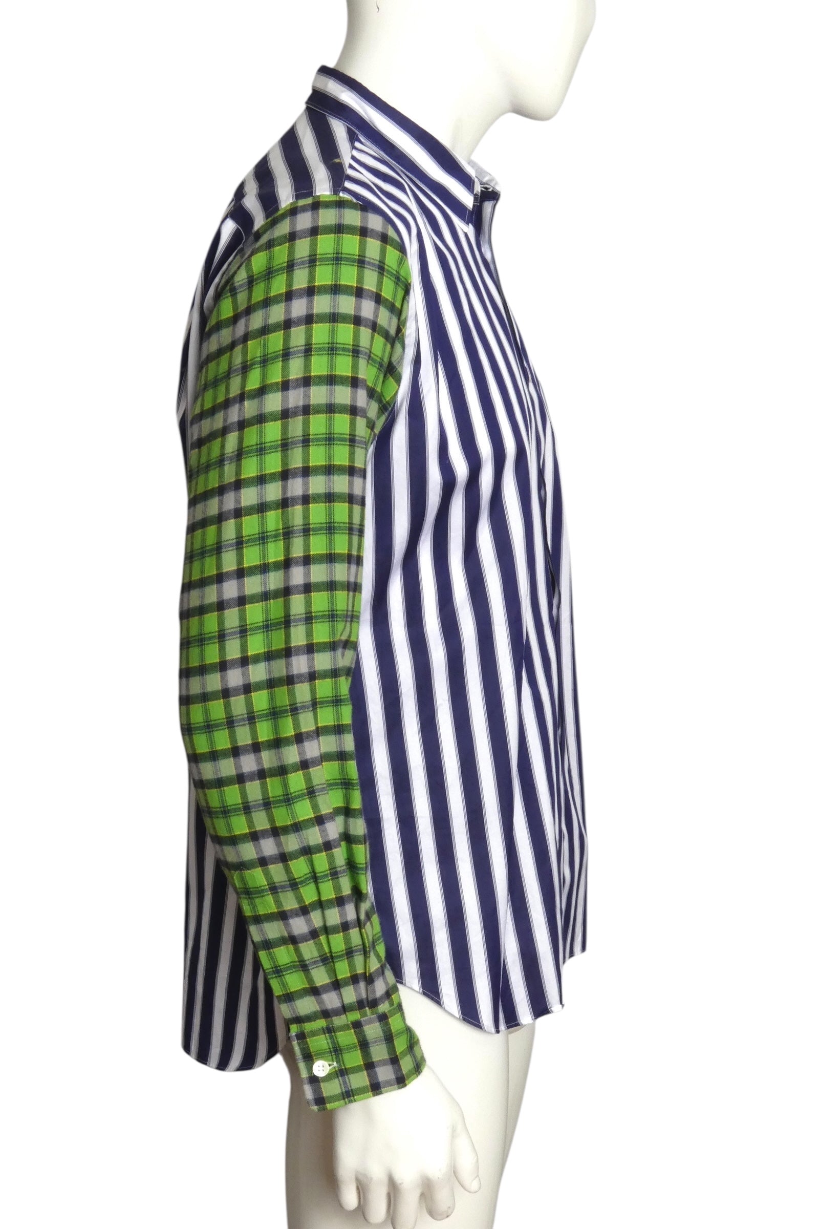 Description: This playful cotton shirt brings together a navy and white striped front panel with quirky green plaid flannel sleeves and a fun cotton star print inset running down the inner arms. It features a tiny collar and button closures down the front, plus a small patch pocket on the chest for a charming finishing touch. Perfect for adding a splash of unexpected style to your wardrobe.