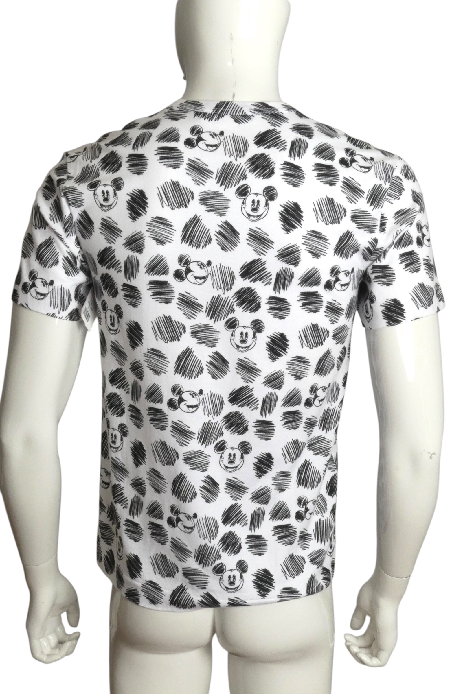 Description: From the 2021 Disney capsule collection, this white cotton t-shirt brings fun to your wardrobe with its playful scribble dot and illustrated Mickey Mouse pattern. Featuring a comfortable crew neckline and short sleeves, it perfectly combines casual style with iconic Disney charm. Sized small, it's a delightful way to add a touch of magic to your everyday look.