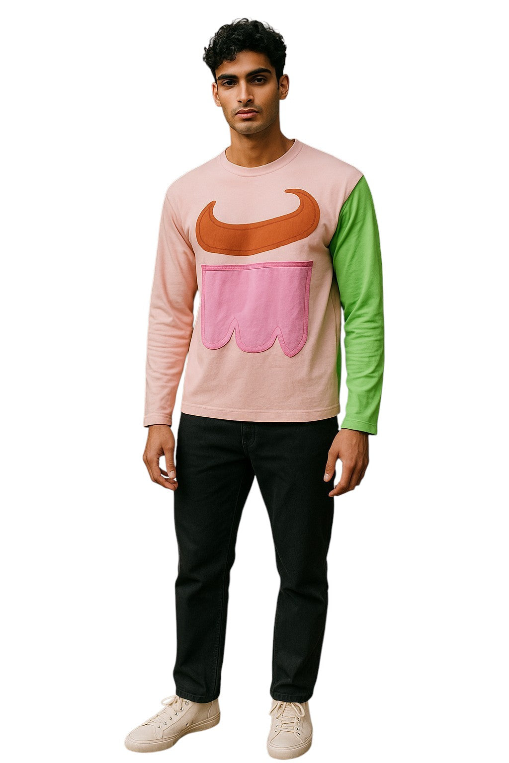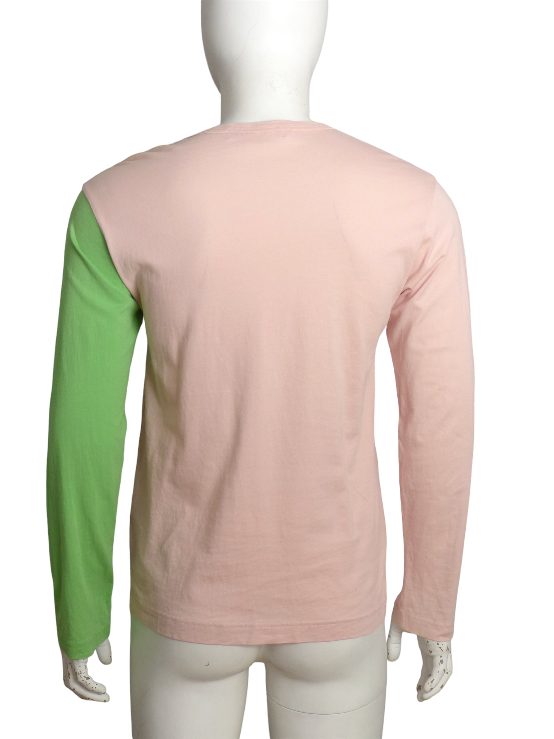 Description: Experience the playful and whimsical design of this cotton long sleeve t-shirt. The pink body is complemented by green sleeves and features padded cotton appliqués on the front. Be bold and add a pop of color to your wardrobe with this unique piece.