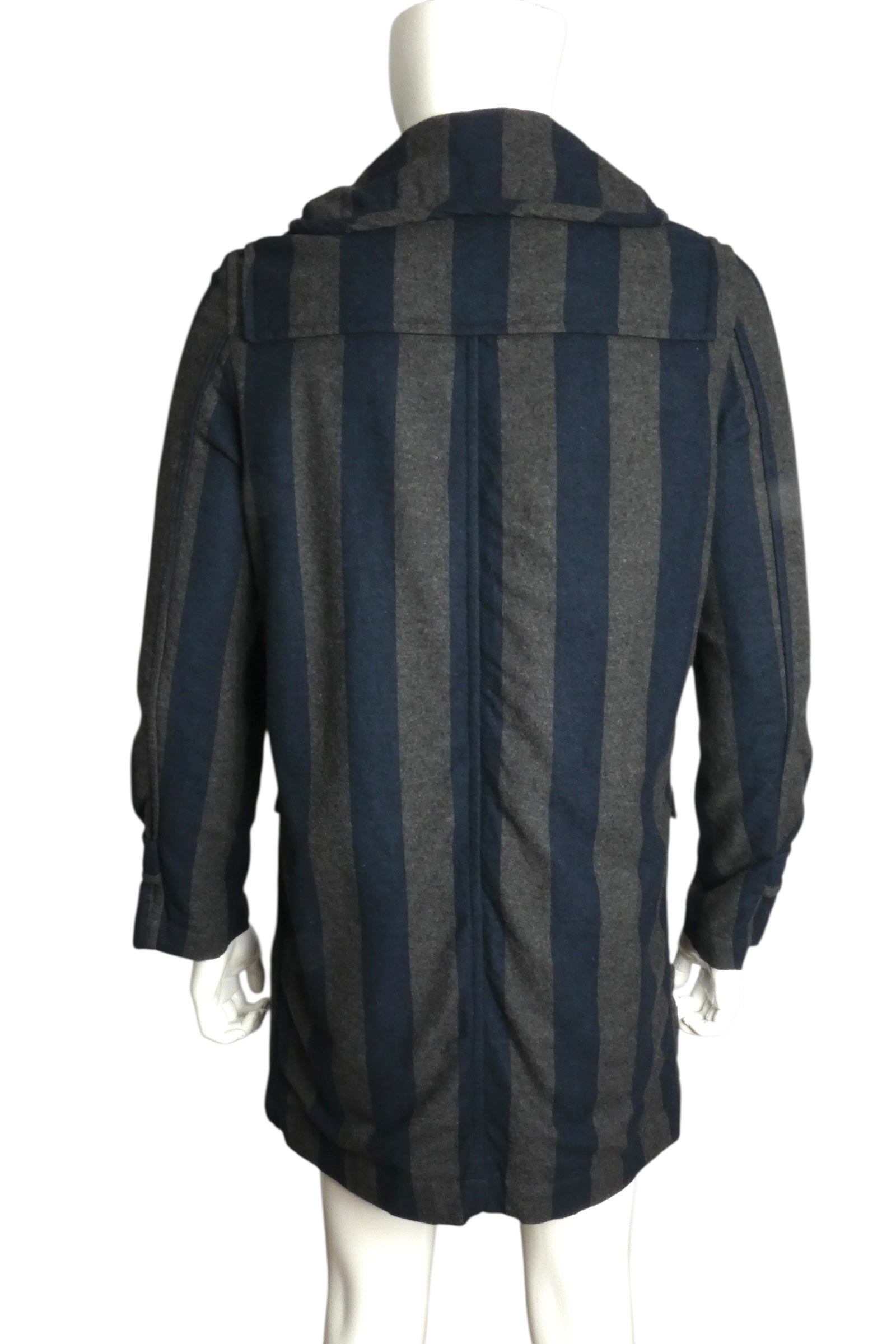 Description: Comme des Garçons Shirt Man's toggle coat is nautical rebellion in lightweight wool. Grey and black stripes create visual tension across the fabric, while a sailor-style back flap collar nods to maritime tradition before subverting it entirely. Rope and wood toggles replace conventional buttons—a tactile provocation that demands interaction. Layered, seamed yokes front and back add architectural depth, while long sleeves with adjustable button cuffs deliver precision. Flap patch pockets sit at the waist, and full cotton lining ensures comfort beneath the 100% wool exterior. Size Medium. This is Comme des Garçons at its most playful—deconstructing classics and rebuilding them as something entirely new.