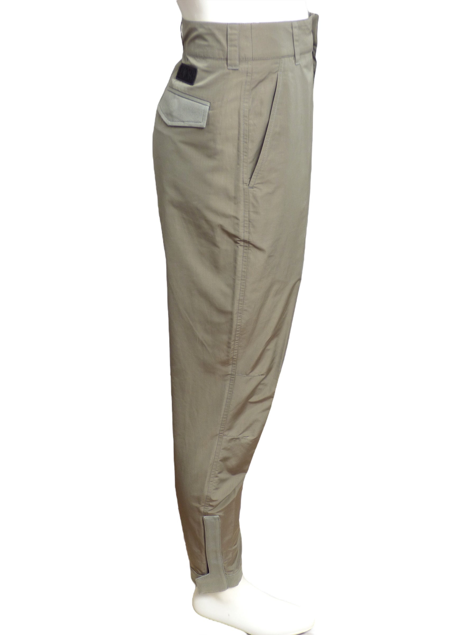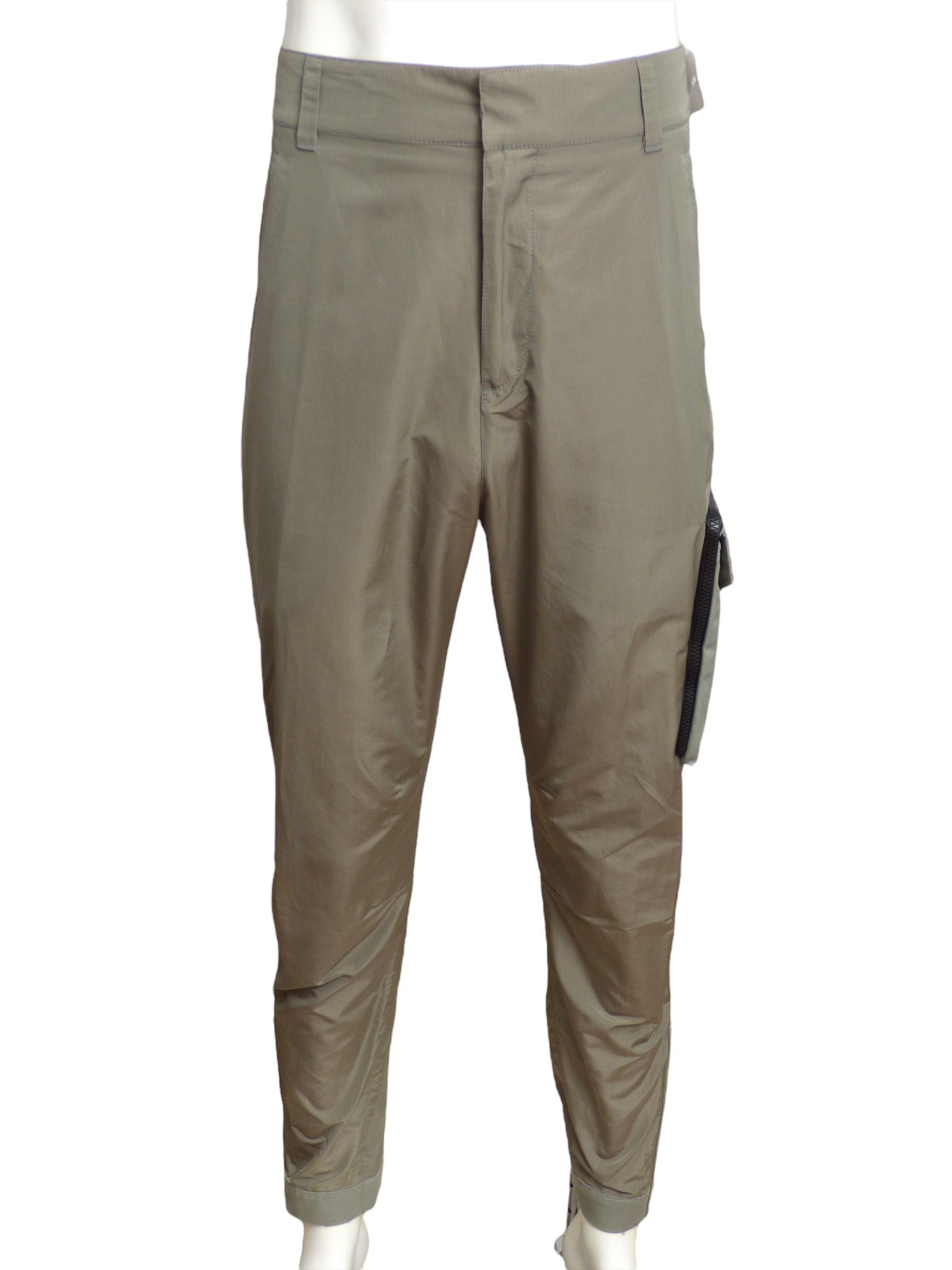 Description: Take a risk and elevate your style with these daring trek pants. Featuring a sleek trouser design, they boast a button waistband and zipper fly for a secure fit. Side and back inset pockets with cotton twill flaps offer practical storage, while a bold cargo pocket on the left leg has a zipper and snap closure for added security. The pants are tapered at the ankles with zipper closures and cotton twill accents for a touch of adventure.