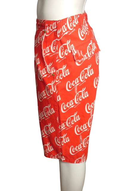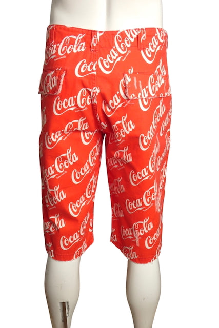 Description: Step into bold style with the ERL x Coca-Cola® distressed cotton canvas shorts. Featuring an all-over red and white Coke print, logo-engraved buttons, and a front button-and-zip fastening, these shorts combine playful design with practical details like side rounded pockets and rear flap pockets. Their straight leg and below-knee length make them perfect for a fun, relaxed look.