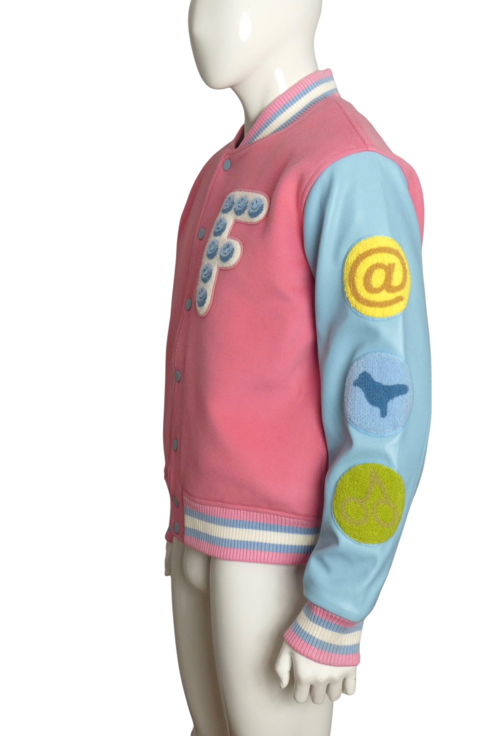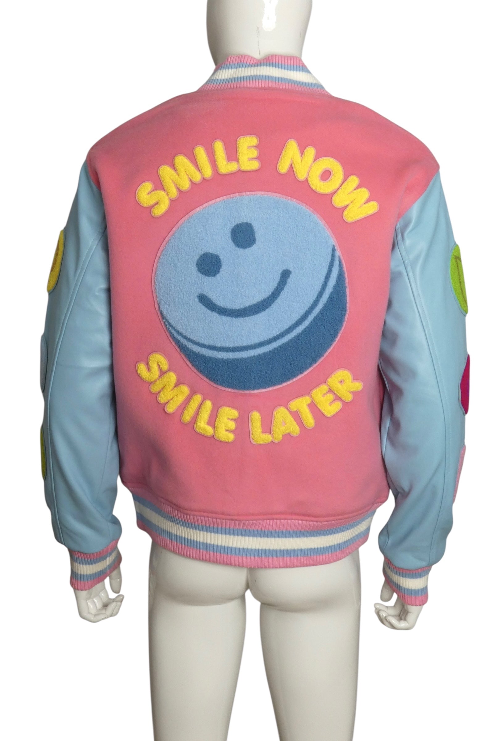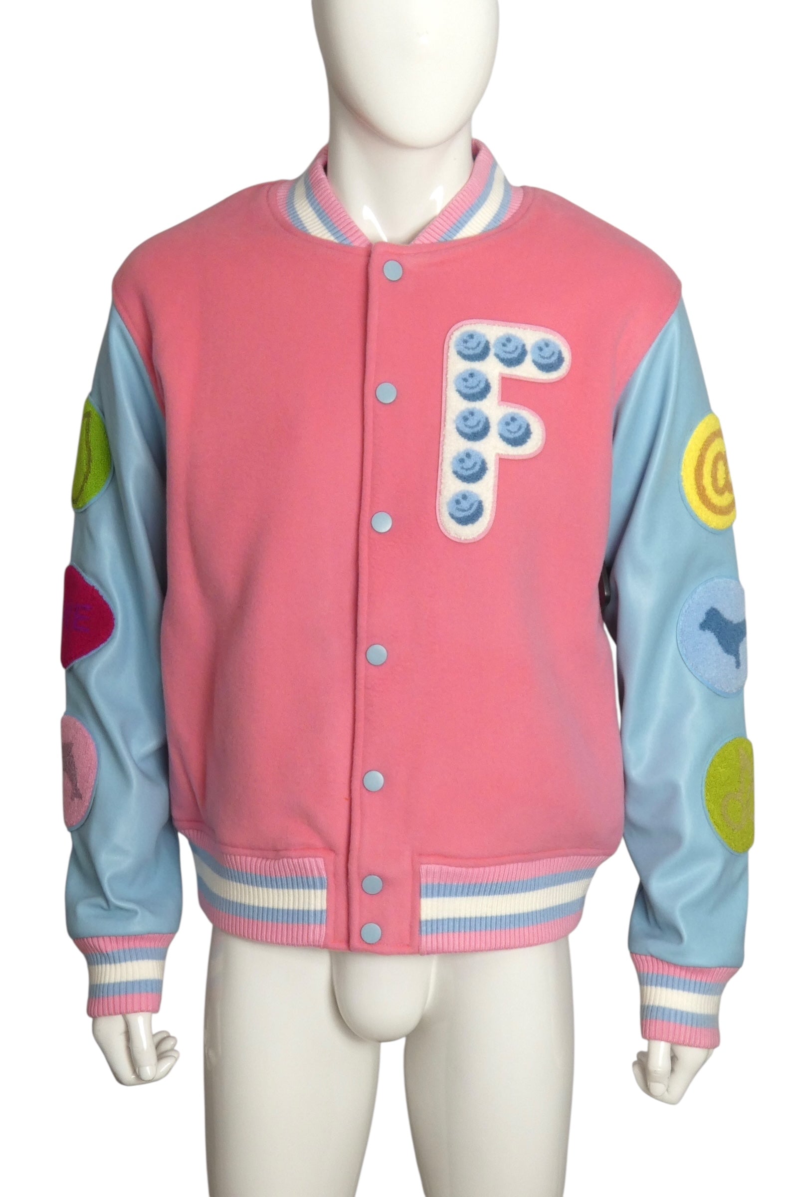 Description: Step into fall with the playful charm of the "Happy Pill" varsity jacket from the 2023 collection. This beauty features cozy pink fleece contrasted with sleek vegan leather sleeves, all accented by striped knit trims and eye-catching patches. With original store tags still attached, it’s a fresh find ready to elevate your style and spread good vibes wherever you go.
