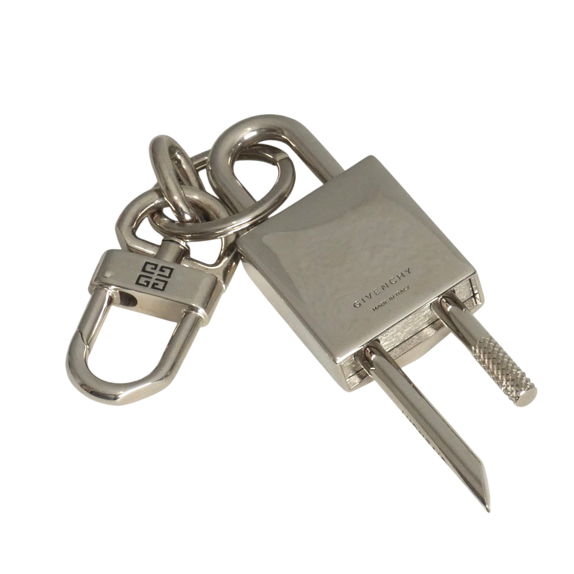 Description: Meet your new favorite accessory—a Givenchy silver padlock keychain that's equal parts chic and practical. Boasting a lustrous polished and textured silver-tone finish, this miniature masterpiece flaunts the brand's coveted 4G emblem front and center, with "GIVENCHY" signatures adorning the side, back, and snap hook. The integrated key ring and lanyard clasp make it wonderfully versatile: clip it to your keys, dangle it from your bag, or use it as a conversation-starting charm. Designer flair has never been this fun or functional.