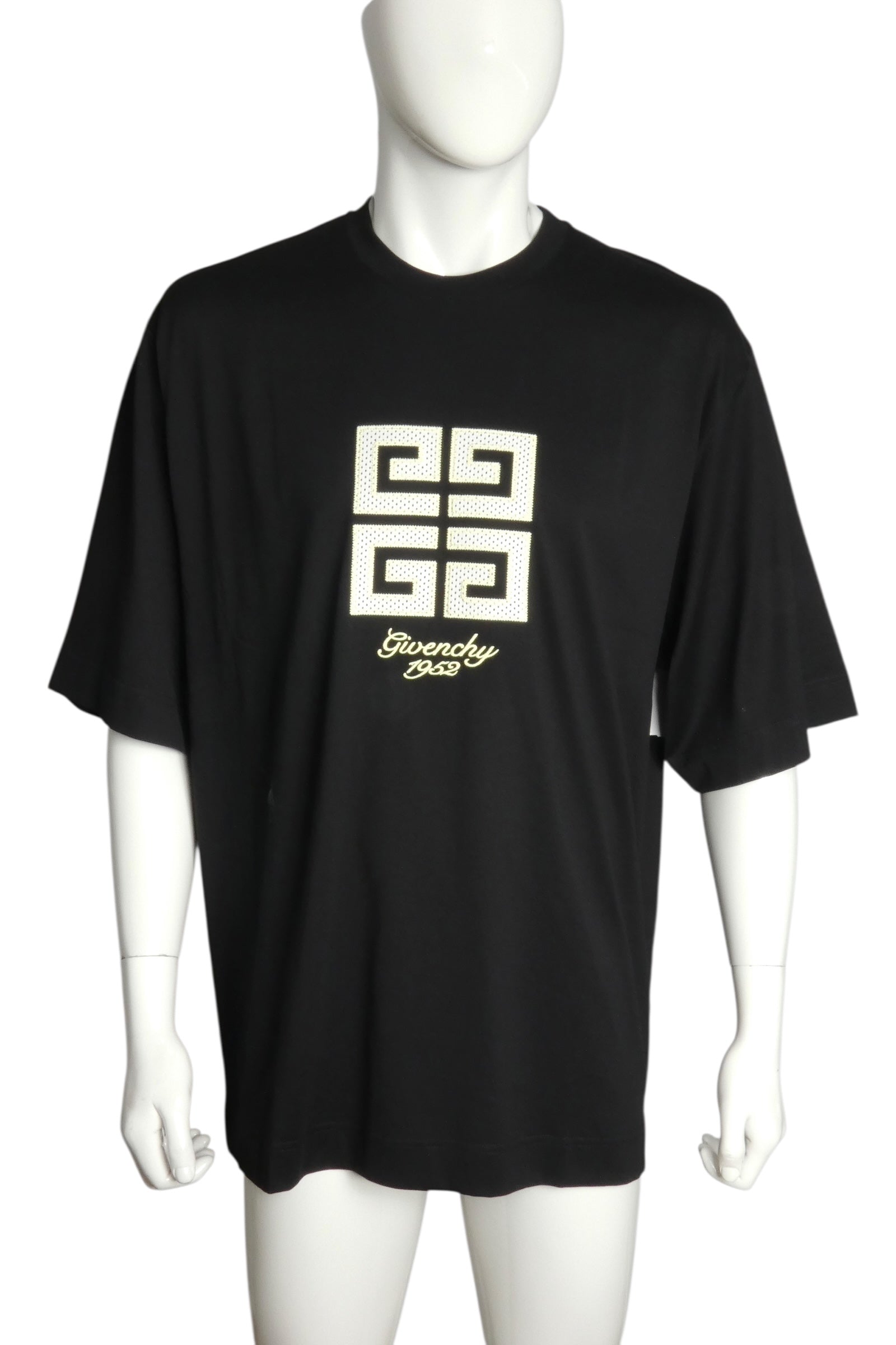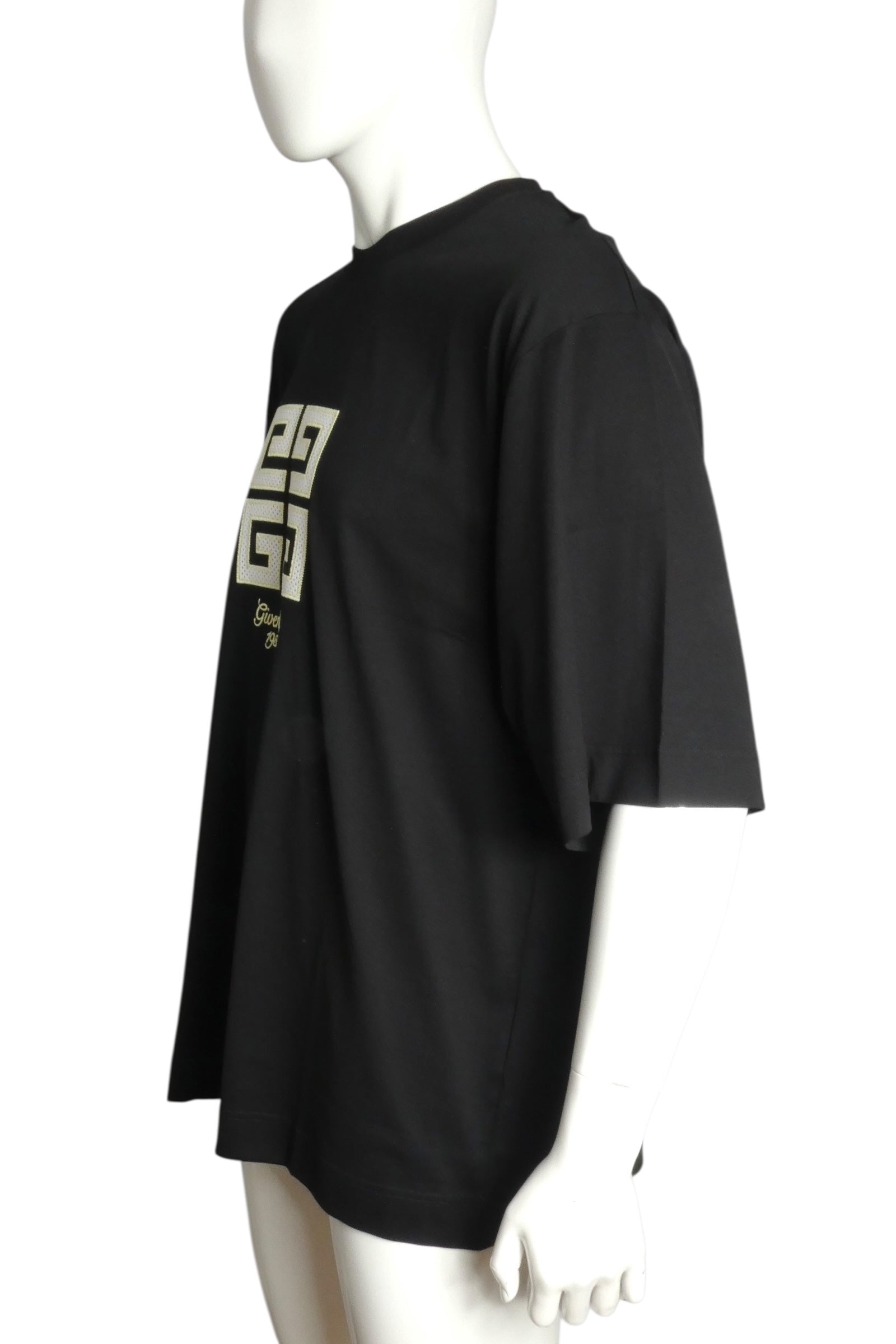 Description: This Givenchy black t-shirt showcases the brand's 4G Studio Fit silhouette with refined tailoring and contemporary proportions. The piece features a jersey appliqué logo on the front displaying the brand signature alongside its founding year, adding heritage context to the design. Retaining original retail tags with a $670 price point and unworn condition, exemplifies Givenchy's commitment to elevated basics and meticulous craftsmanship.