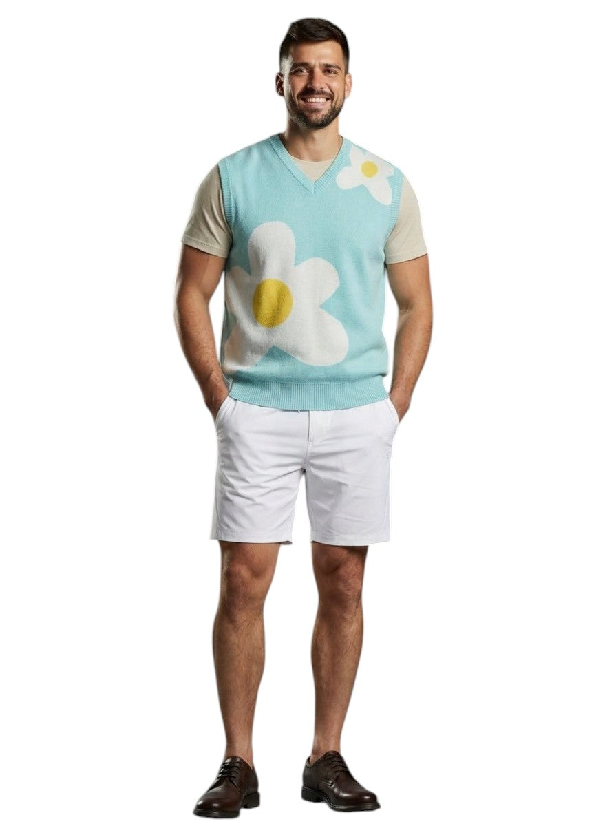 Description: This pale blue cotton sweater vest features a large abstract floral design that adds a playful yet sophisticated touch to your wardrobe. Crafted with ribbed knit detailing at the neckband, armholes, and hemline, it offers both comfort and structure. Perfect for layering, this size Large vest combines timeless style with breathable fabric, making it ideal for year-round wear.