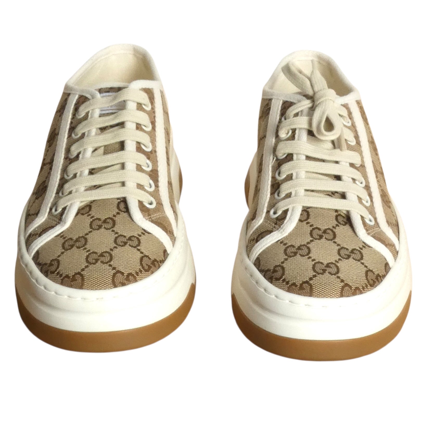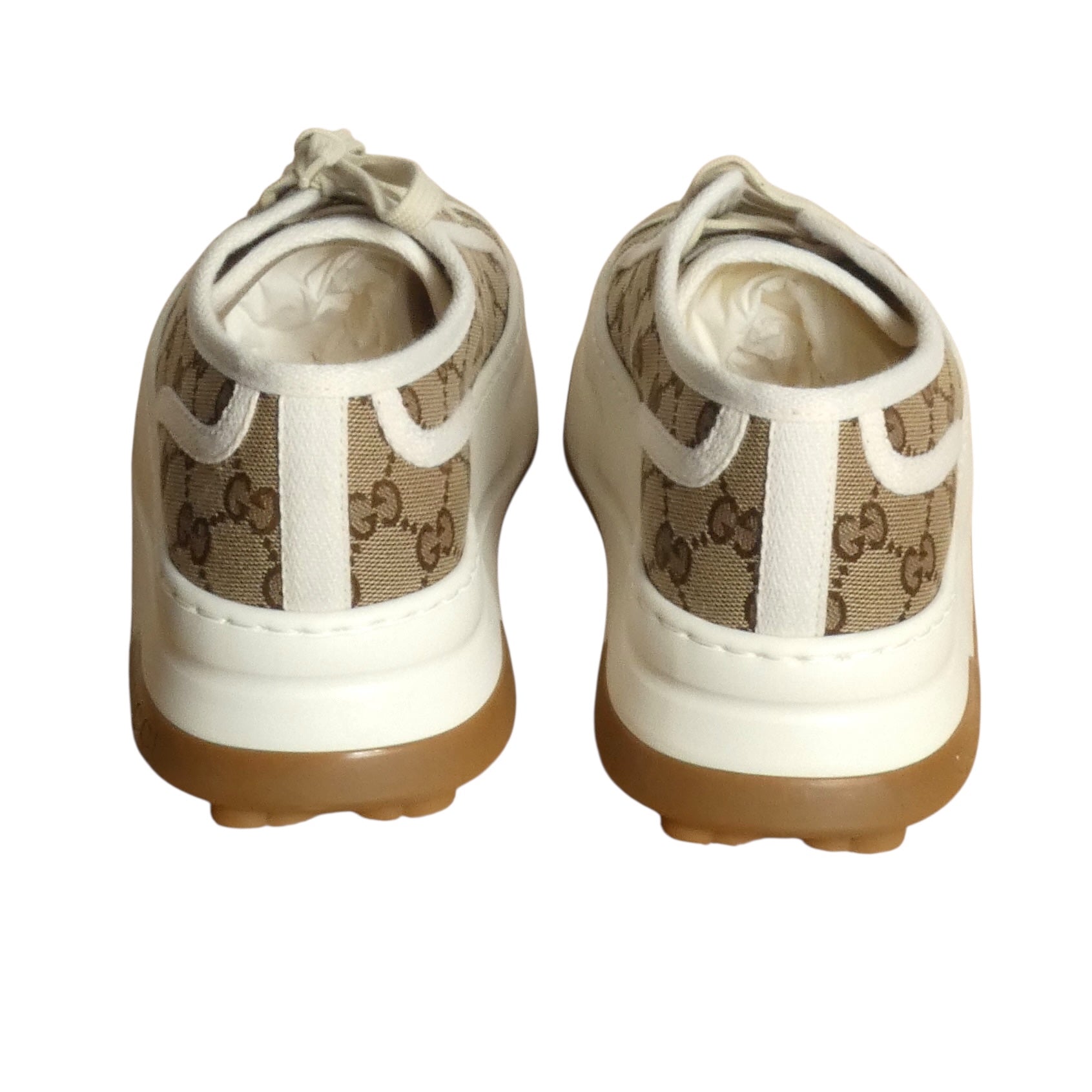 Description: Gucci's 1977 Canvas Platform Sneakers channel vintage tennis court energy through a contemporary lens that refuses compromise. The iconic beige and ebony GG canvas upper sits atop a substantial white rubber platform sole—a bold architectural statement that commands the ground. White contrast piping and lace-up closure keep the aesthetic sharp, while the textured GG motif tread ensures grip meets glamour. Made in Italy with meticulous craftsmanship, the "Gucci Tennis 1977" tongue label seals the heritage narrative. Boxed and ready to inject retro-futuristic swagger into your collection.