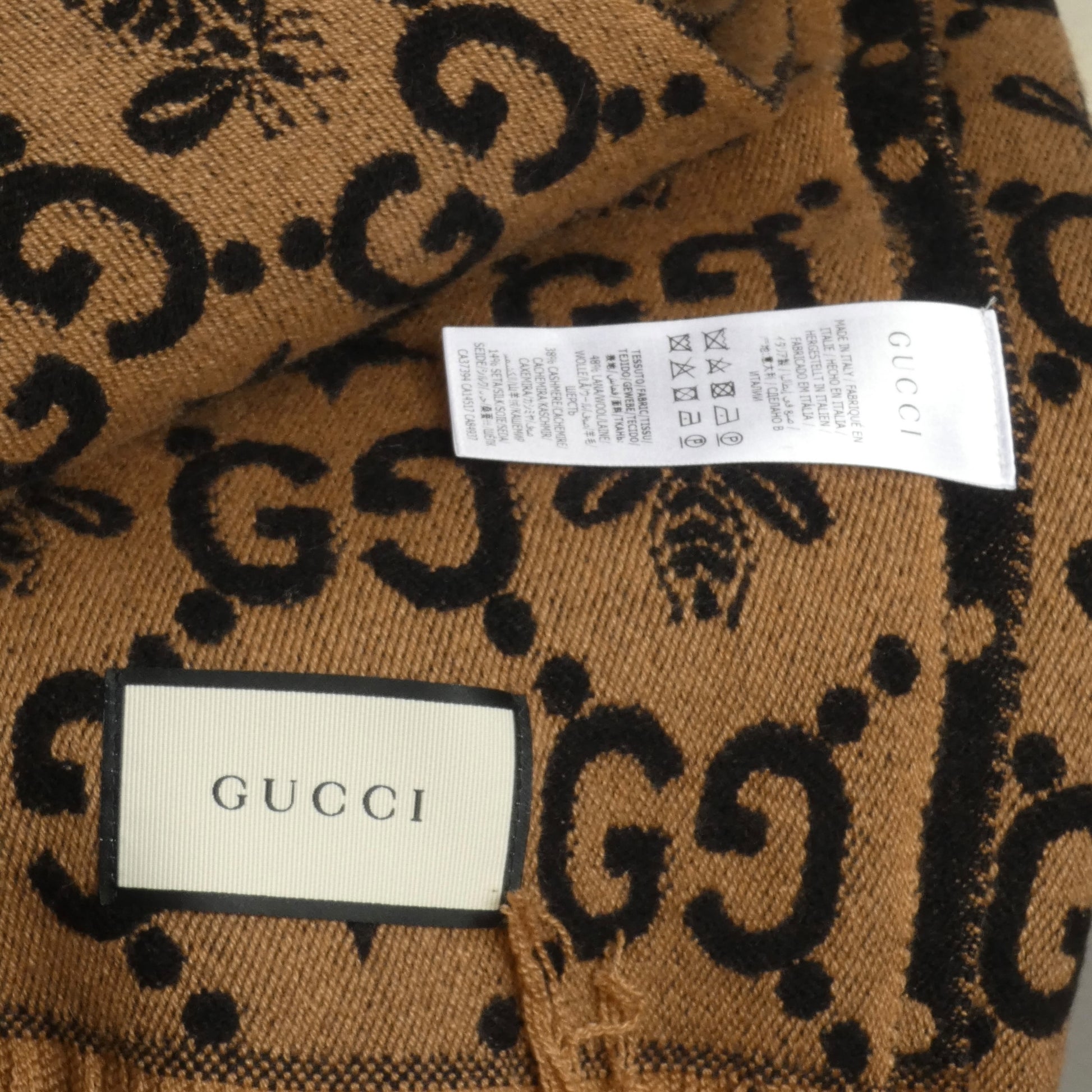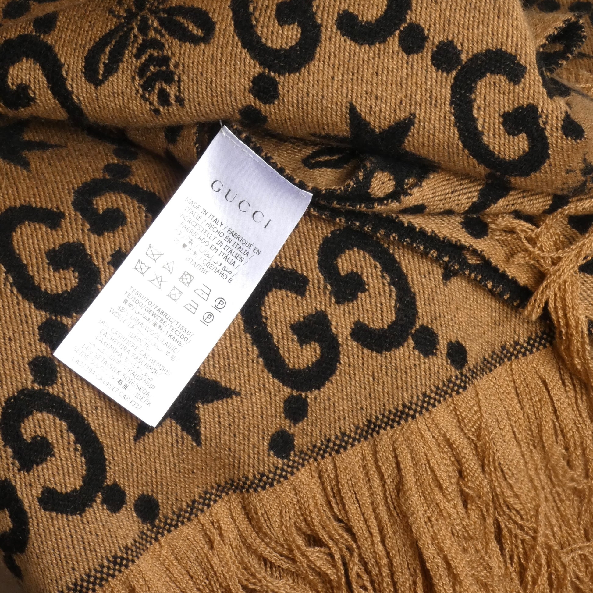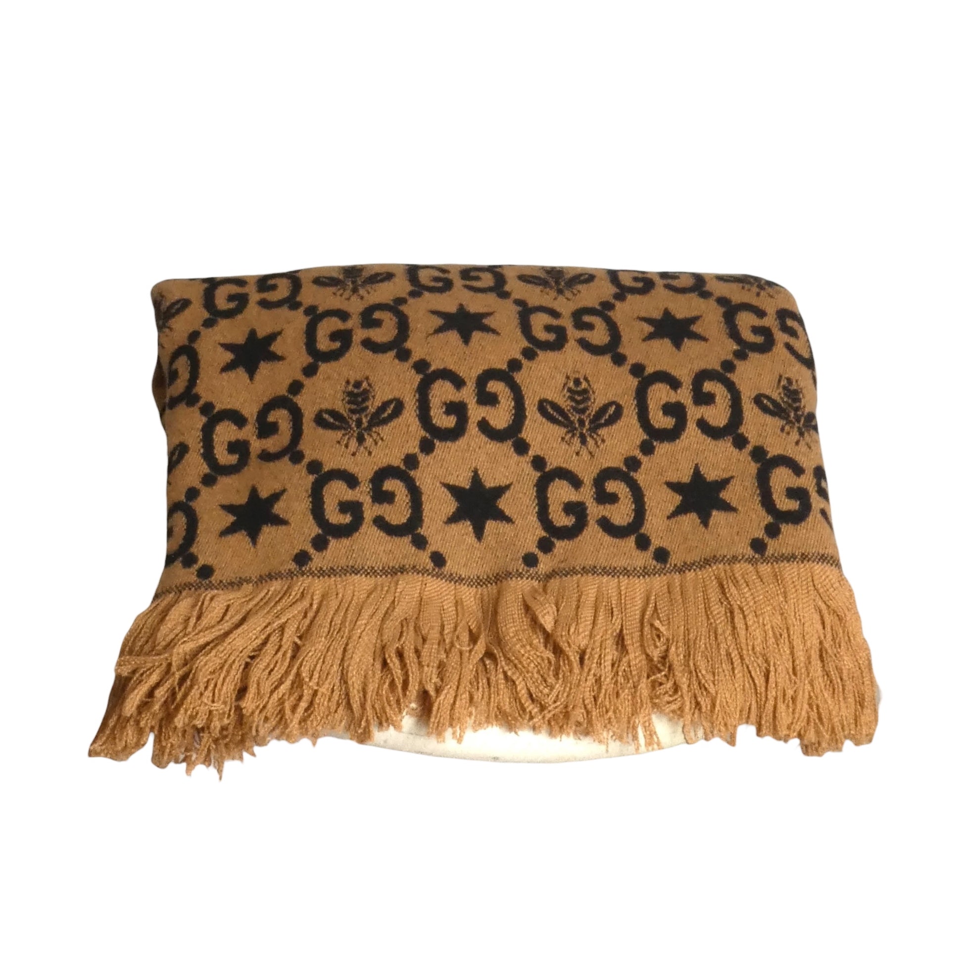 Description: Wrap yourself in cozy luxury with this playful cashmere blend throw in rich brown and black. Featuring the iconic bee and GG logo, it adds a touch of Gucci charm while keeping you warm during your TV marathons. The self-fringe edges bring a relaxed, stylish vibe—perfect for cuddling up in style.