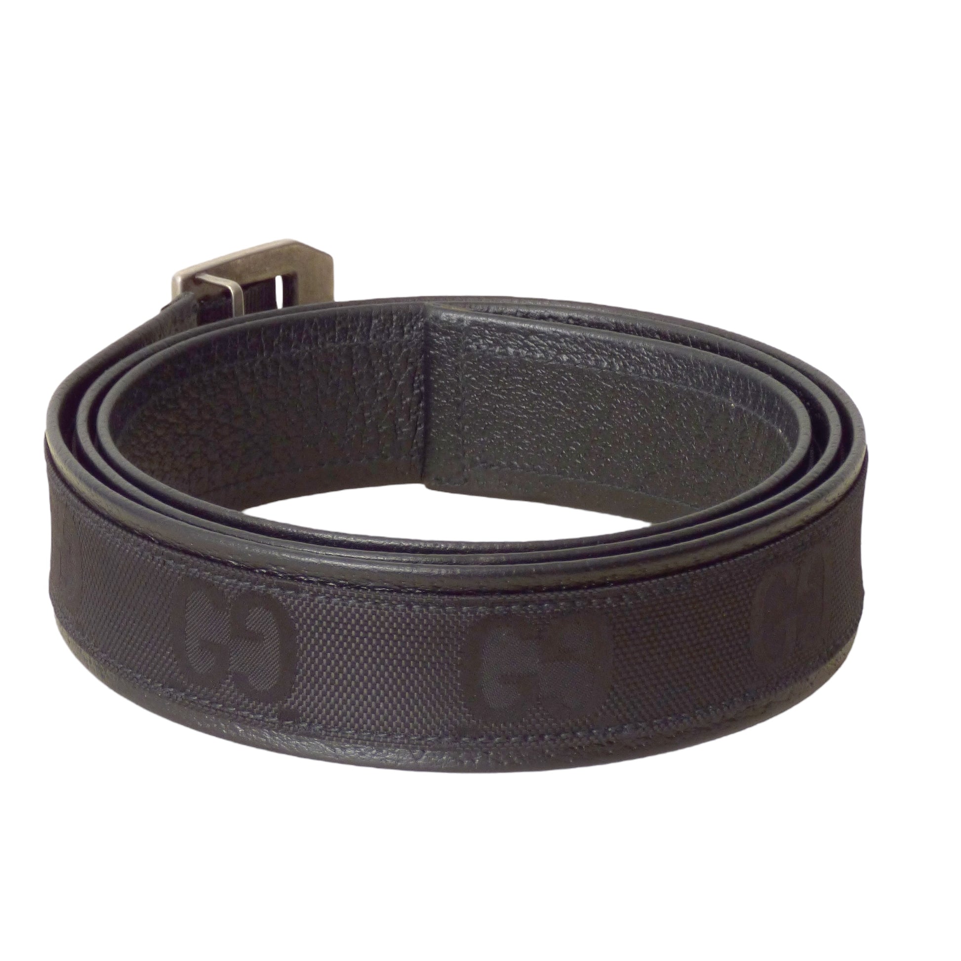 Description: This black nylon belt features a crinkle black leather strap with the iconic "GG" logo running down the center. The burnished metal buckle is etched with the brand name "Gucci" on top. This elegant piece comes complete with a Gucci box, making it a must-have for any fashion-forward individual.