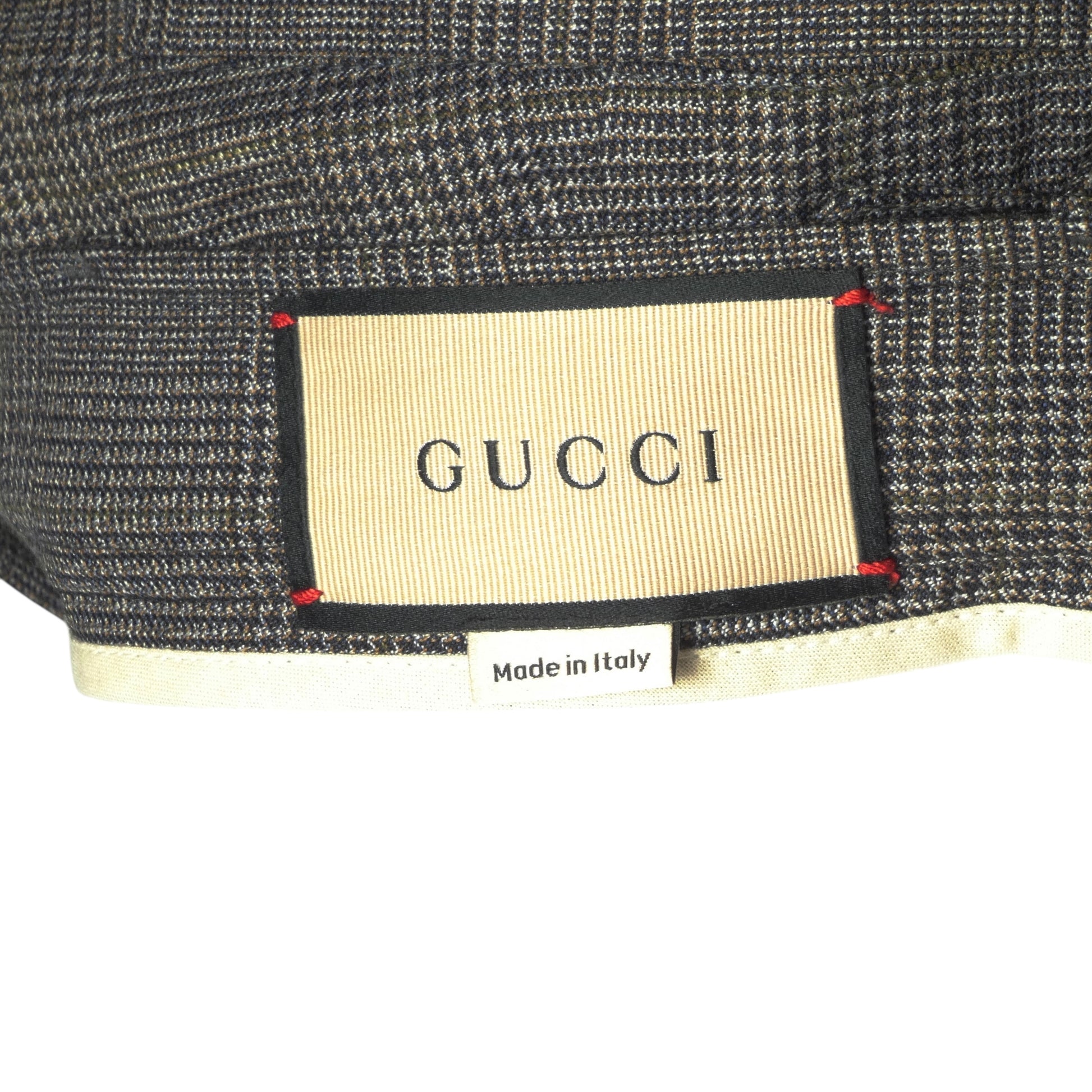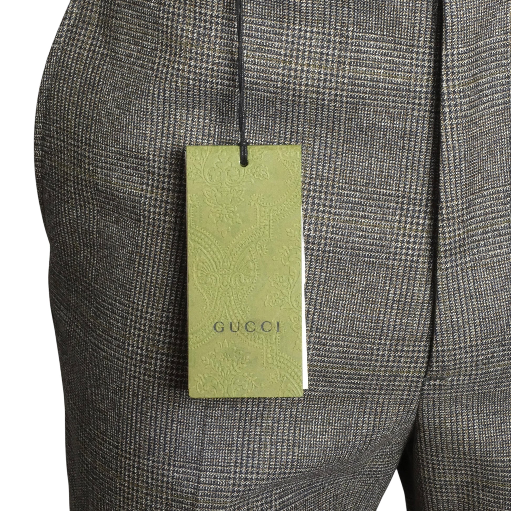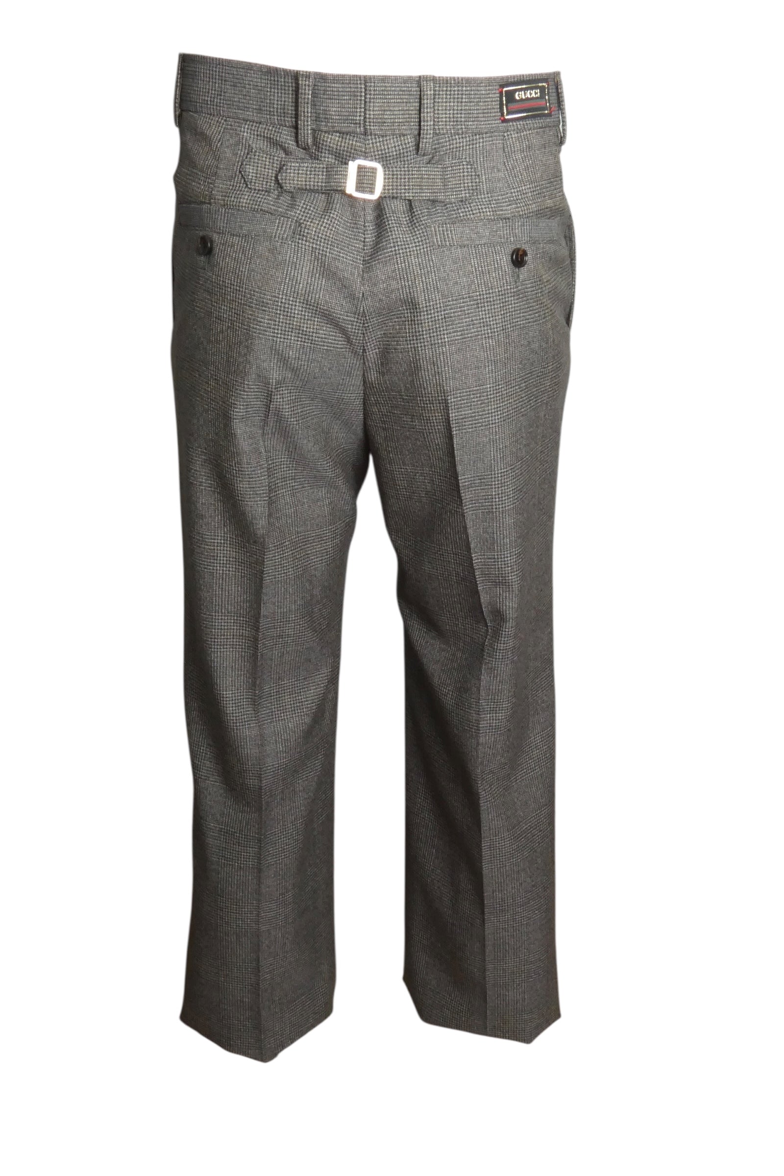 Description: Step into luxury with these unworn Gucci wool plaid slacks from 2022—a pristine addition to any sophisticated closet. Cut with a sleek flat front and anchored by a distinguished wide waistband, they feature an elegant martingale at the center back for refined structure. Designed at ankle length, they're the perfect canvas for showcasing your sock game. Still sporting original store tags, these grey stunners prove authenticity and timeless appeal. Whether you're dressing them up or keeping it casual, they're primed to become your go-to power move.