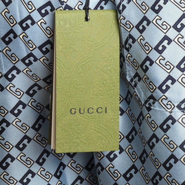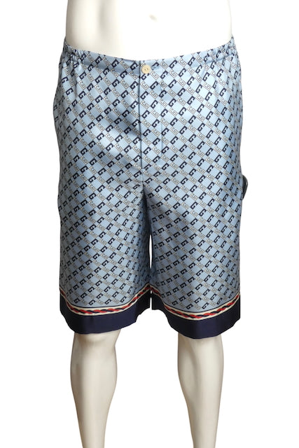 Description: Step into playful luxury with these Gucci silk shorts, crafted in Italy with a vibrant GG rhombus print. The baby blue satin finish shimmers while the all-over logo adds bold flair. Featuring a comfy elasticated back waist, button fly, and contrasting trim, they blend easy wear with standout style. With knee-length straight legs and handy pockets front and back, they’re perfect for turning heads and keeping cool.