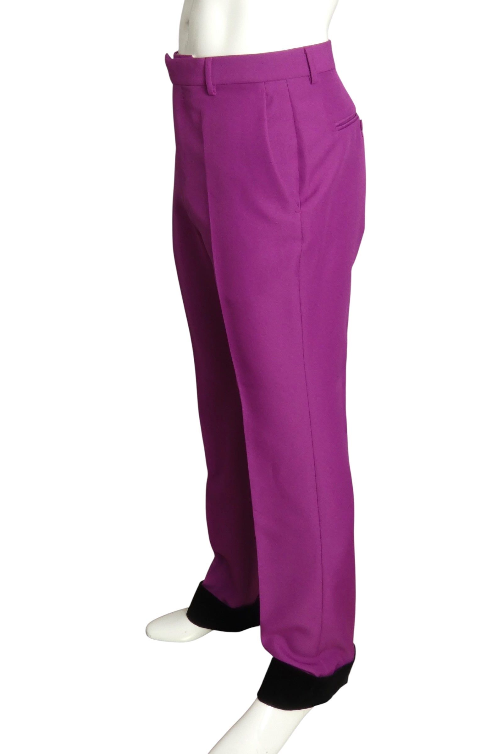 Description: Step out in style with these vibrant purple knit slacks from Gucci's Fall 2022 runway collection. Featuring deep black velvet cuffs, these trousers mix bold color with a touch of luxe texture. Brand new with original tags, they’re ready to upgrade your wardrobe and turn heads wherever you go.