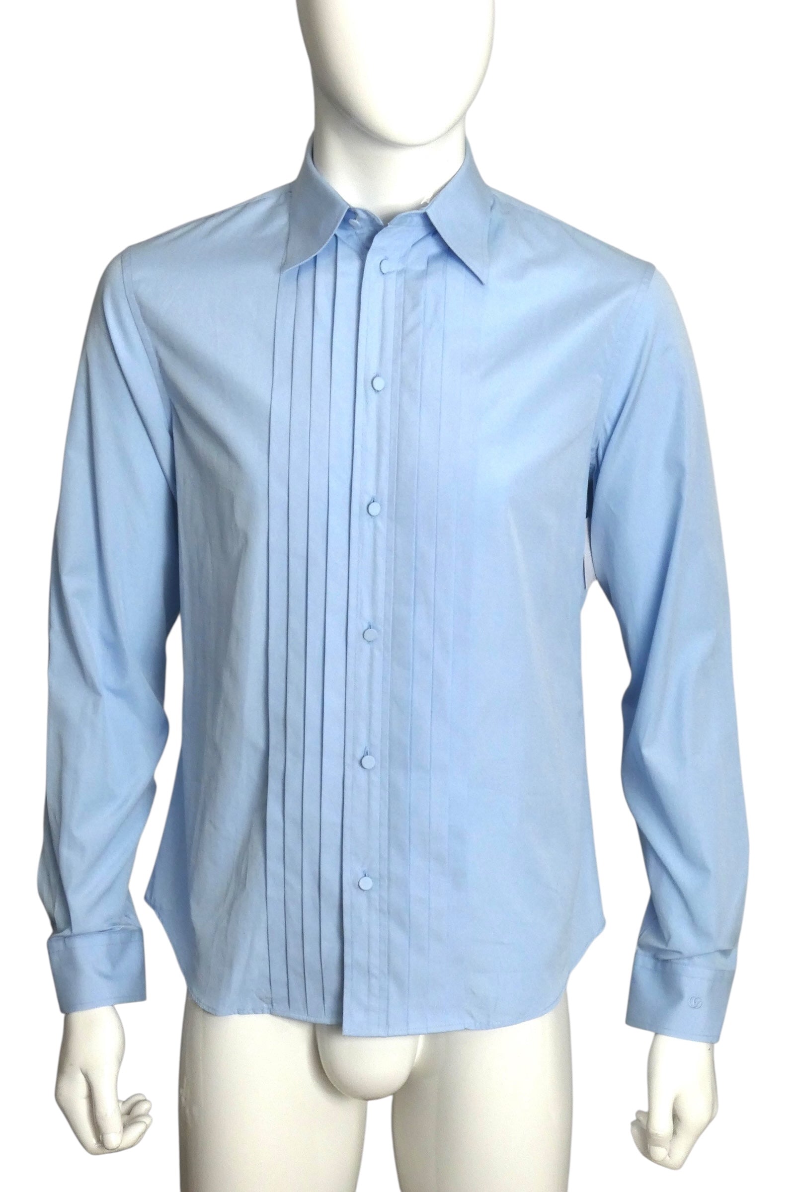 Description: Step into spring with the playful charm of this GUCCI Gainsburg shirt. Crafted from fine cotton, it features a crisp pointed collar and a stylish pleated front, all buttoned up with fabric-covered buttons that add a subtle flair. The long sleeves finish with pleated cuffs for a touch of sophistication. With original tags still attached, this shirt brings runway elegance straight to your wardrobe in multiple sizes—perfect for turning heads wherever you go!