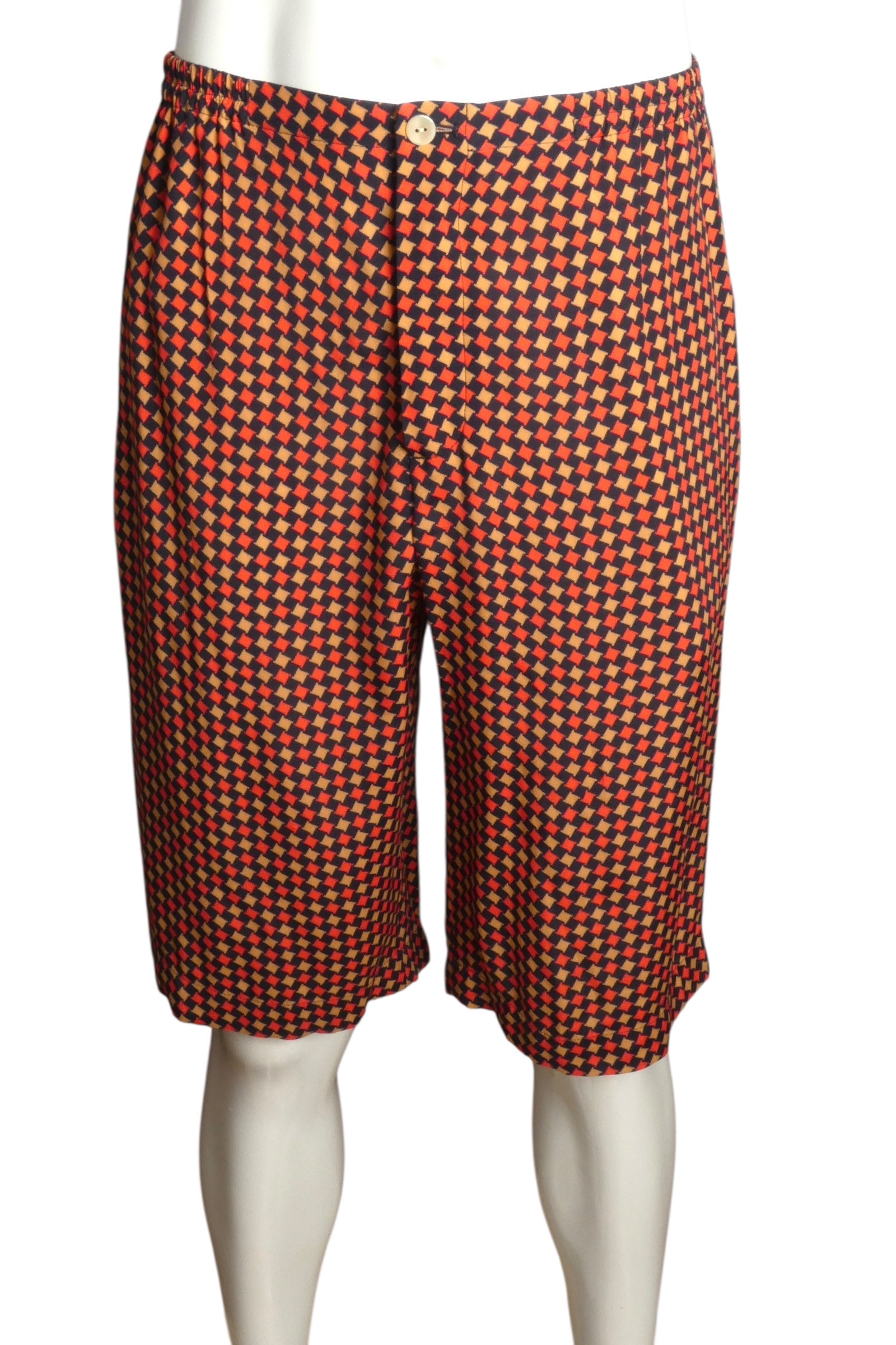 Description: These Gucci printed crepe Bermuda shorts from 2023 prove that comfort and audacity aren't mutually exclusive. The eye-catching print makes a statement while the relaxed Bermuda length keeps things effortlessly cool. An elasticated waistband ensures ease of movement, while inset side-seam and back pockets provide practical functionality. A button fly adds refined detail to the casual silhouette. Still pristine with original store tags attached, these shorts are perfect for those who refuse to compromise on style or comfort.
