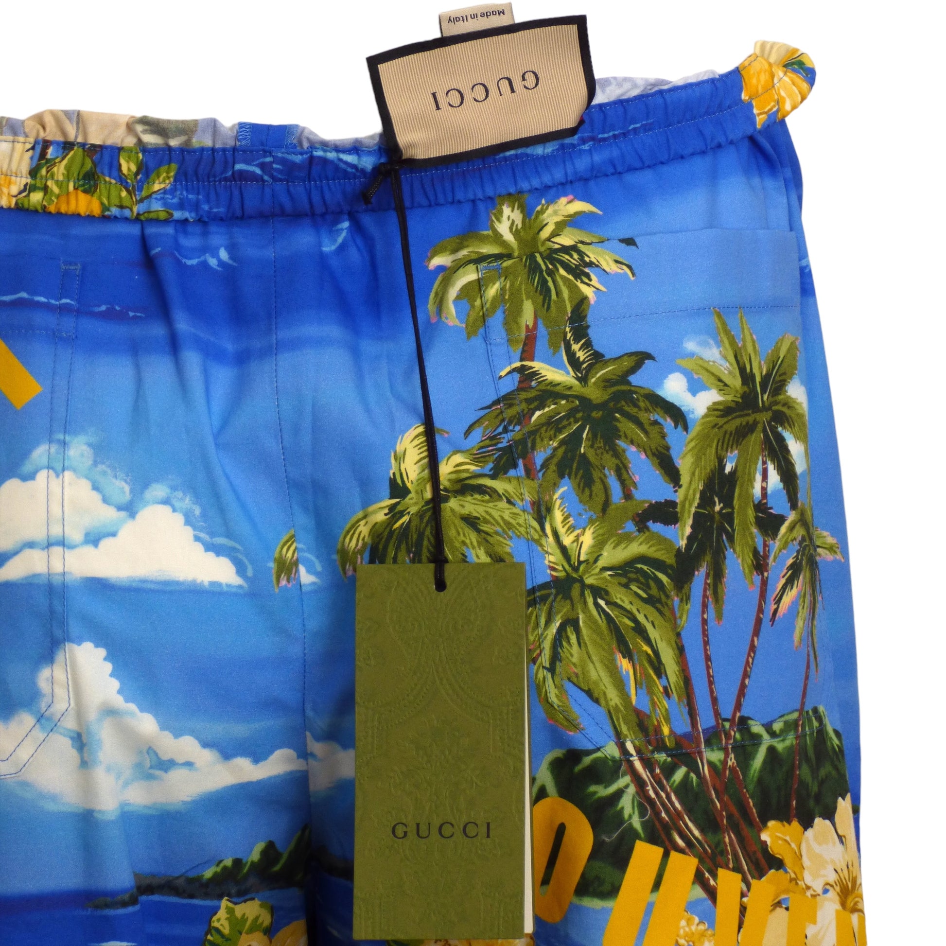Description: Direct from the "Love Parade" collection comes these souvenir dubbed swim trunks in blue with palm trees, hibiscus and "Souvenir from Los Angeles, Gucci" printed across the front and back . The trunks have elastic waistbands and a front button closures. Inset pockets at the side seams and patch pockets on the back. Still with the original store tags.
