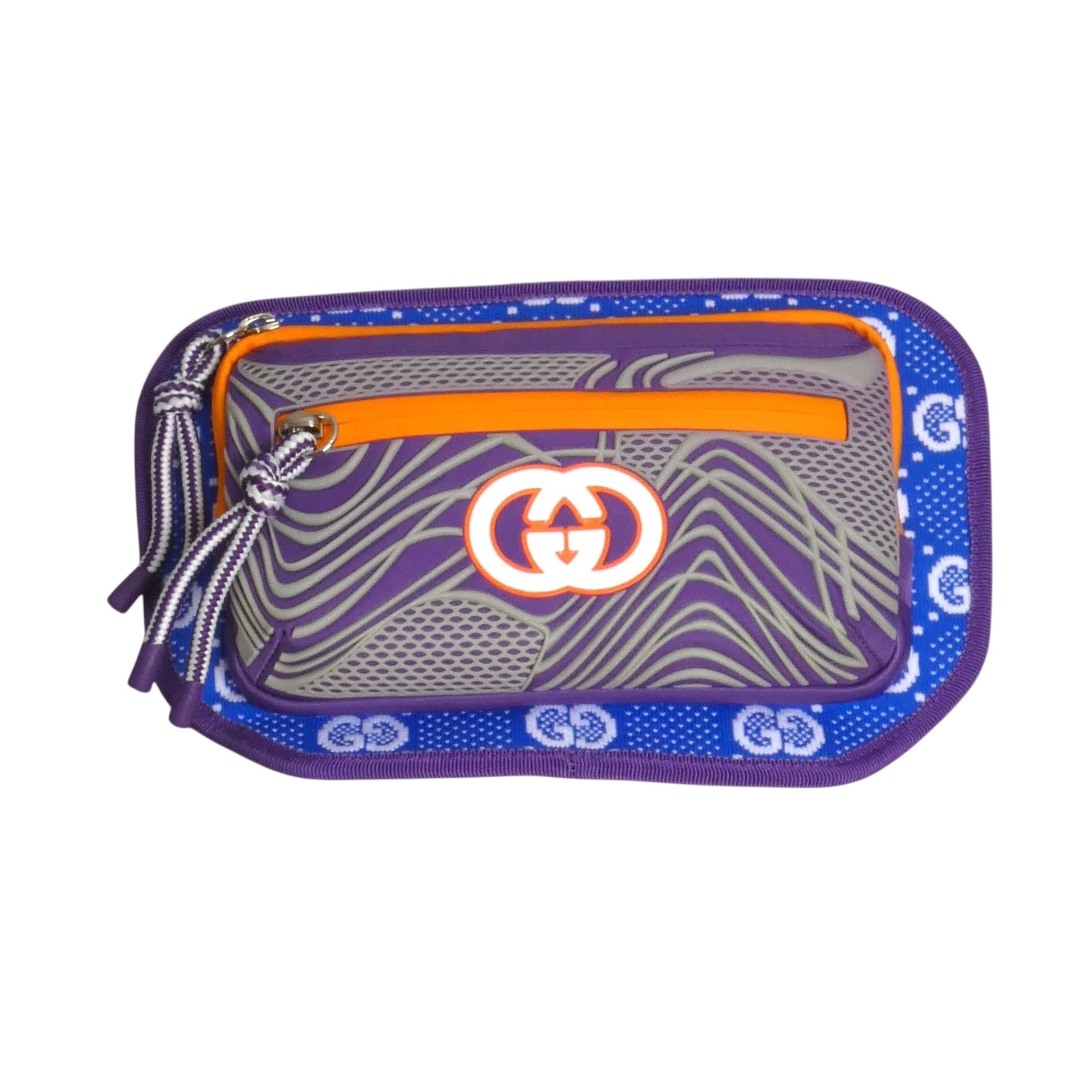 Description: This GUCCI Nylon GG Sporty Belt Bag features a blue jersey fabric base adorned with distinctive multicolor patterns in purple and orange. It includes an adjustable blue fabric belt strap designed to fit comfortably around the waist. The main compartment, secured by a zipper, reveals a spacious interior lined with blue nylon fabric.