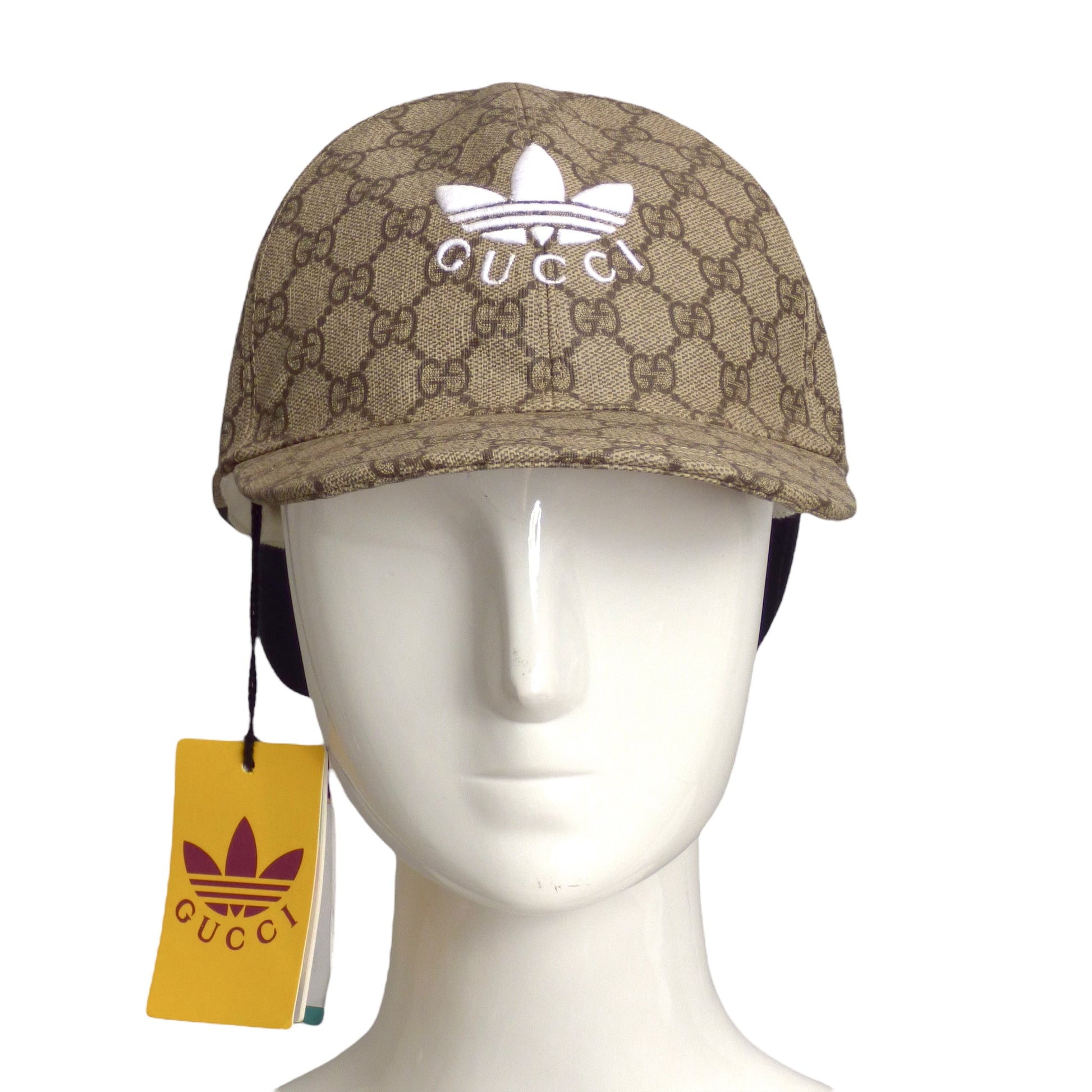 Description: Elevate your style game with the unique double-cap. One side features the iconic Adidas logo stitched in bright white on a deep blue twill fabric, while the other boasts the luxurious Gucci x Adidas logo on a supreme treated canvas. With original store tags attached and a price of $1,050.00, this cap is a must-have for fashion enthusiasts. Don't miss out on this fabulous accessory from the highly coveted collaboration between two iconic brands!