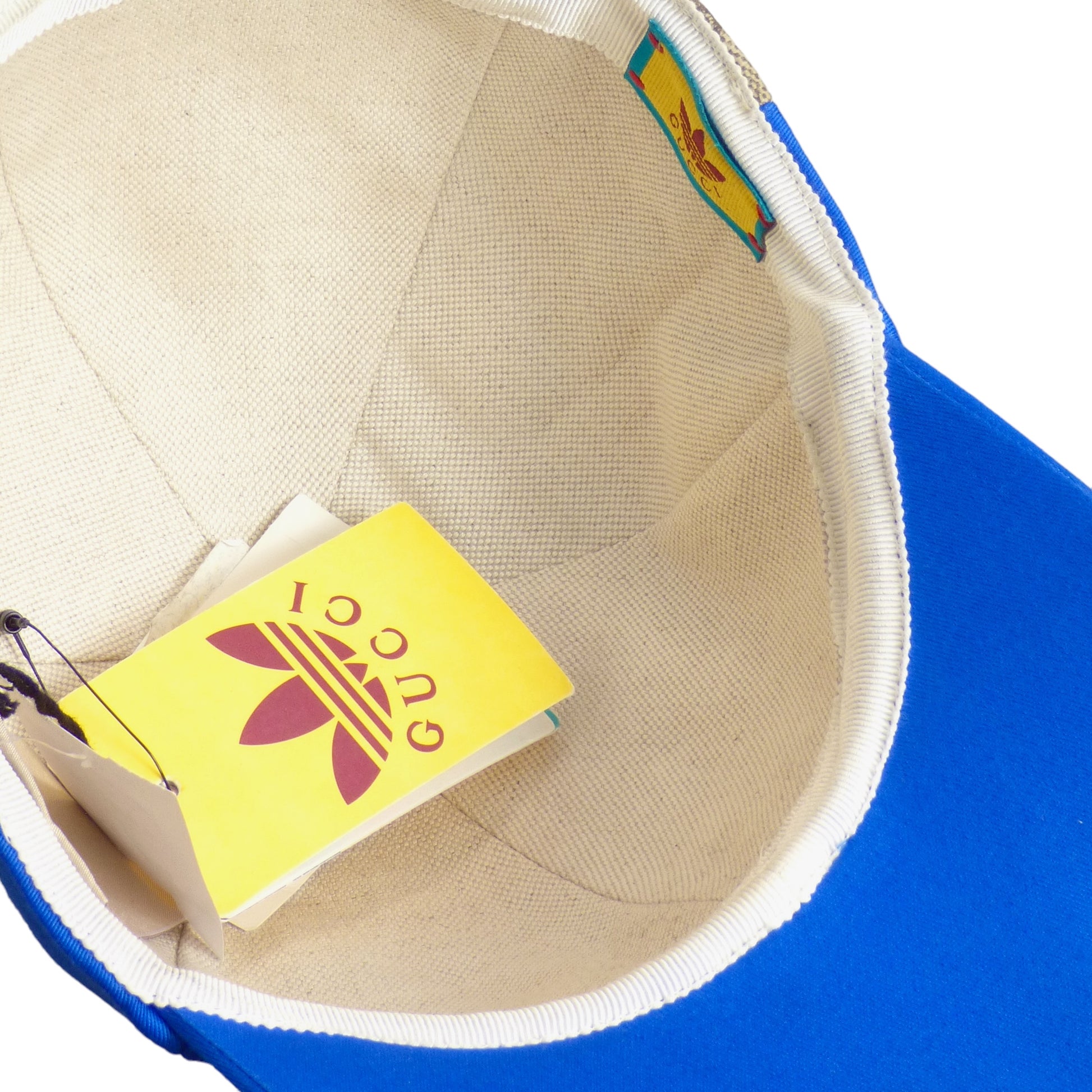 Description: Elevate your style game with the unique double-cap. One side features the iconic Adidas logo stitched in bright white on a deep blue twill fabric, while the other boasts the luxurious Gucci x Adidas logo on a supreme treated canvas. With original store tags attached and a price of $1,050.00, this cap is a must-have for fashion enthusiasts. Don't miss out on this fabulous accessory from the highly coveted collaboration between two iconic brands!