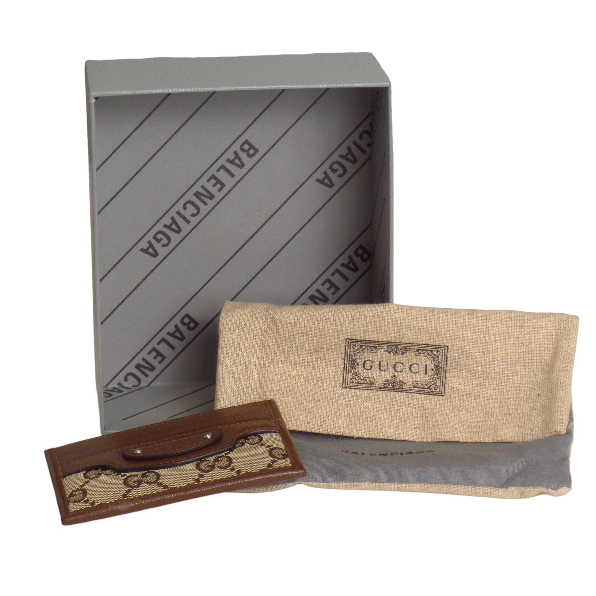 Description: Indulge in ultimate luxury with the Balenciaga x Gucci Hacker Card Holder, a must-have from the anniversary Aria collection. Made with rich brown leather and striking supreme printed canvas, this piece displays the iconic Balenciaga logo on sleek silver brads. Complete with a dust bag and box, it's a true masterpiece for fashion enthusiasts.