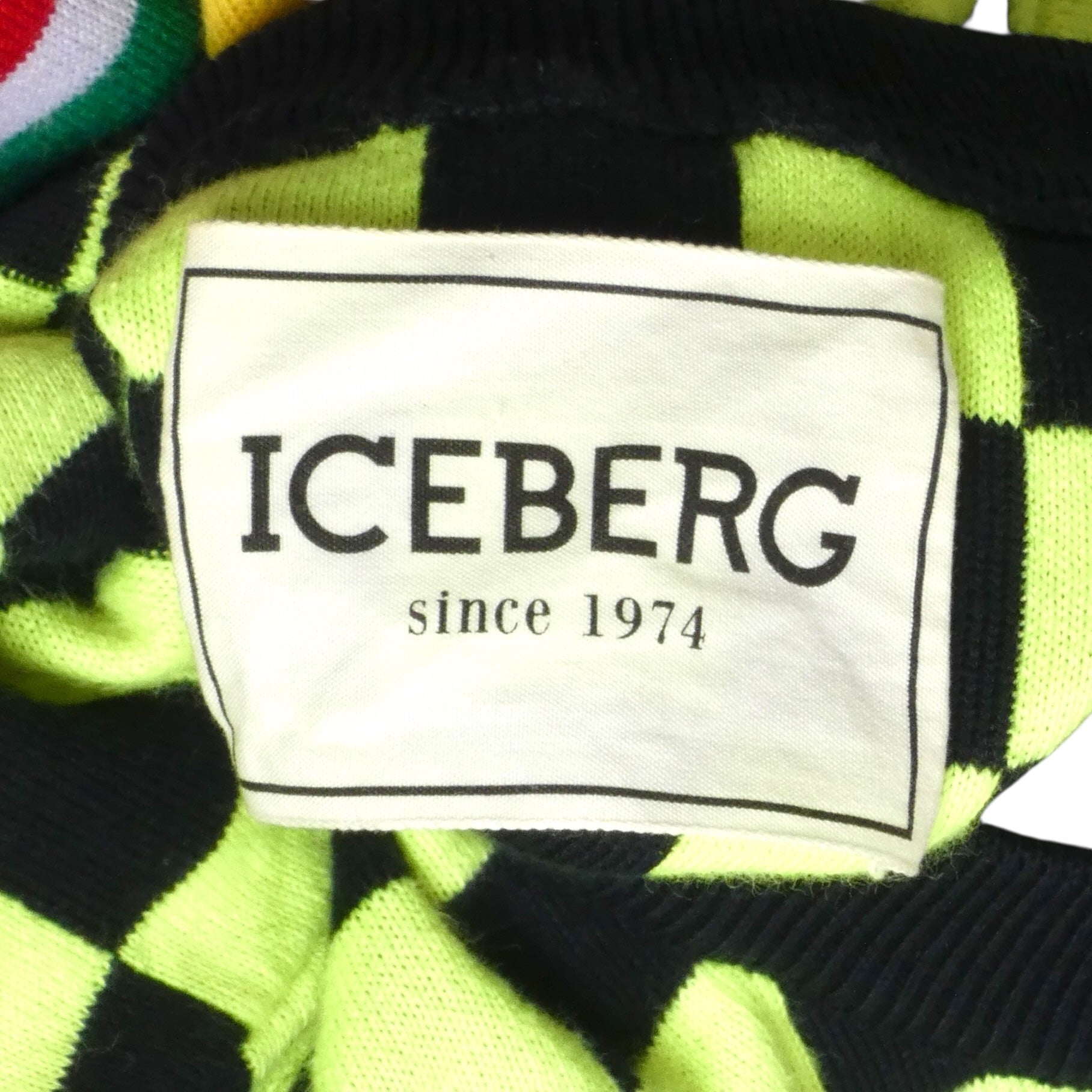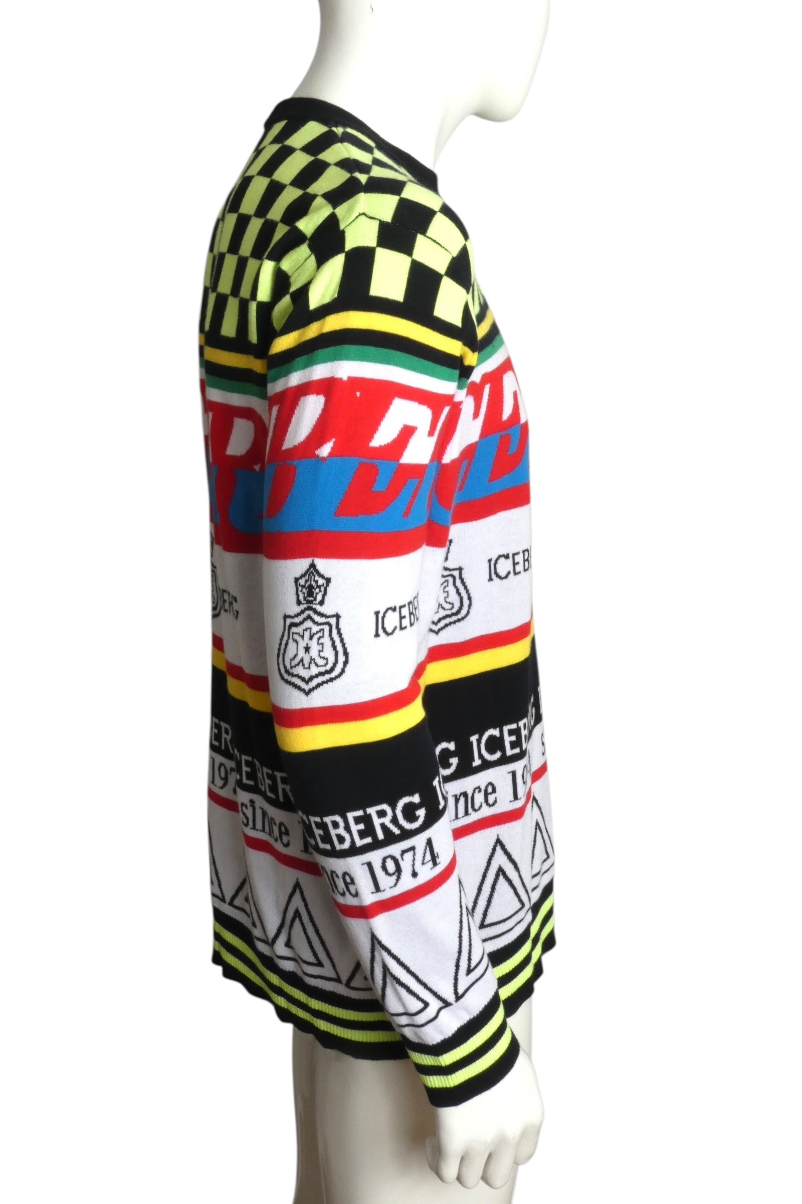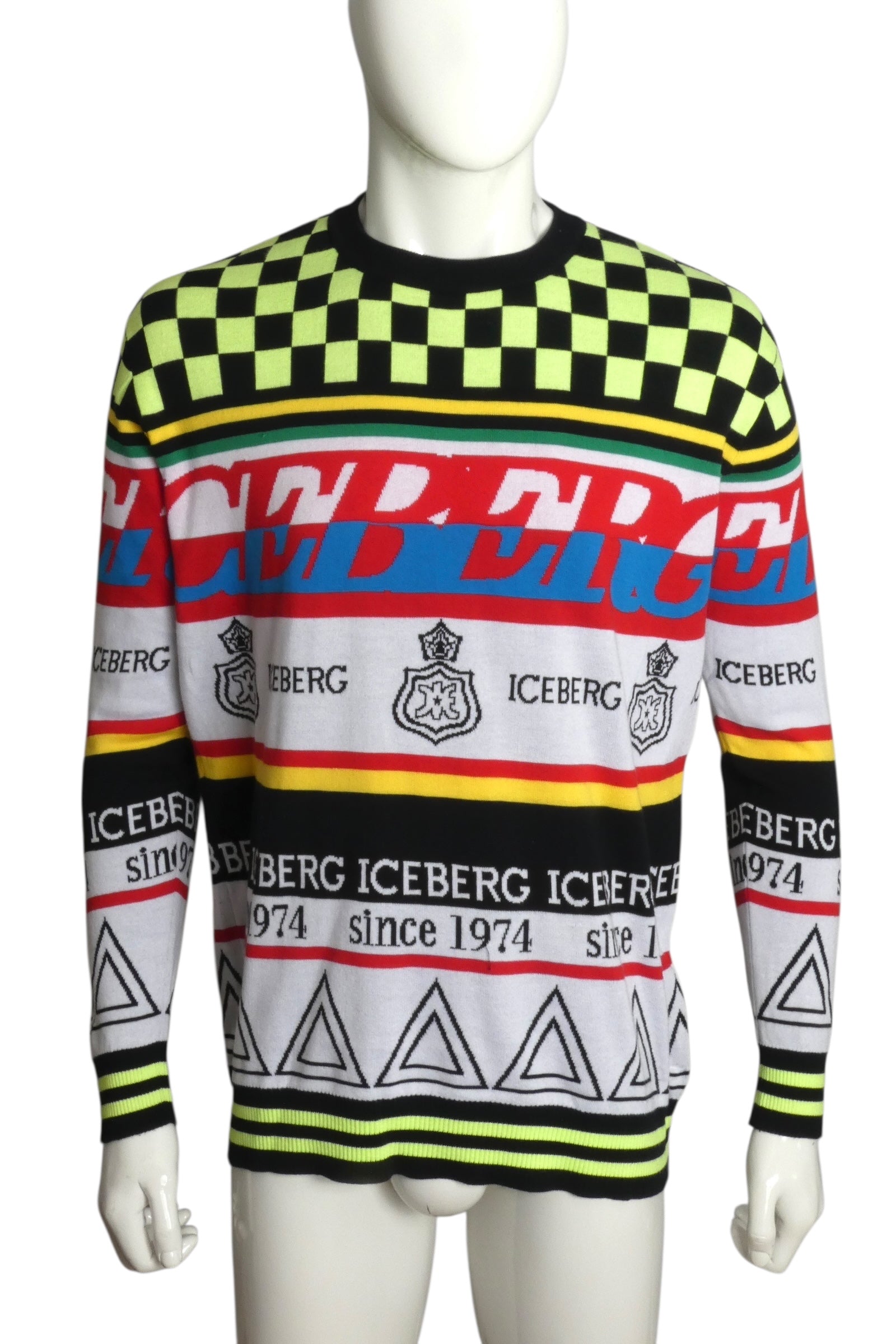 Description: Elevate your casual rotation with this iconic Iceberg sweater from the Spring/Summer 2019 collection. Crafted from soft cotton, this crew-neck piece showcases the brand's signature bold aesthetic with a striking checkerboard pattern across the shoulders and chest, paired with the legendary "ICEBERG since 1974" graphic. A true statement piece from the Italian luxury house, it's perfect for adding retro-inspired flair to everyday looks. Size Large.