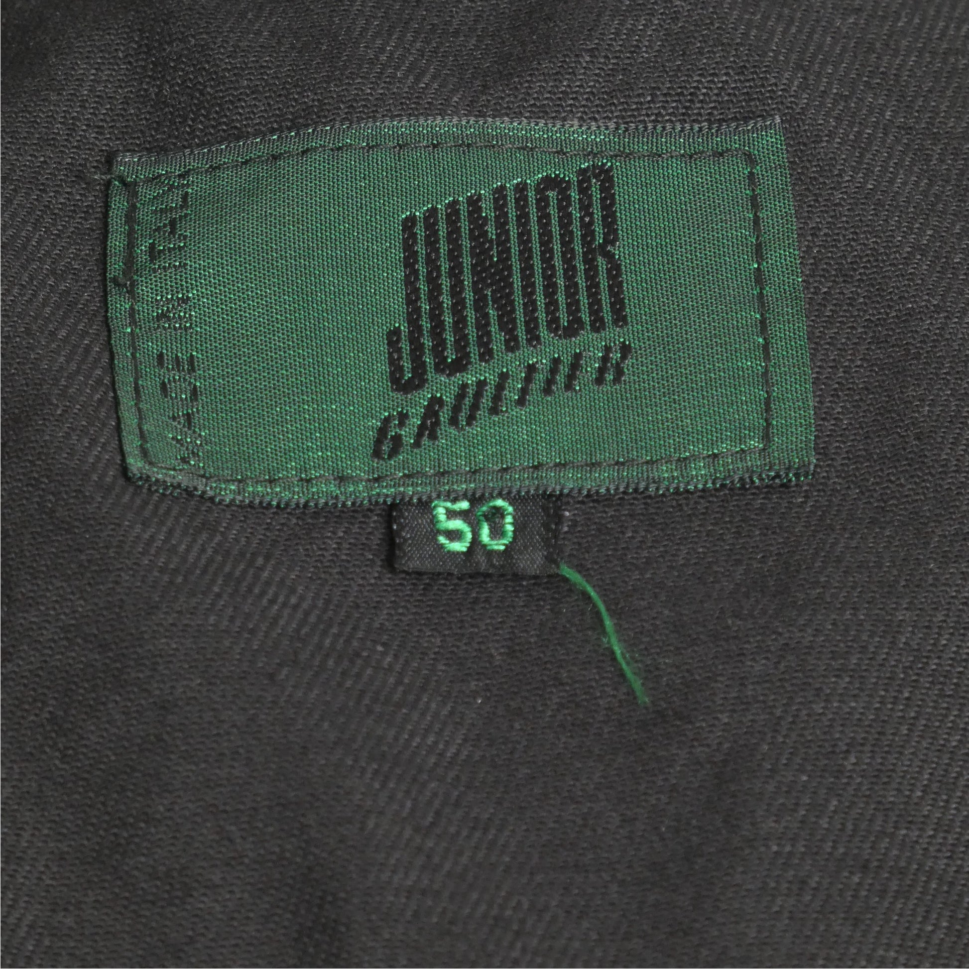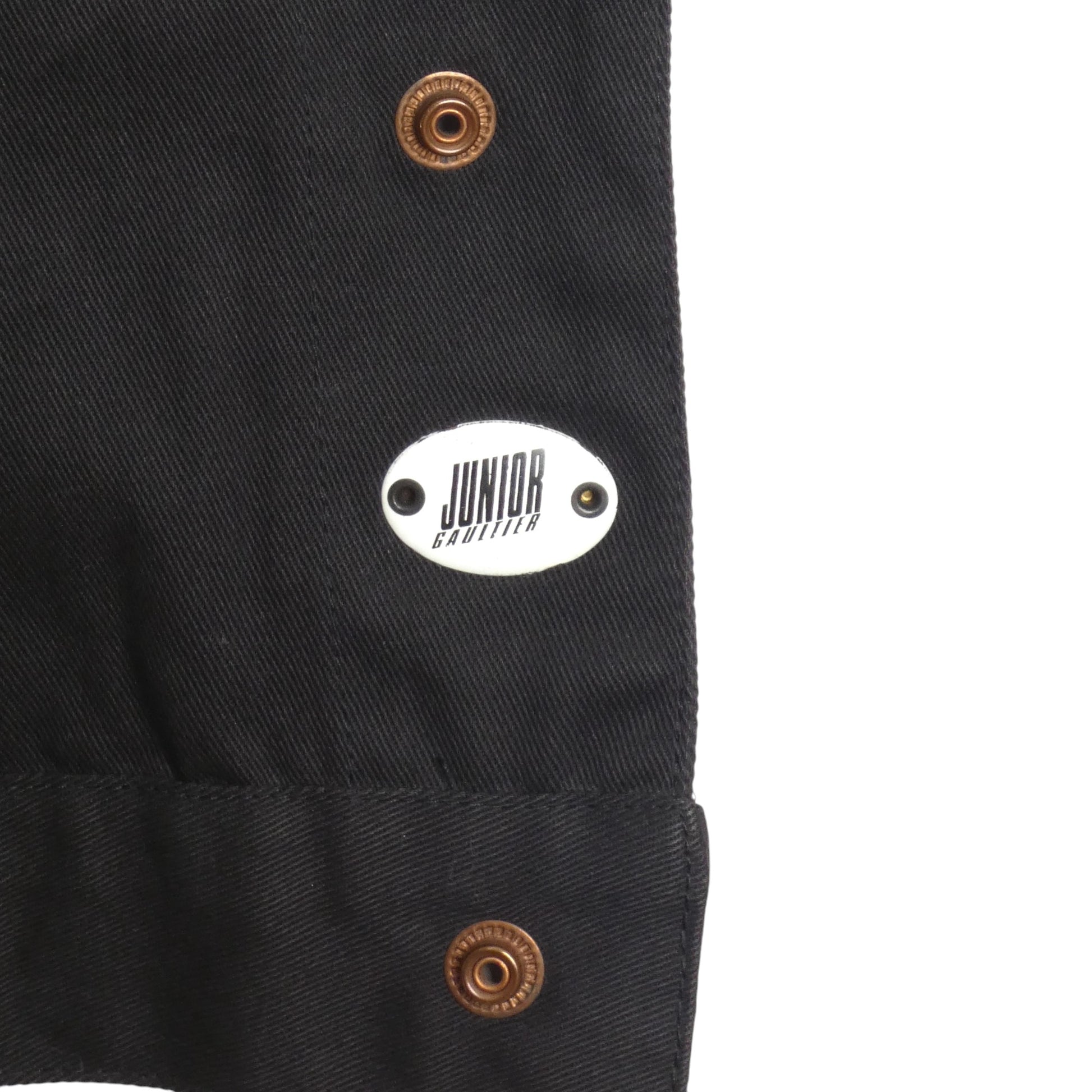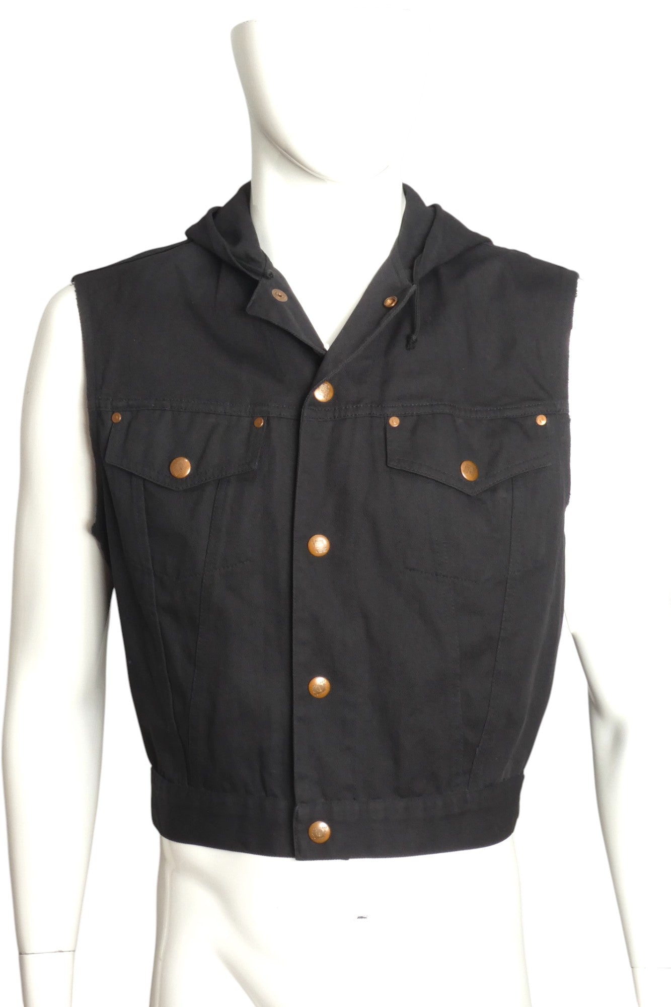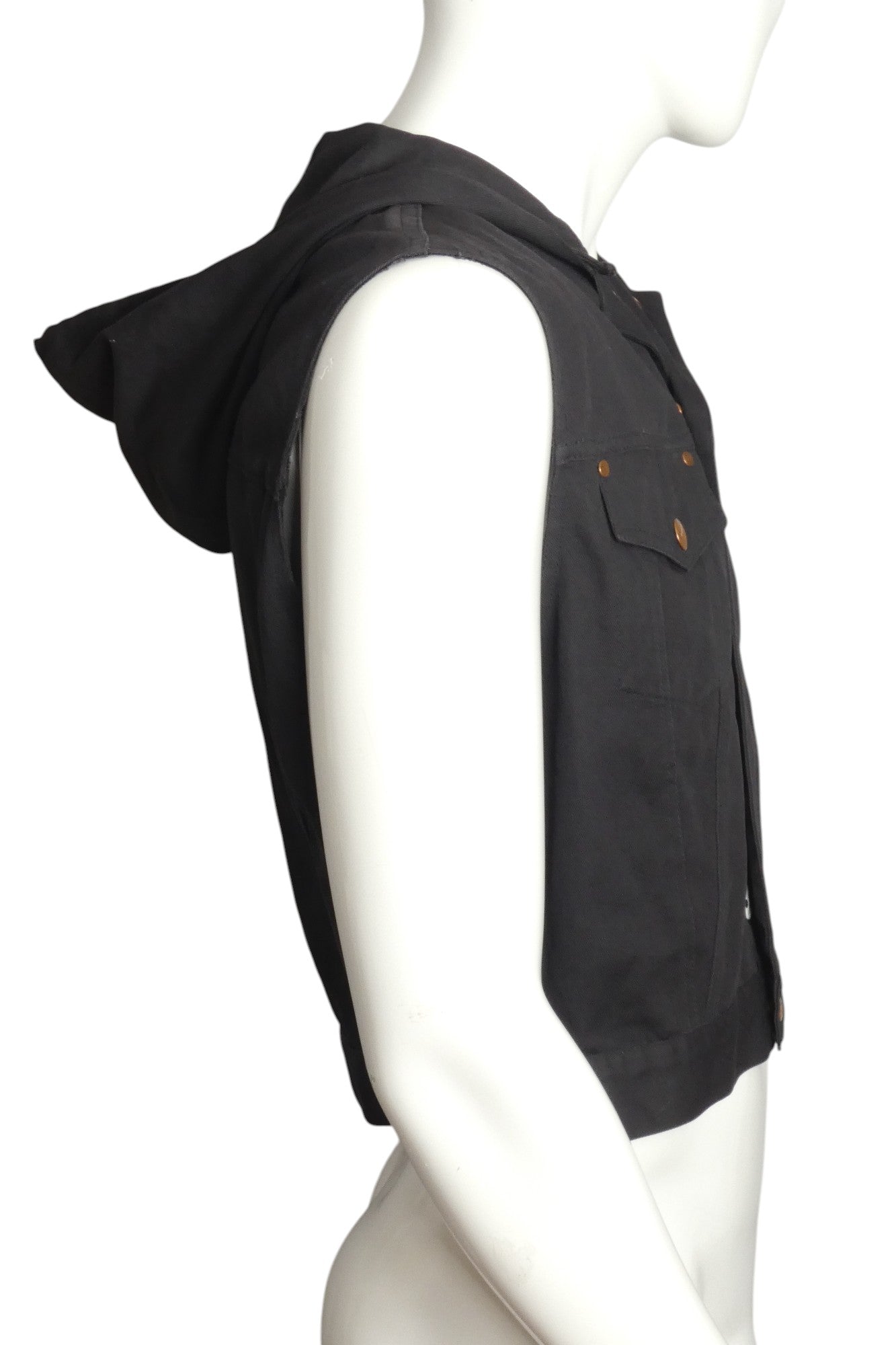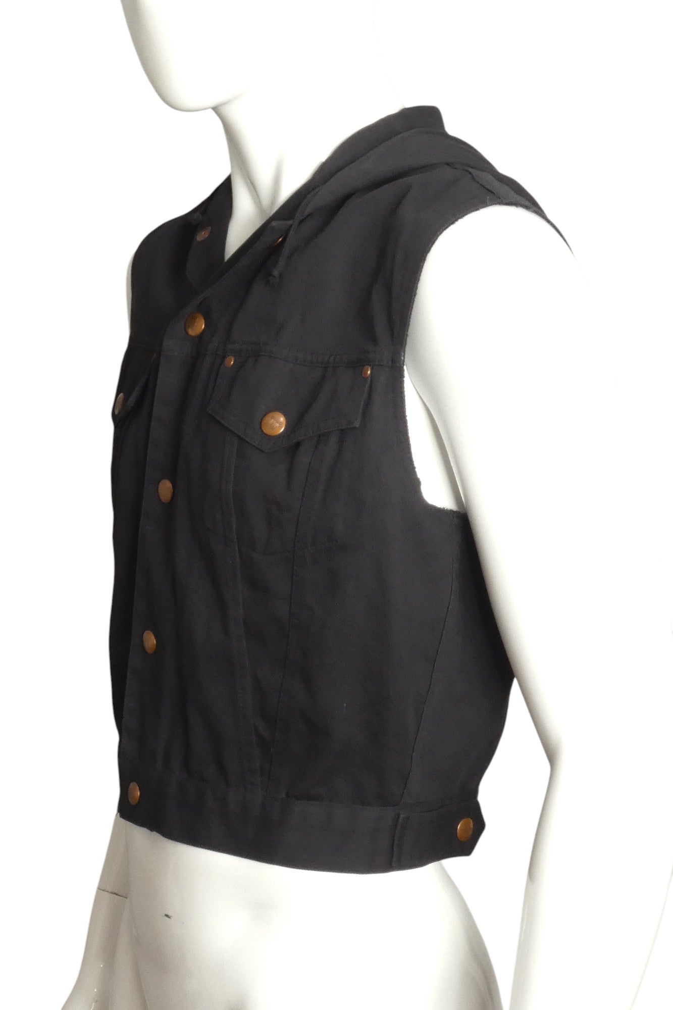 Description: This striking denim vest from the early Junior Gaultier collection features a black wash and an attached hood for a stylish edge. It fastens with snap closures along the front and includes two chest pockets secured with snap-flap closures, combining fashion with practical details.
