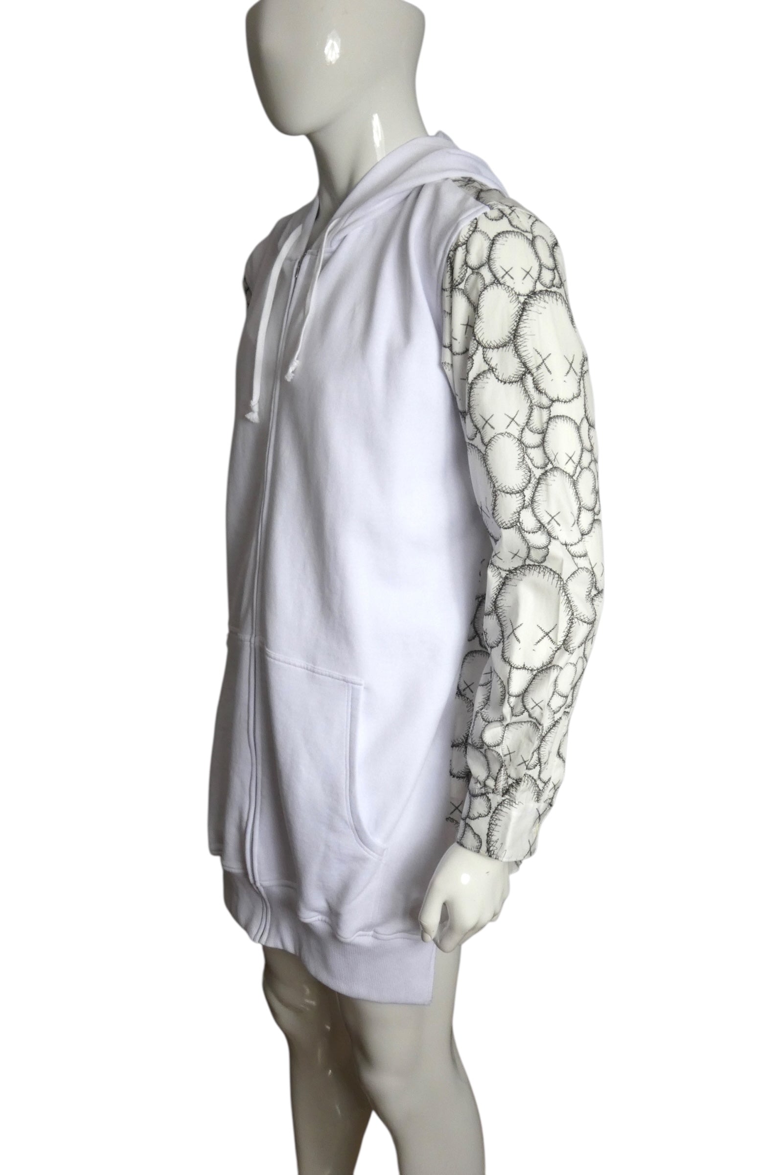 Description: This KAWS x Comme Des Garçons hoodie is pure provocation wrapped in cotton. The white and grey colorway features a commanding all-over graphic print that transforms streetwear into gallery-worthy statement wear. Engineered for those who demand substance: drawstring hood, front zip fastening, long sleeves with elasticated cuffs, and strategically placed side pouch pockets. The elasticated hem seals the fit. Still bearing original store tags from 2021, this Size XL piece represents a rare collision between fine art and street culture—a moment frozen in time for collectors who refuse to play it safe.