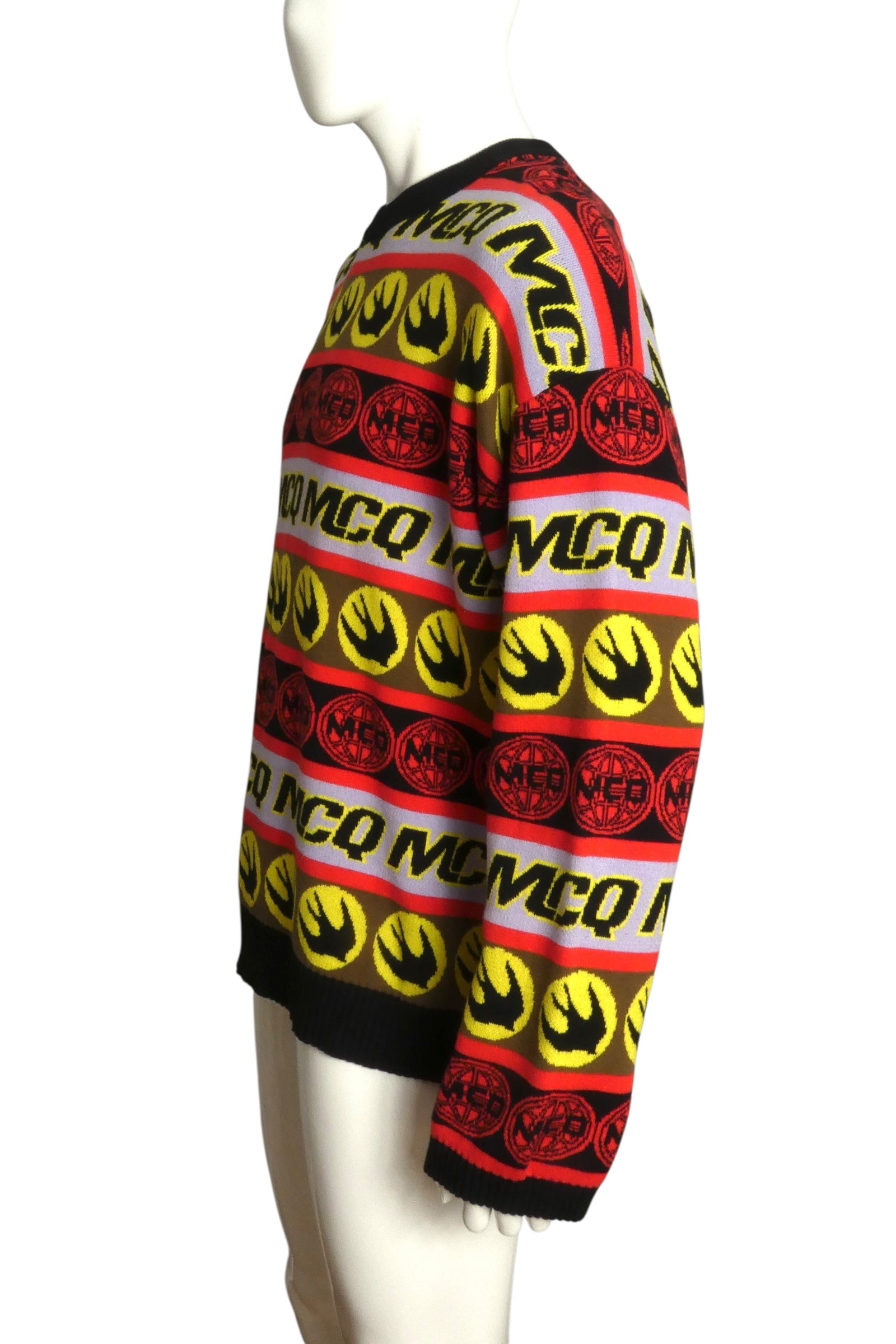 Description: This 2019, MCQ cotton sweater showcases vibrant, alternating stripes of varied patterns and colors, embodying a lively spring aesthetic. Designed with a black knit neckband, wrists, and hemline, it offers a clean, structured finish that balances its bold graphic print. Crafted for both visual impact and comfort, this sweater makes a distinctive statement while remaining versatile for seasonal layering.