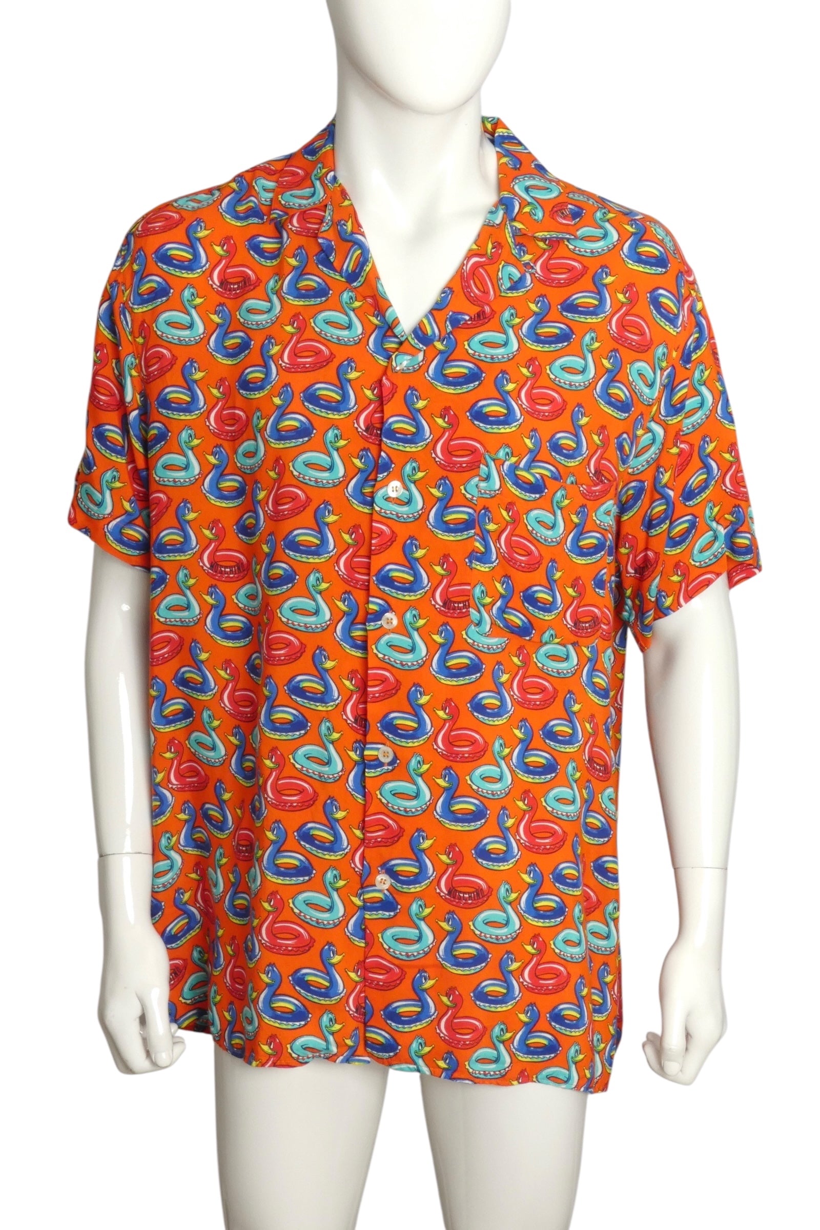 Description: Step back into the ’90s with this oversized MOSCHINO camp shirt, bursting with bright orange and playful duck pool float prints. Featuring a laid-back spread collar, front button closures, and a large chest patch pocket, it’s perfect for adding a fun splash to your summer style. Sized large for that easy, roomy fit—ready for poolside lounging or casual streetwear with a cheeky twist.