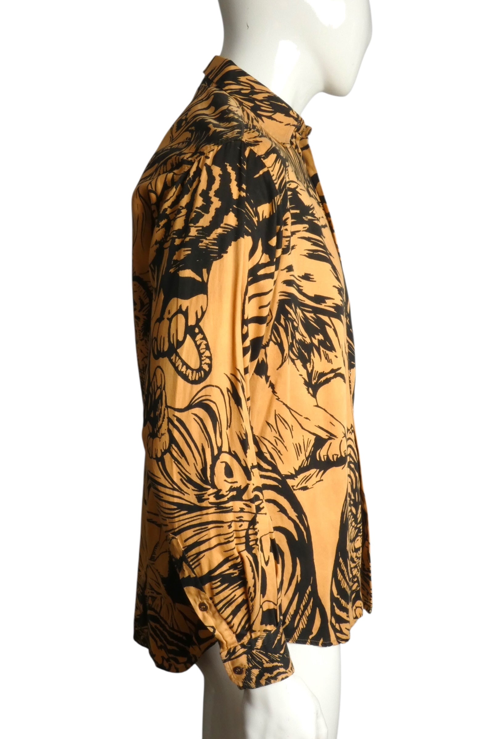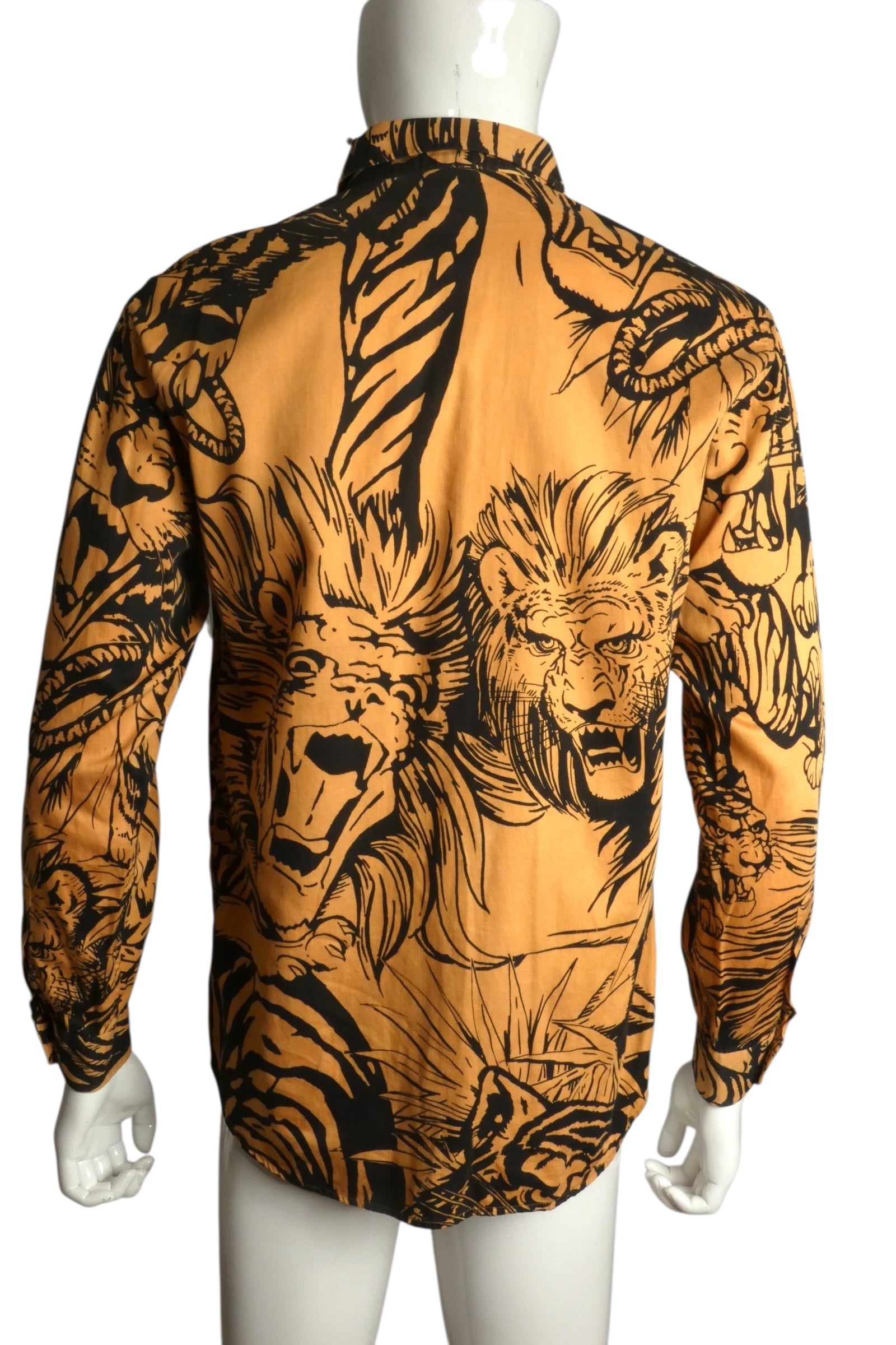 Description: Unleash your wild side with this fearless 1990s Moschino Cheap & Chic cotton shirt featuring a striking comic-style illustration of prowling lions in the jungle. The bold orange and black palette commands attention, while the compact collar and front button closure deliver understated sophistication. Long sleeves with button cuffs complete the look with vintage precision. A rare piece that blends playful attitude with undeniable style.