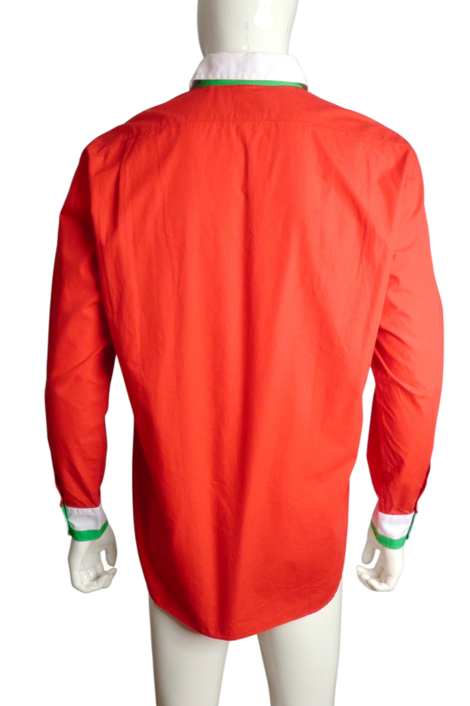 Description: Moschino Cheap & Chic's 1990s watermelon shirt is fruit-inspired irreverence that refuses to be taken seriously. The red cotton base becomes a canvas for black seed accents and green-and-white trim on the collar and cuffs that perfectly evoke a watermelon's natural geometry. A spread collar frames the neck with casual charm, while front buttons deliver straightforward closure. Long sleeves with matching trimmed cuffs complete the playful narrative. This is archive Moschino when the brand was still mining everyday objects for fashion gold—turning something as simple as fruit into a statement piece that makes you smile every time you wear it.