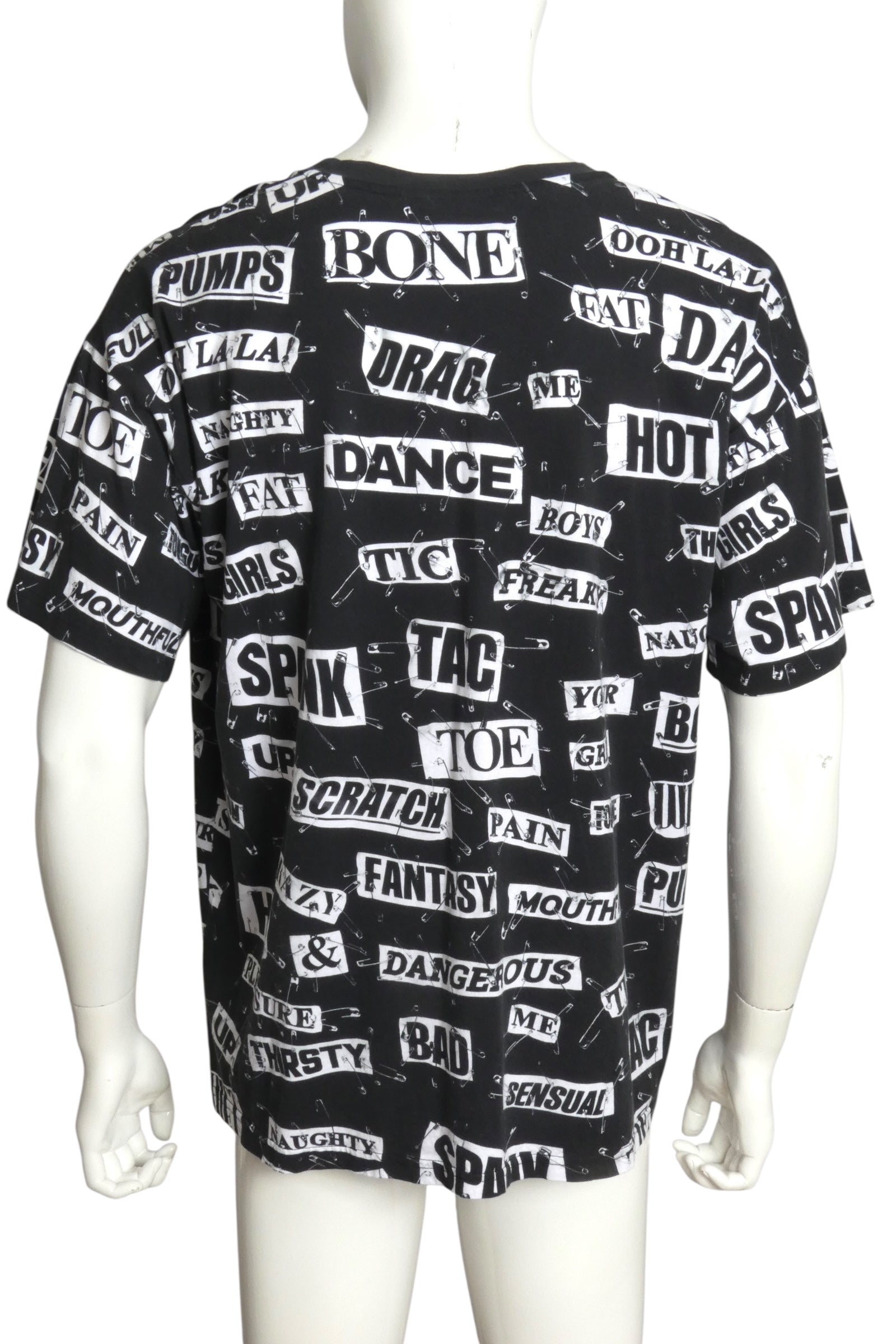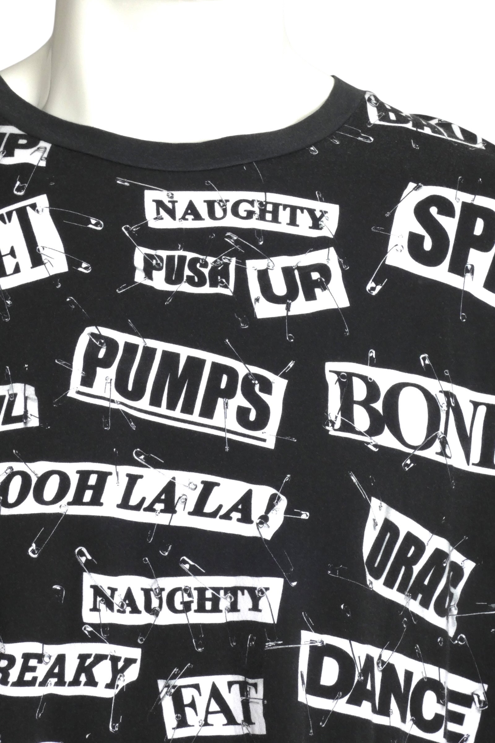 Description: From the Pre-Fall 2018 collection, this black and white cotton t-shirt features a playful graphic of tag descriptions safety pinned to the front. Designed for a fun, edgy look, this tee adds a quirky twist to your casual wardrobe.