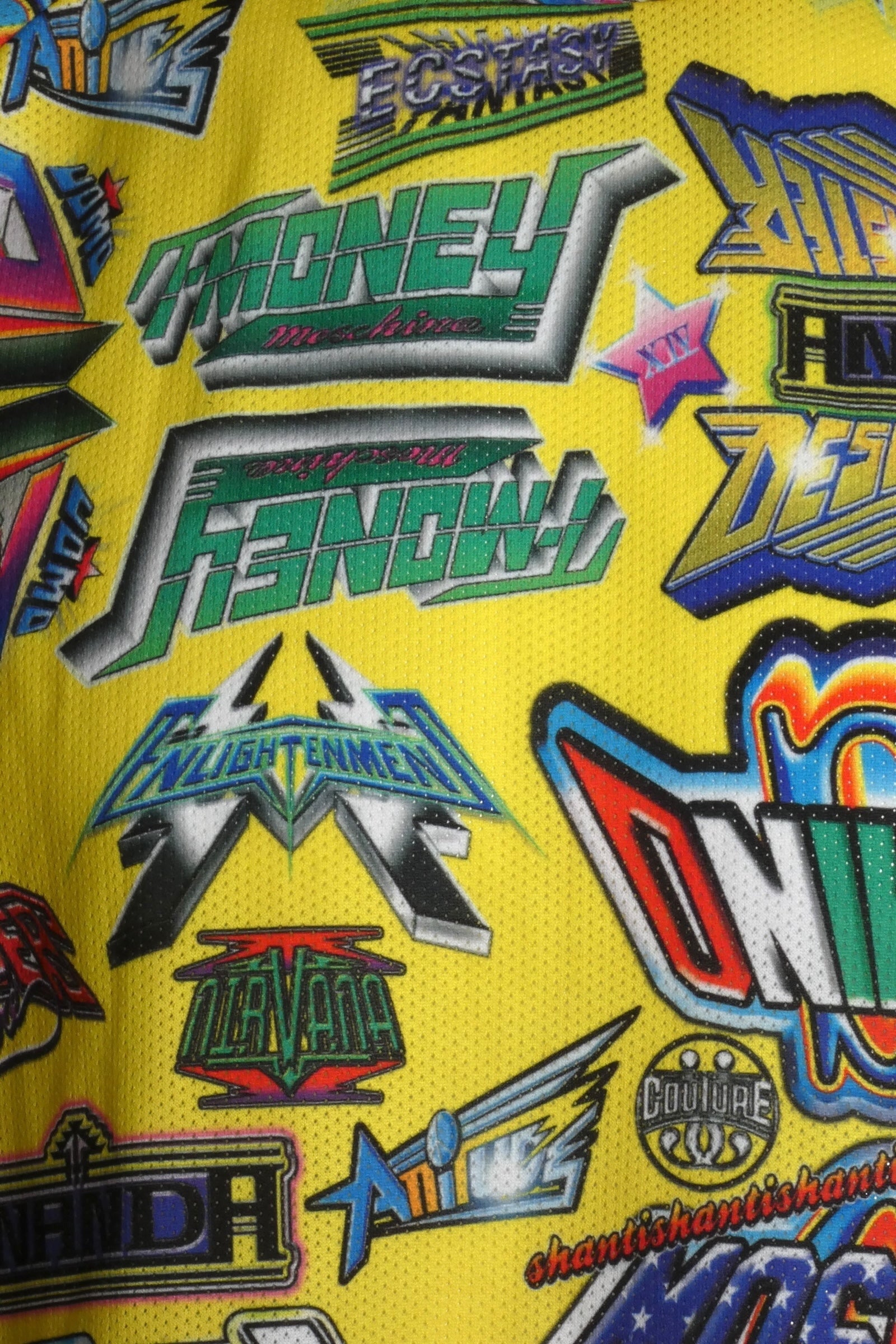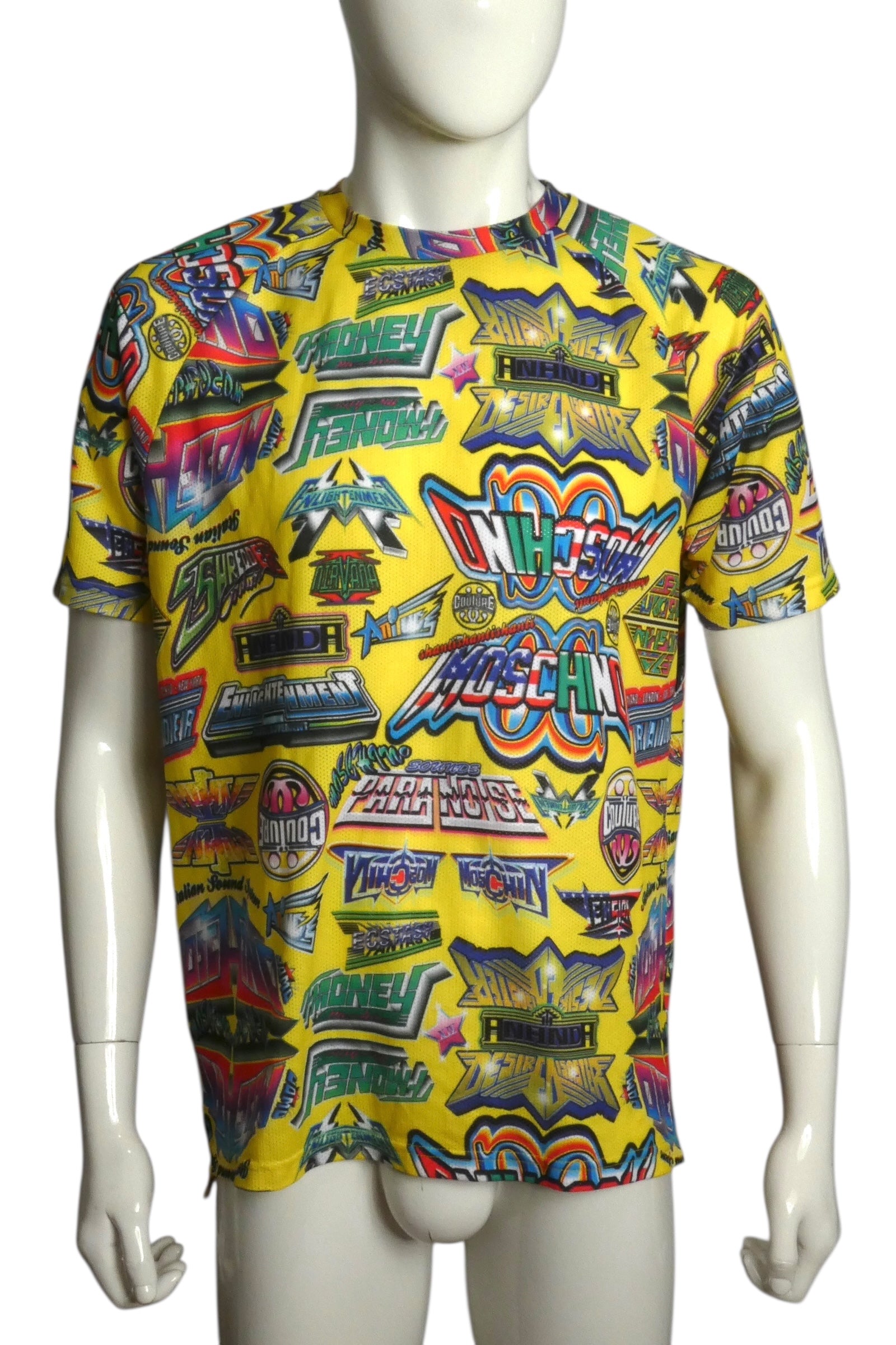 Description: Make a statement in this striking Moschino Couture mesh tee featuring a bold yellow base and eye-catching raglan sleeves. The shirt commands attention with its signature logos and graphic text scattered across the front and back, delivering that unmistakable designer edge. Perfect for those who refuse to blend in, this size Large piece brings fearless style and unmistakable luxury branding to any wardrobe. A daring choice for fashion-forward individuals who wear their confidence on their sleeve.