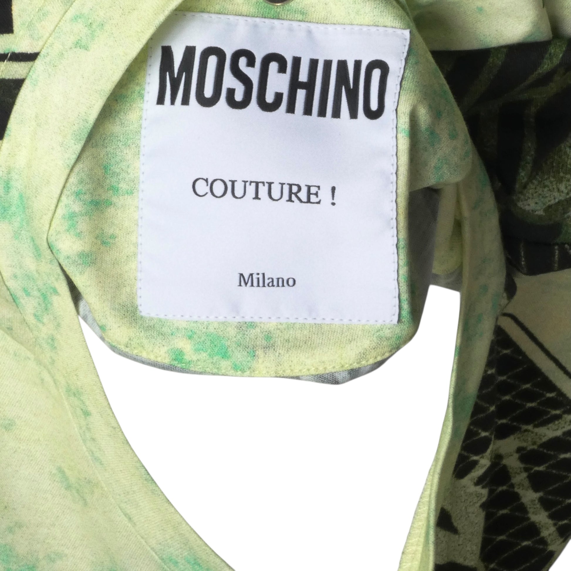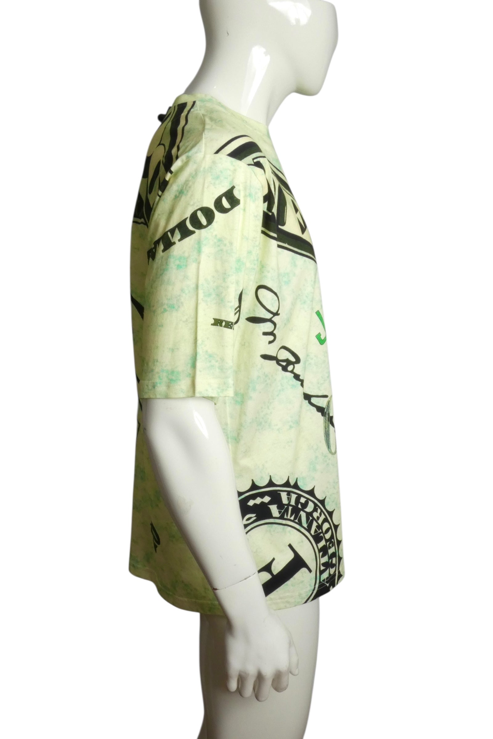 Description: This pre-fall 2023 Moschino Couture cotton t-shirt presents an abstract interpretation of currency through its bold one dollar bill graphic. The design exemplifies the brand's irreverent commentary on consumer culture and wealth. A coveted addition for collectors of the house's conceptual approach to wearable art.