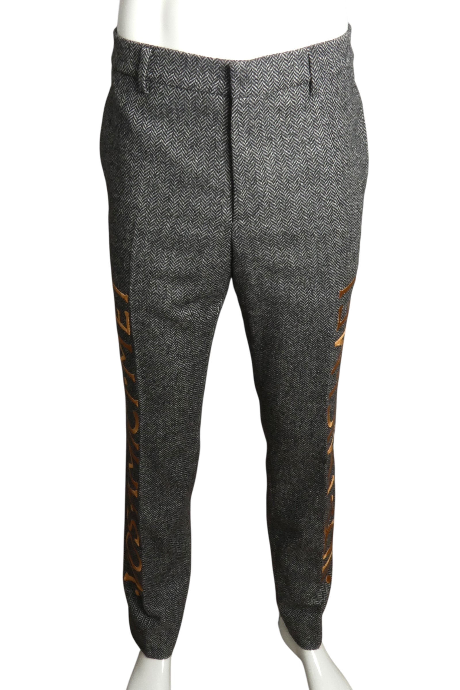 Description: Moschino Couture's 2019 wool herringbone pants command attention with their bold gray tweed construction and audacious gold appliqué detailing. "NOS AMICI MICHEL" and Roman numeral "M" emblazoned down the leg make an unmistakable statement—this isn't subtle luxury, it's couture confidence. The sophisticated herringbone weave pairs perfectly with the daring metallic lettering, creating a piece that refuses to blend in.