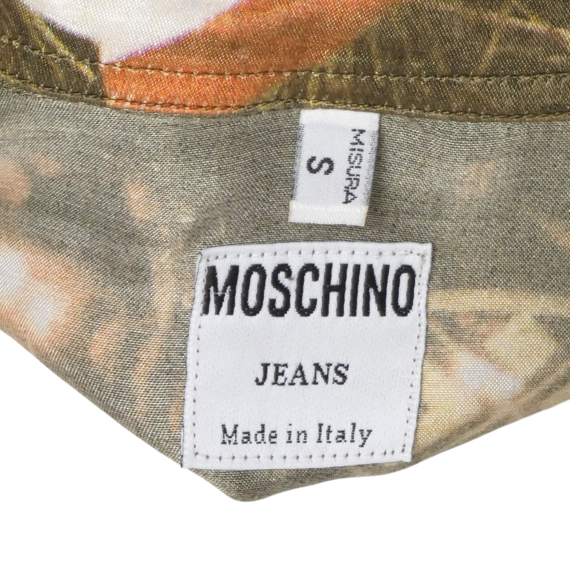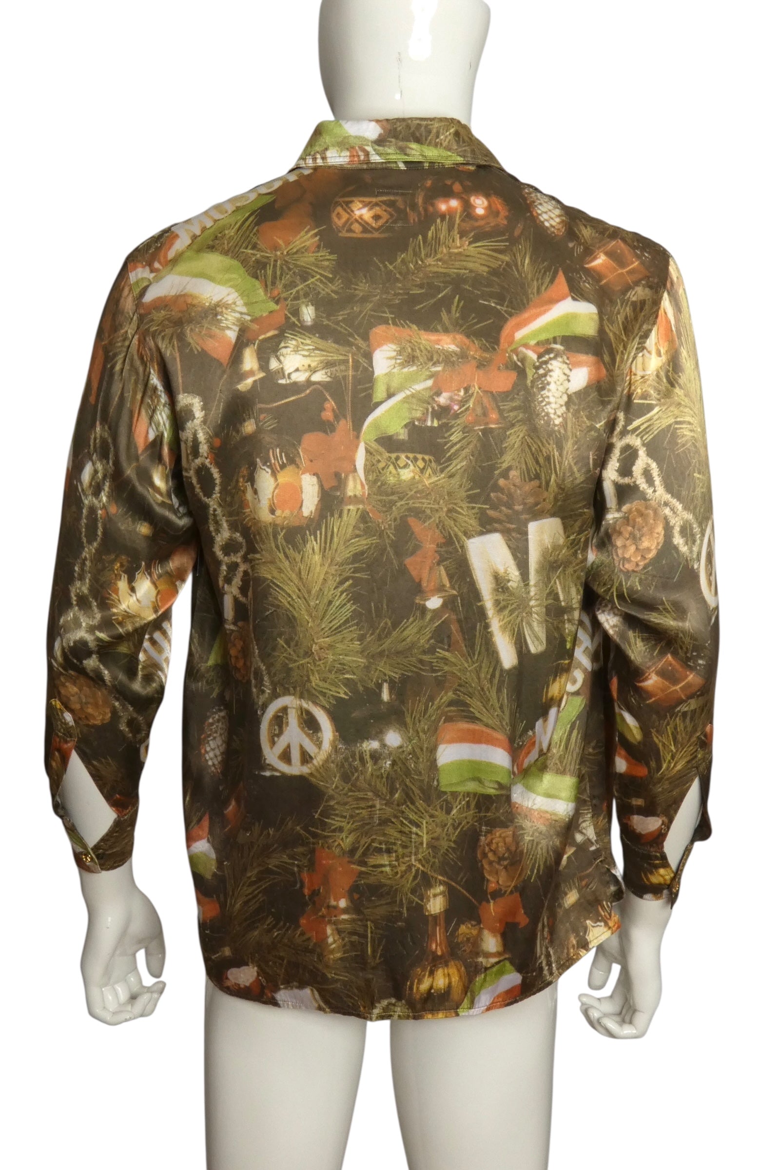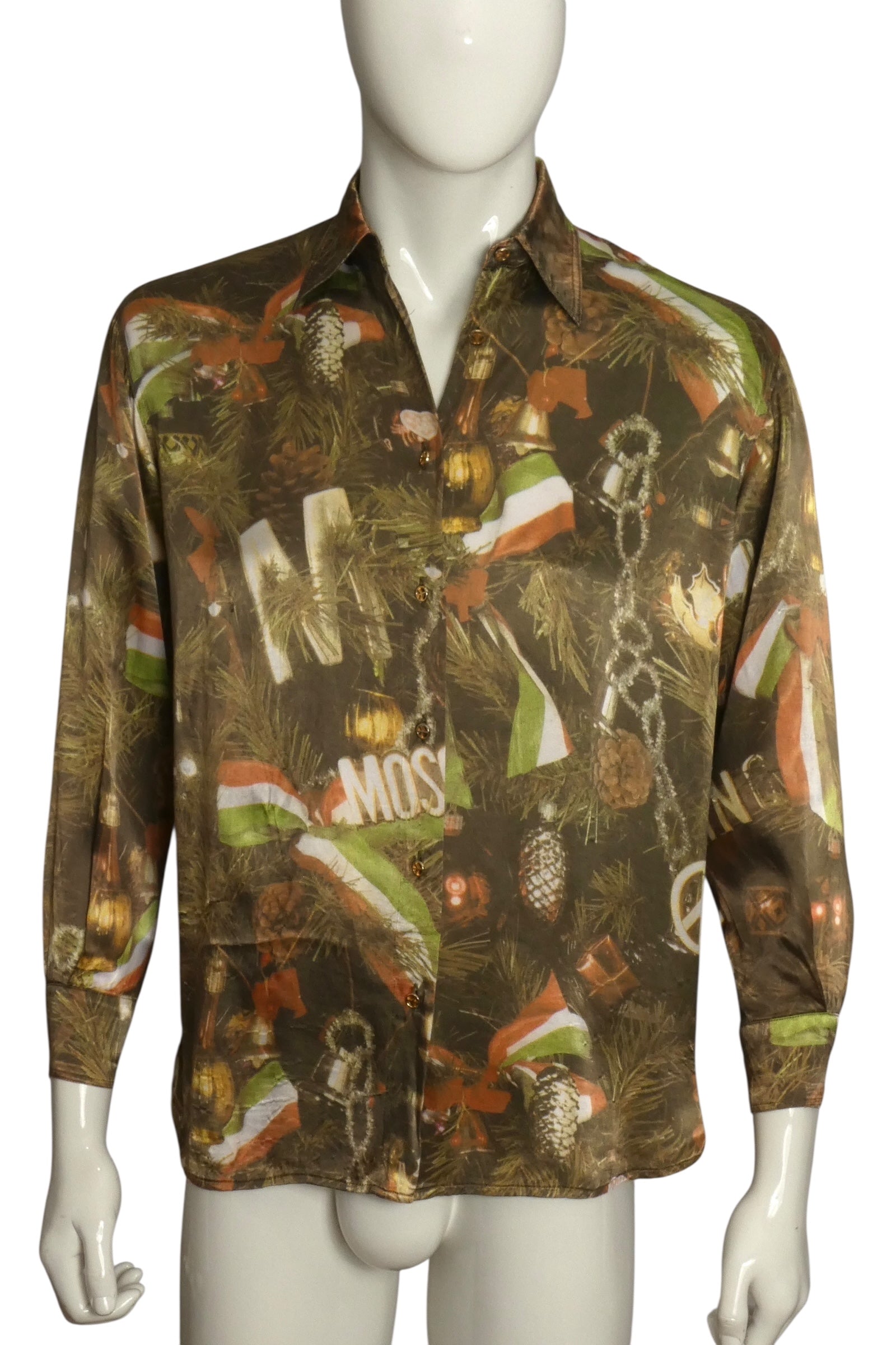 Description: Celebrate the holidays in style with this rare early 1990s MOSCHINO JEANS Christmas Tree print shirt. Made from soft knit fabric, it features festive pine branches adorned with ornaments, Italian ribbons, and sparkling Moschino lights. Gold metal peace sign buttons add a unique touch along the front and cuffs. Perfect for standing out at any holiday party, this size small shirt brings playful charm and vintage flair to your festive wardrobe.