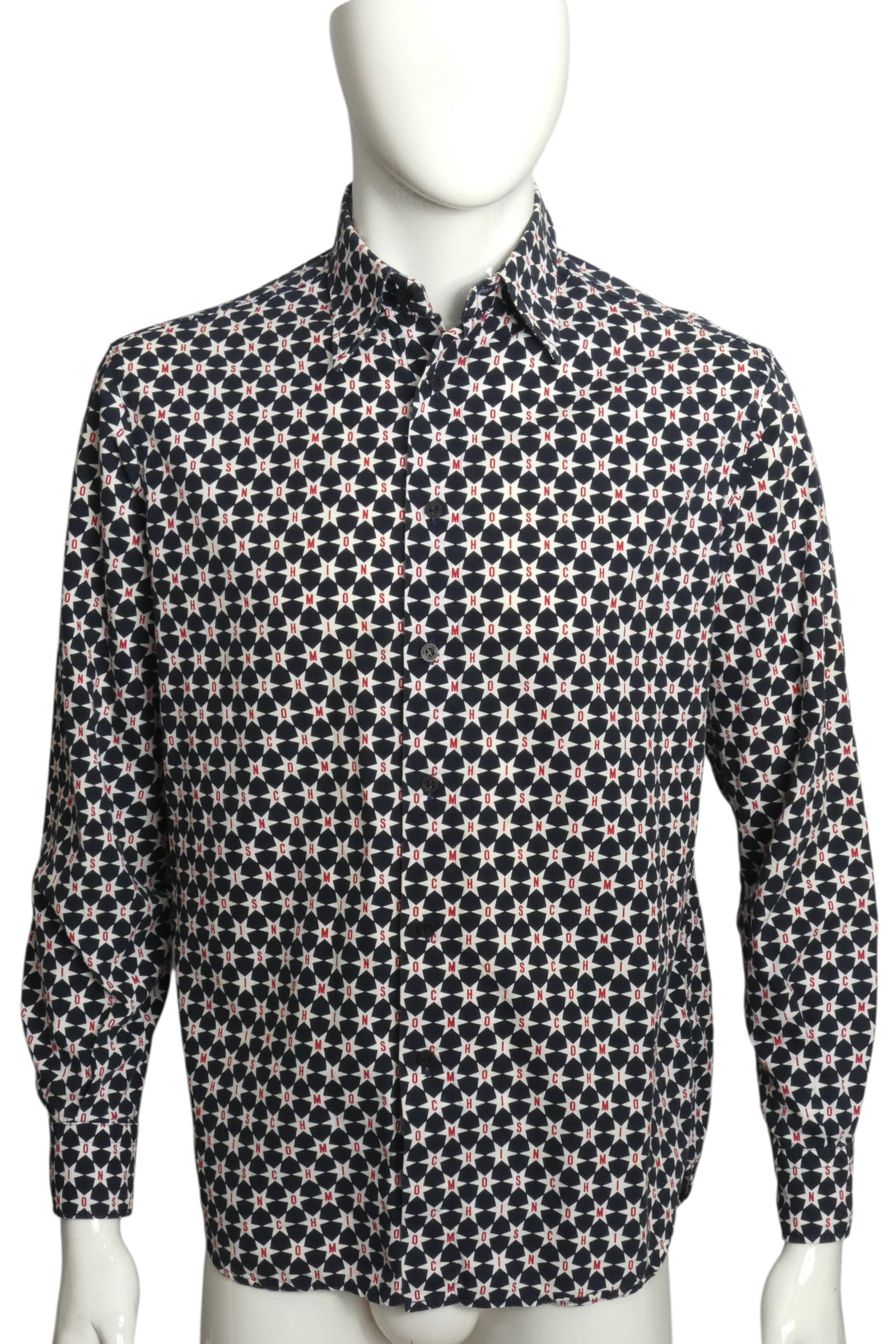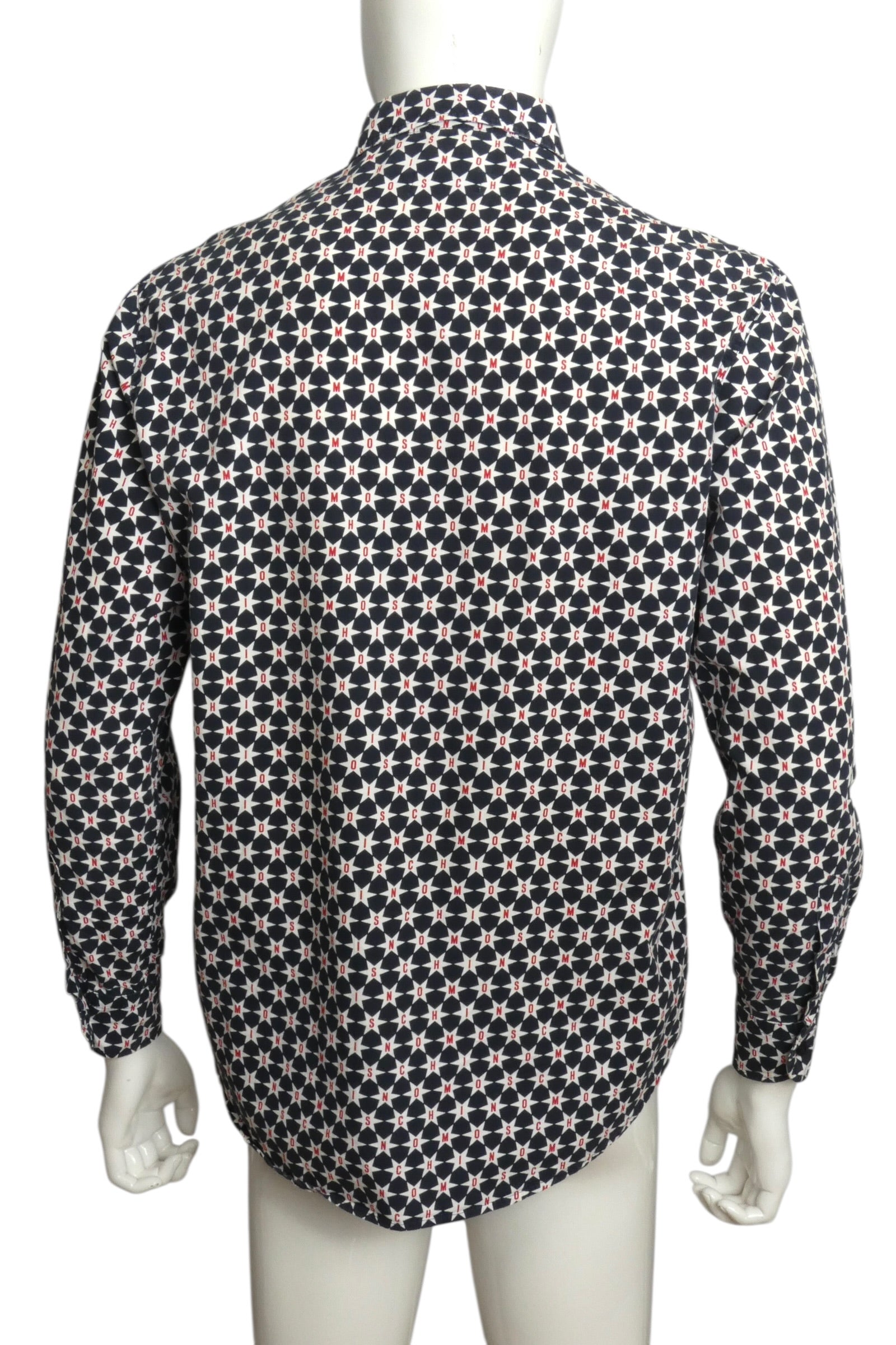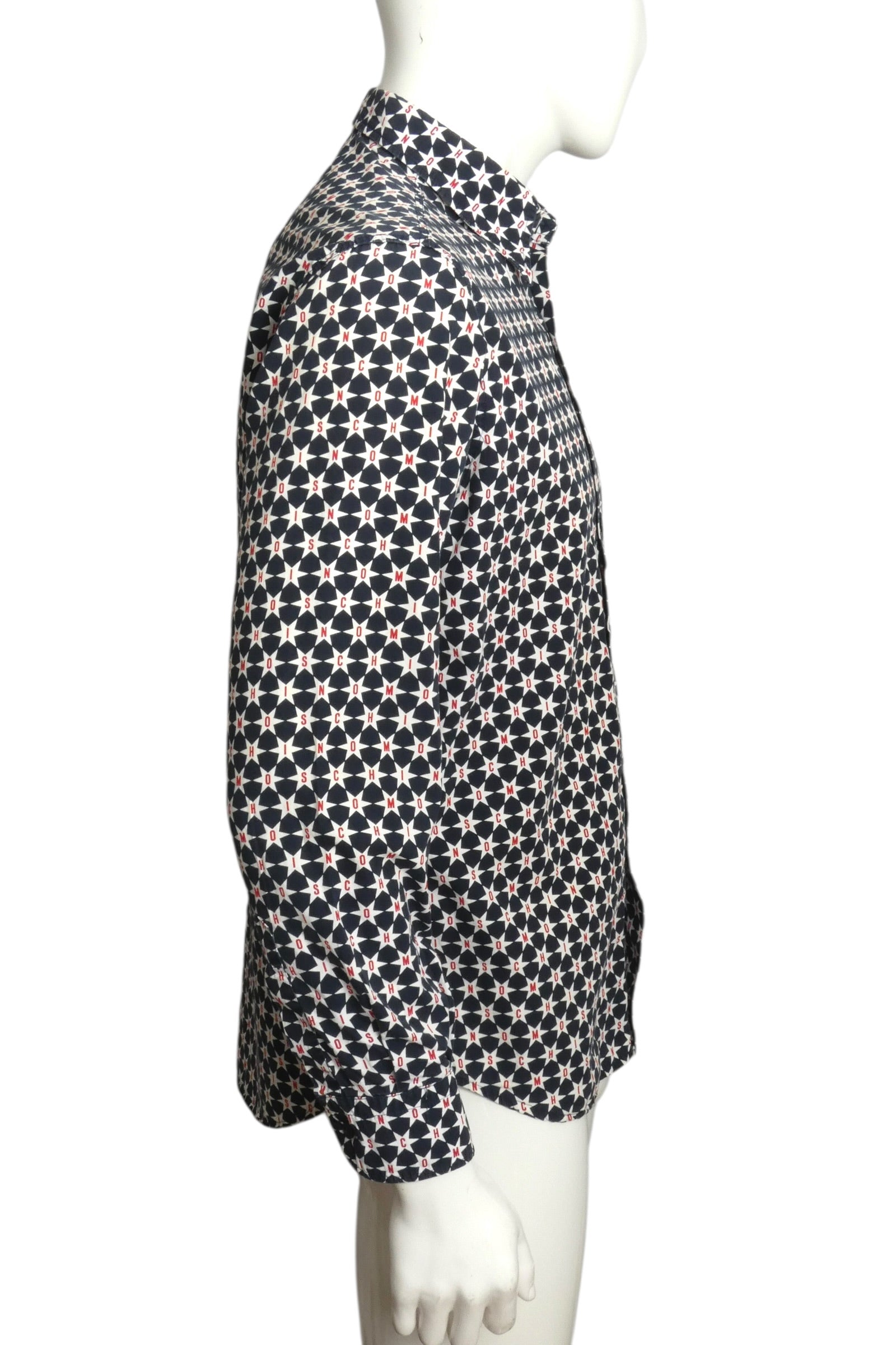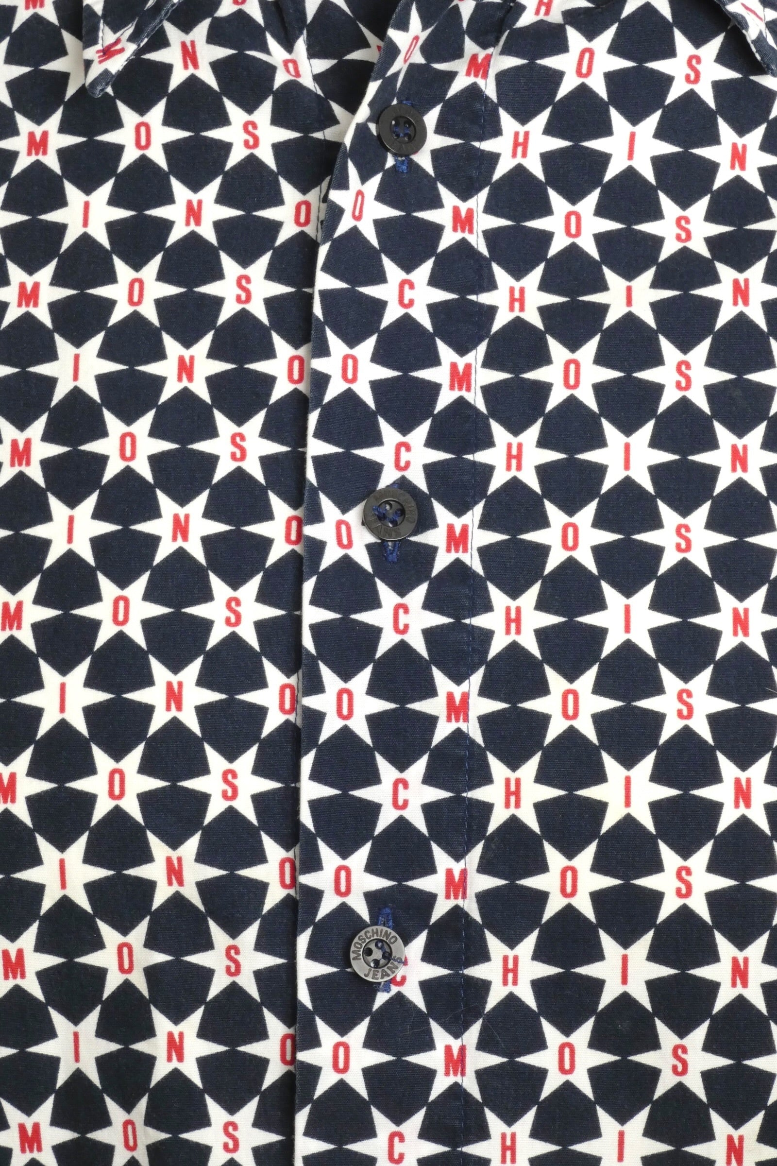 Description: Vintage Moschino Jeans magic from the 2000s! This navy cotton shirt bursts with personality—white stars scattered across the chest and sleeves, each one boldly emblazoned with "Moschino" in vibrant red. Classic button-front closure and adjustable button cuffs keep the look polished. Perfect for anyone who loves statement pieces with retro flair and isn't afraid to show off their designer spirit. A true collector's piece that brings fun, nostalgia, and unmistakable style to any wardrobe.