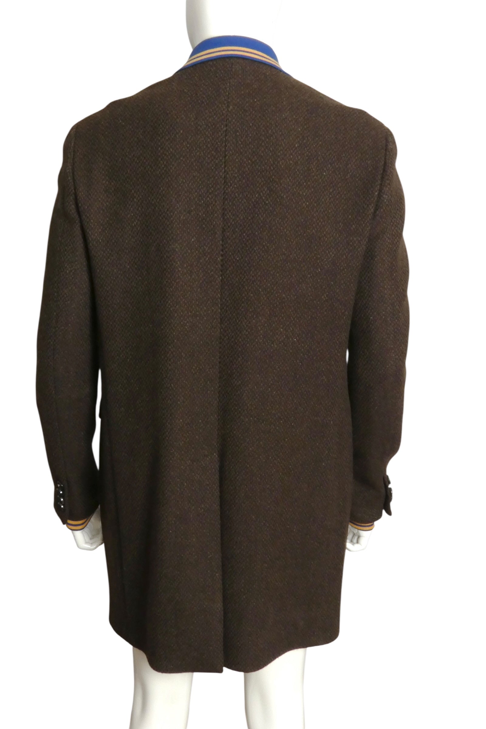 Description: This eye-catching brown wool coat features a unique design twist with a blue and golden yellow striped knit collar, cuffs, and pocket welts. It includes flap inset pockets at the hips and comes brand new with store tags attached, originally priced at $1725, it’s a stylish statement piece with playful detailing.